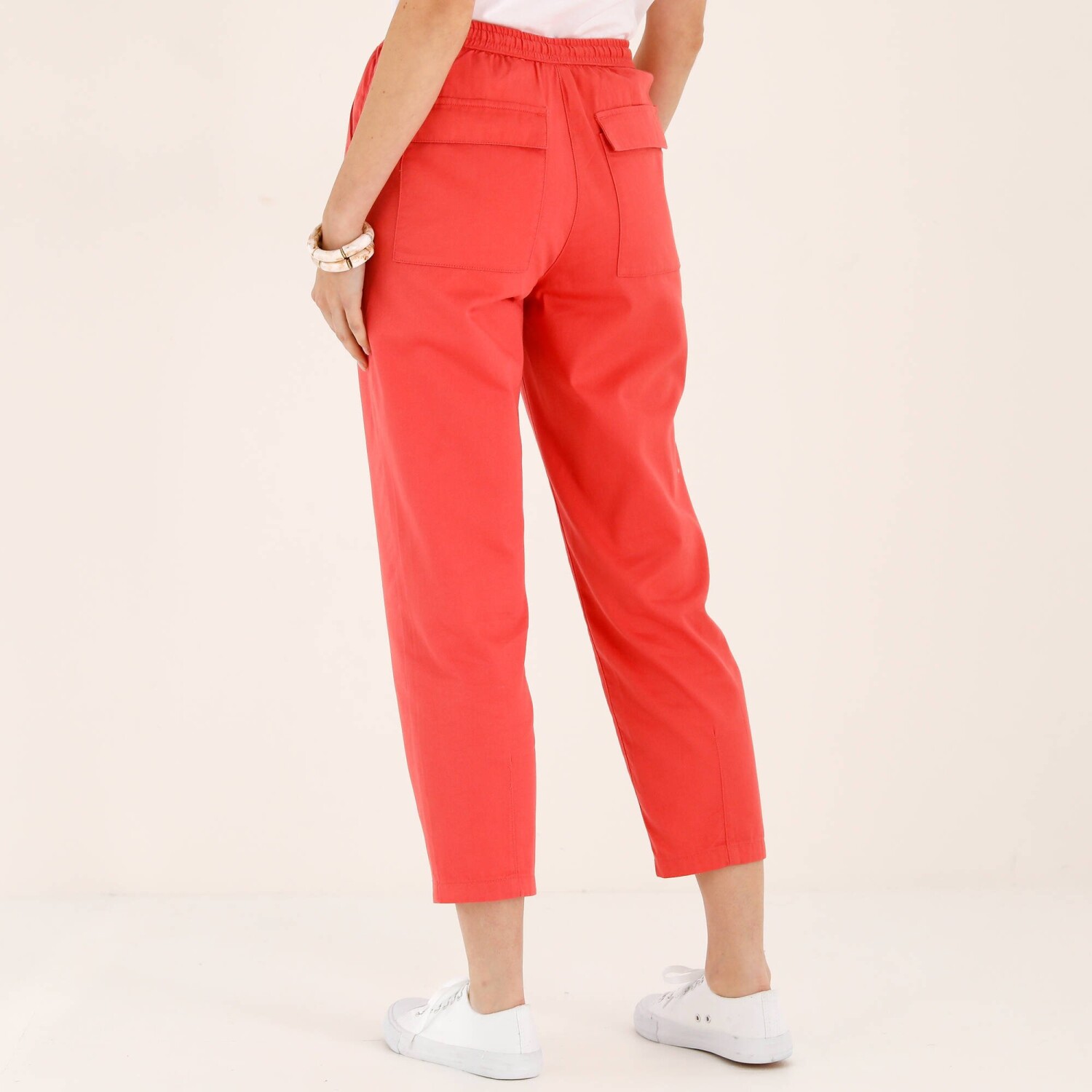 Co by to bylo za módní sezónu bez jednobarevných 7/8 kalhot? Běžná výška pasu. Střih mom. Tvarovaný pas s vnitřní pruženkou. V pase protažená šňůrka na zavázání. 2 klínové kapsy. 2 záševky na koncích nohavic. 2 našité kapsy s klopou vzadu. Certifikát Made In Green od OEKO-TEX®. Kromě ověření několika stovek chemických látek, které přispívají k vysoké bezpečnosti, toto označení zaručuje ohleduplné výrobní principy a kontrolované společenské postupy. Lze prát v pračce.