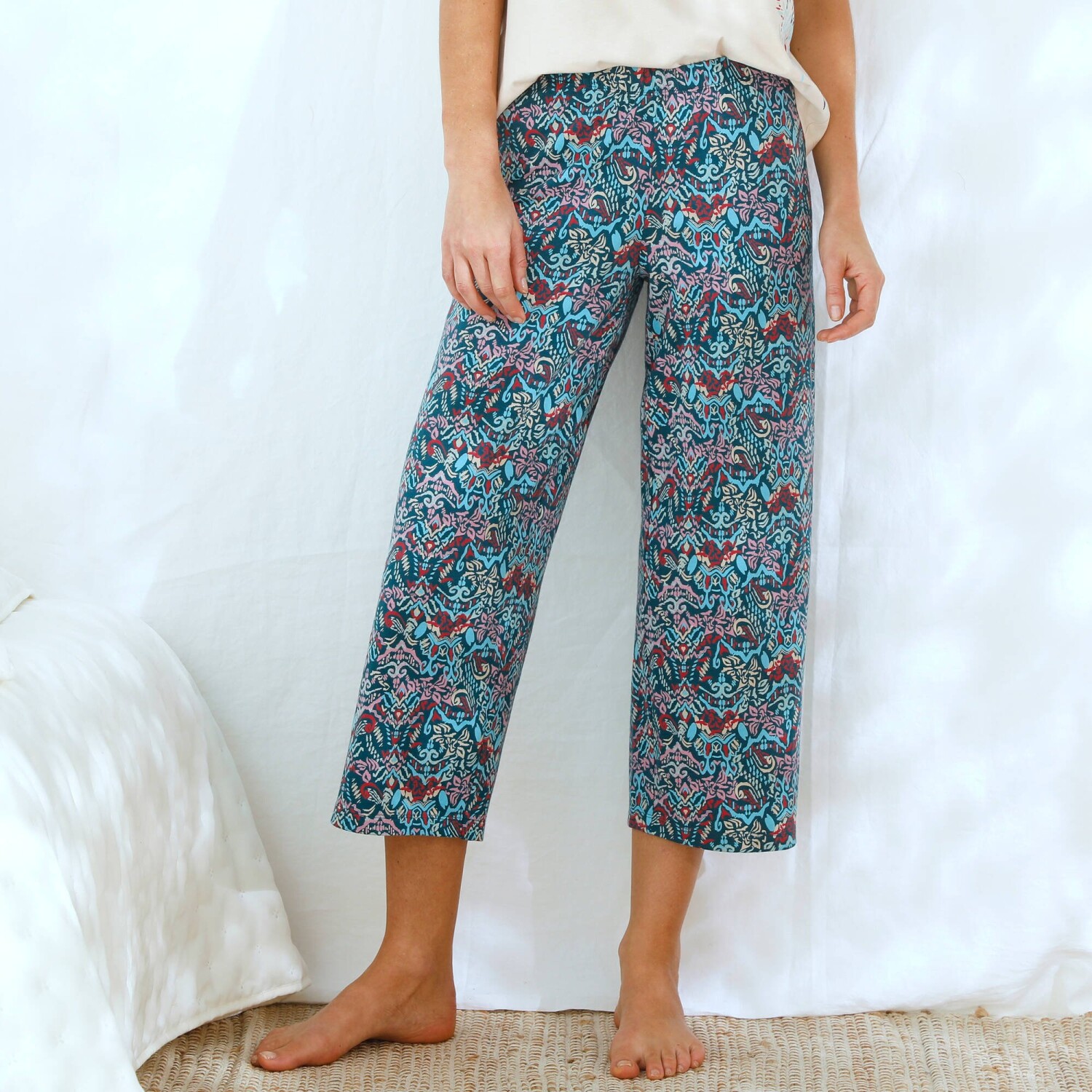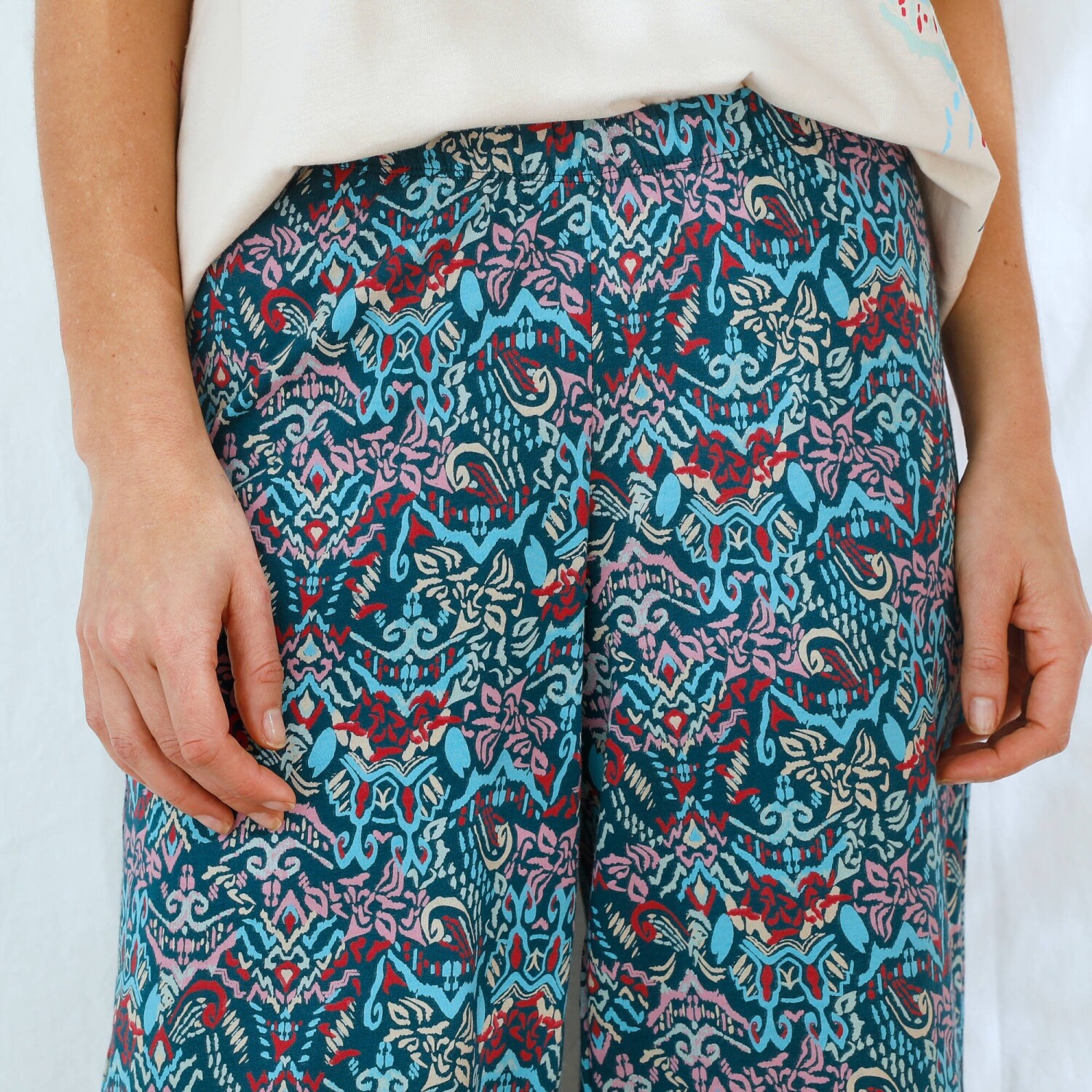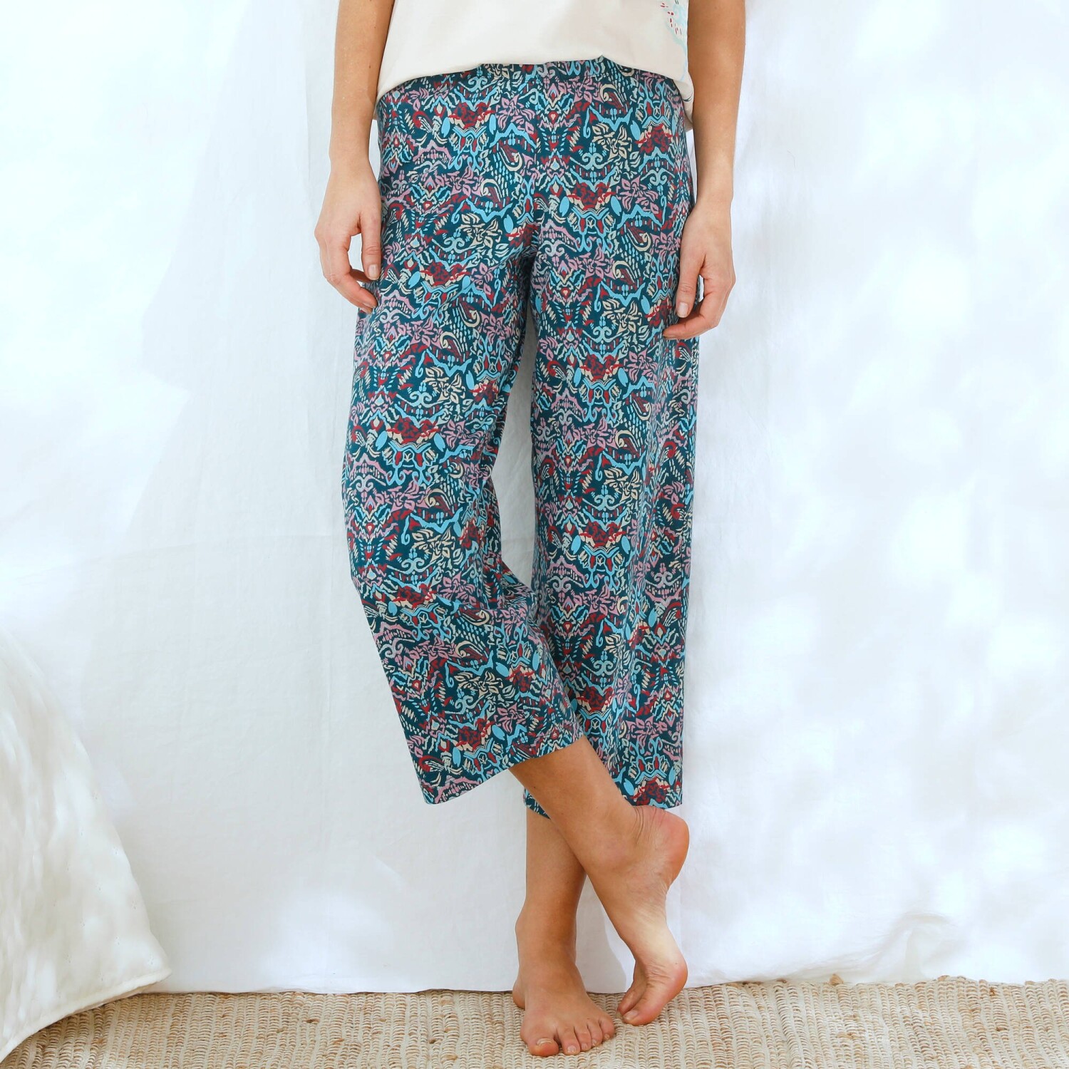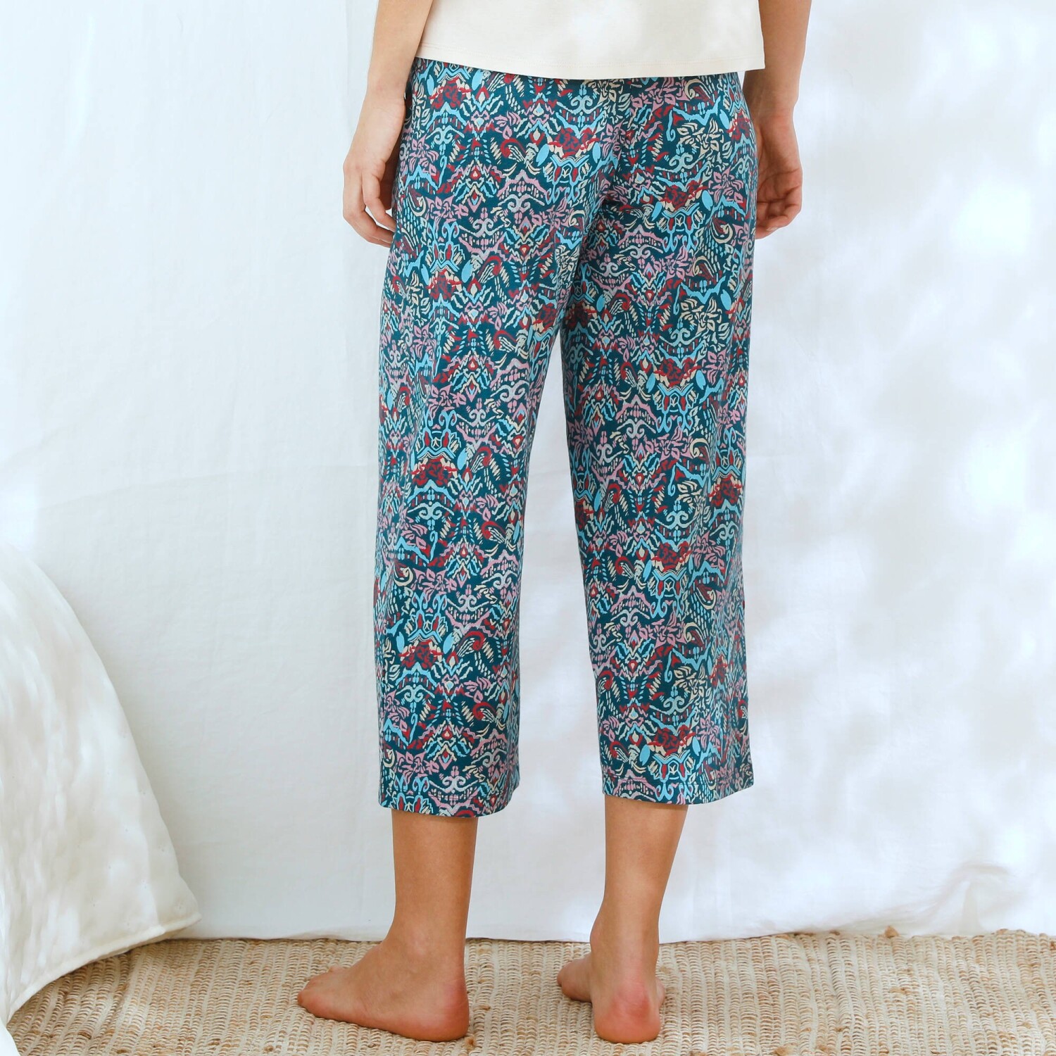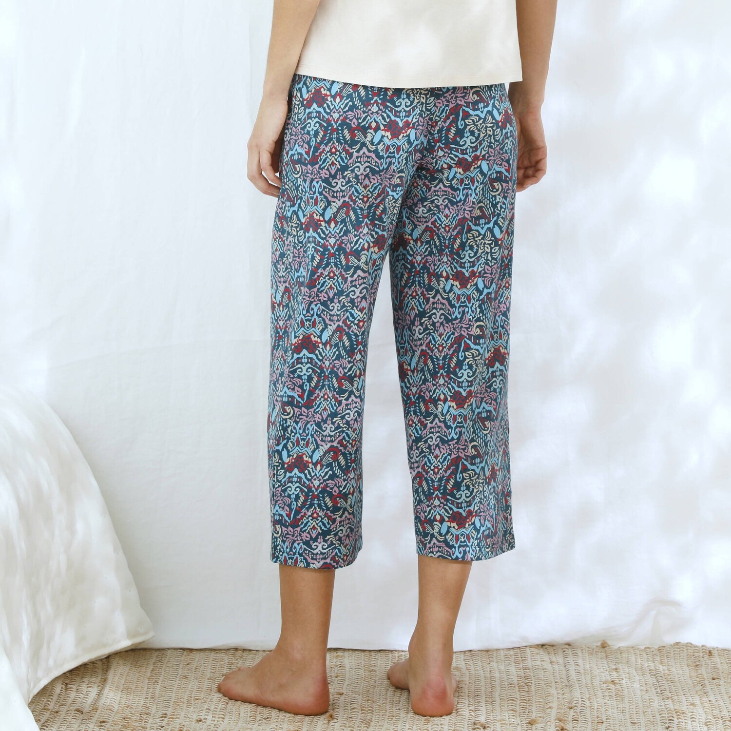 Jemnost, šarm a ženskost se snoubí v 7/8 pyžamových kalhotách s potiskem Ikat. Pružný pas. 7/8 délka. Široké nohavice. Celopotisk. Rovné zakončení. Standard 100 podle Oeko-Tex (n° CQ 1216 / 3 IFTH). Tato známka označuje textilní výrobky, které byly podrobeny laboratorním testům na široké spektrum škodlivých látek a výrobek je bezpečný nad rámec platných norem. Lze prát v pračce.