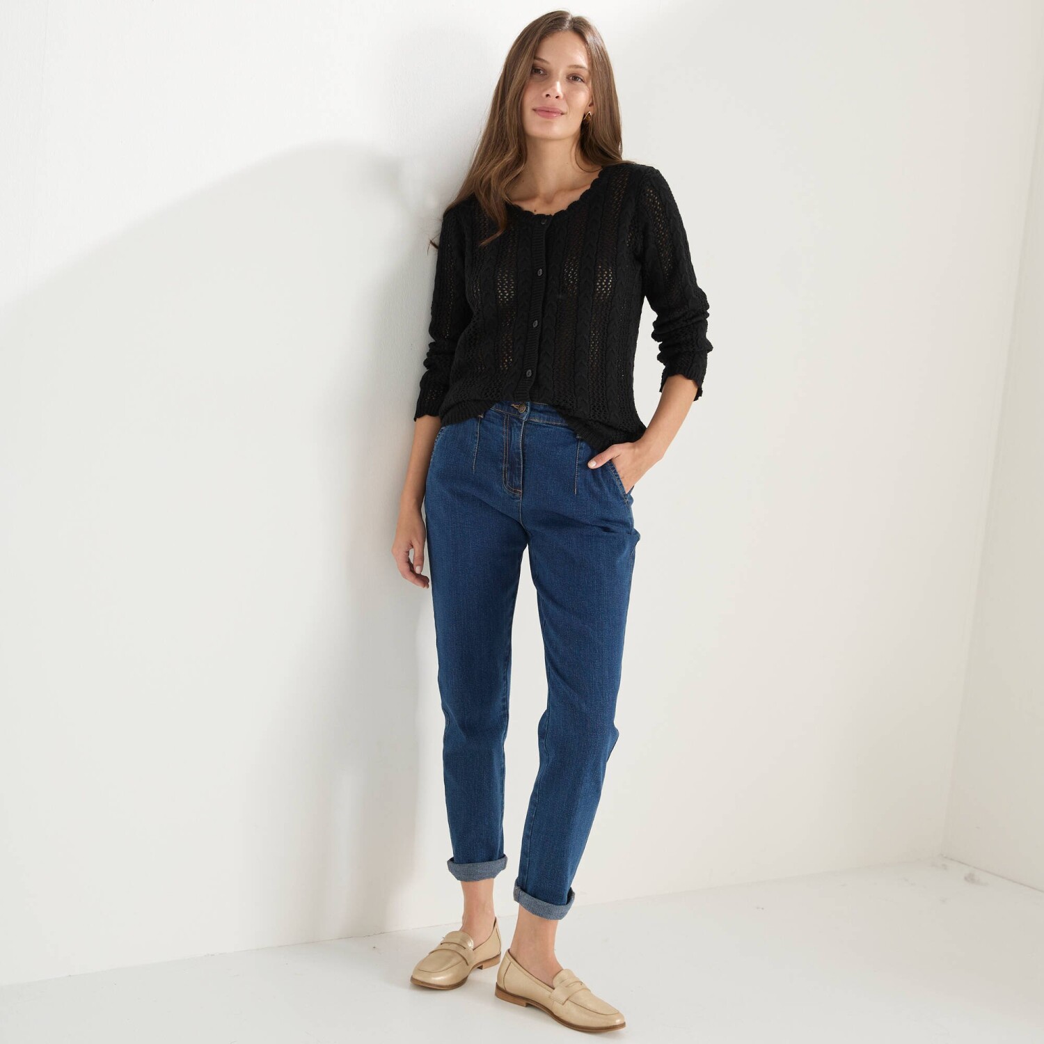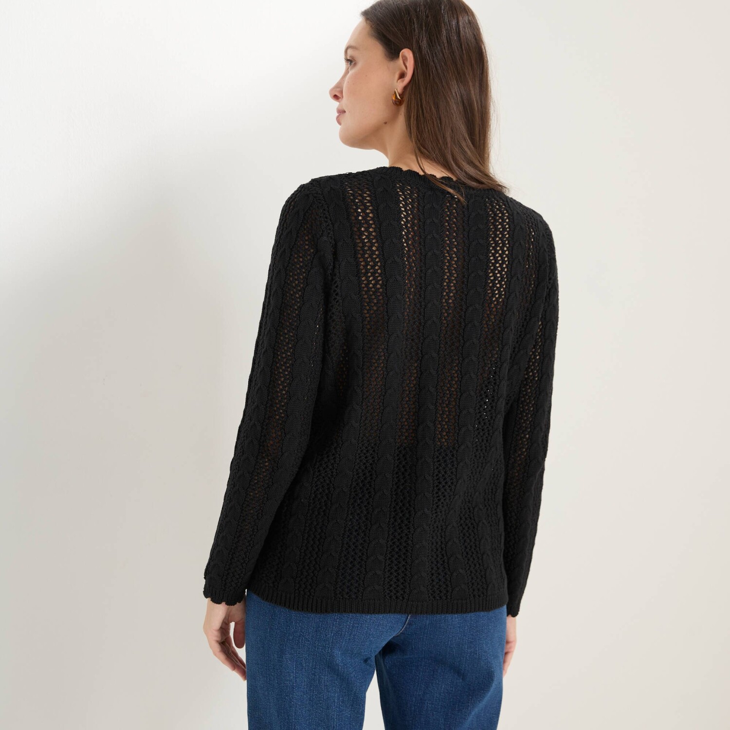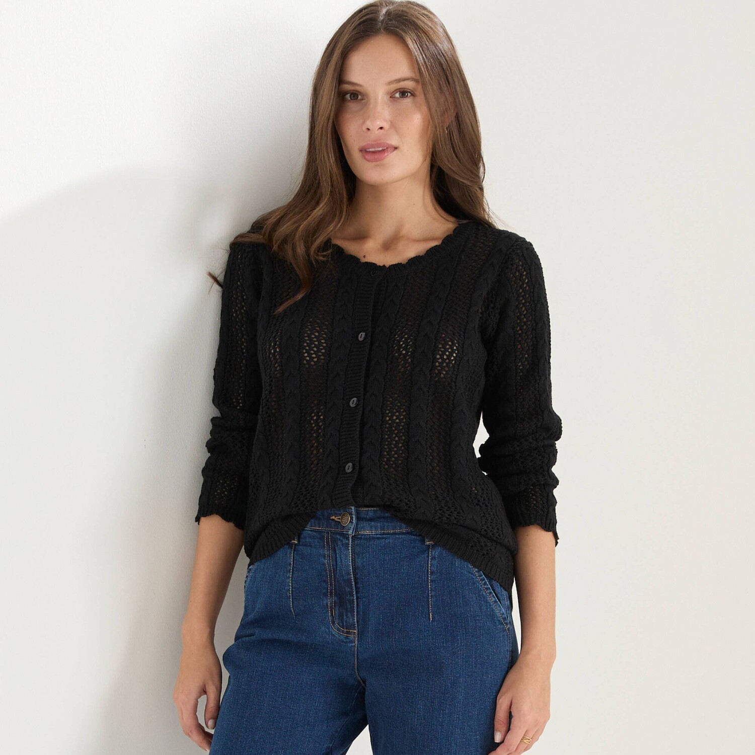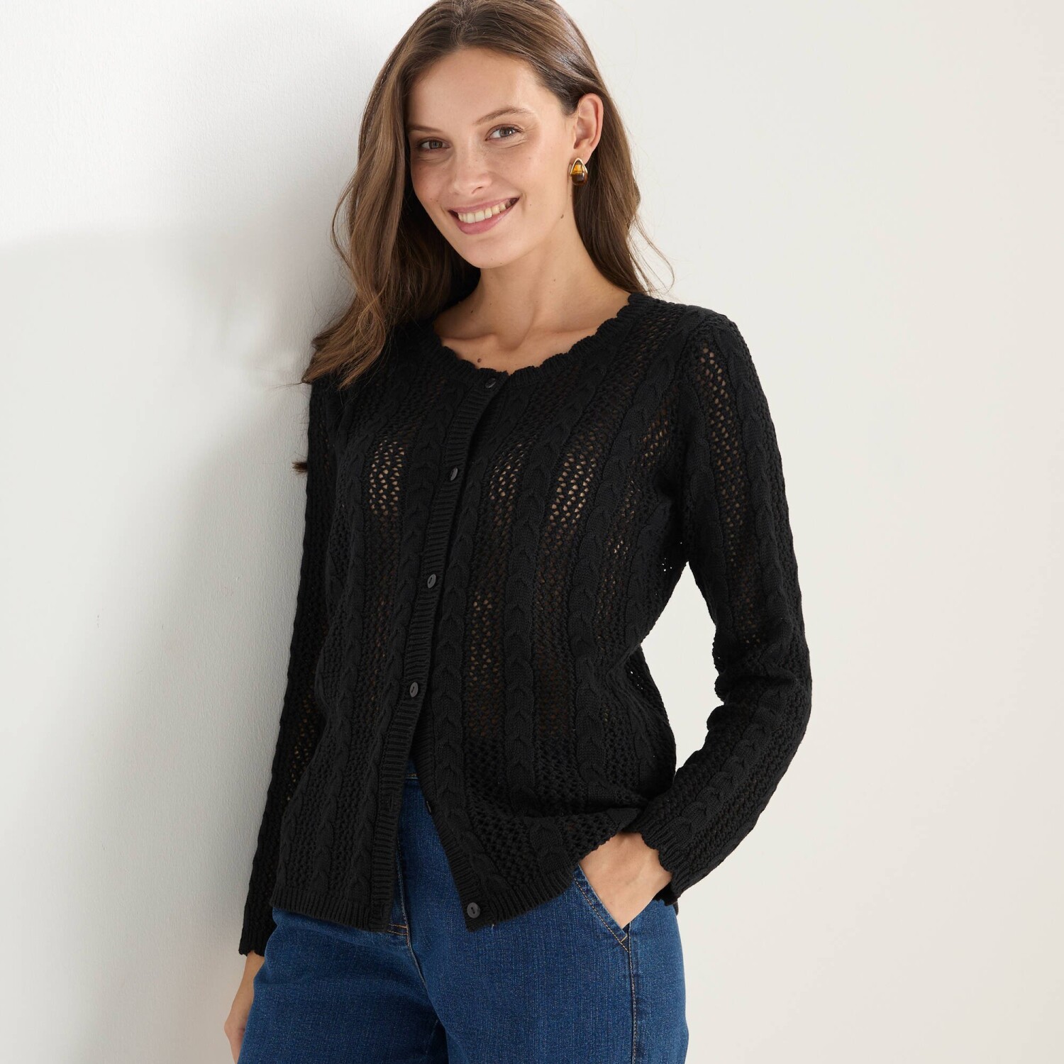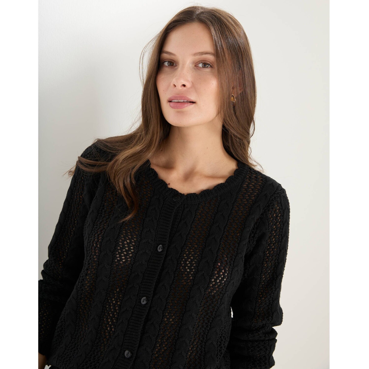 Propínací ažurový svetr boduje vlnkovaným zakončením a háčkovanými detaily v retro stylu. Copánkový a žurový vzor. Kulatý výstřih s vlnkovaným zakončením. Dlouhé rukávy se zvlněným zakončením. Vpředu knoflíková léga. Rovný, mírně zúžený dolní lem. Lze prát v pračce.