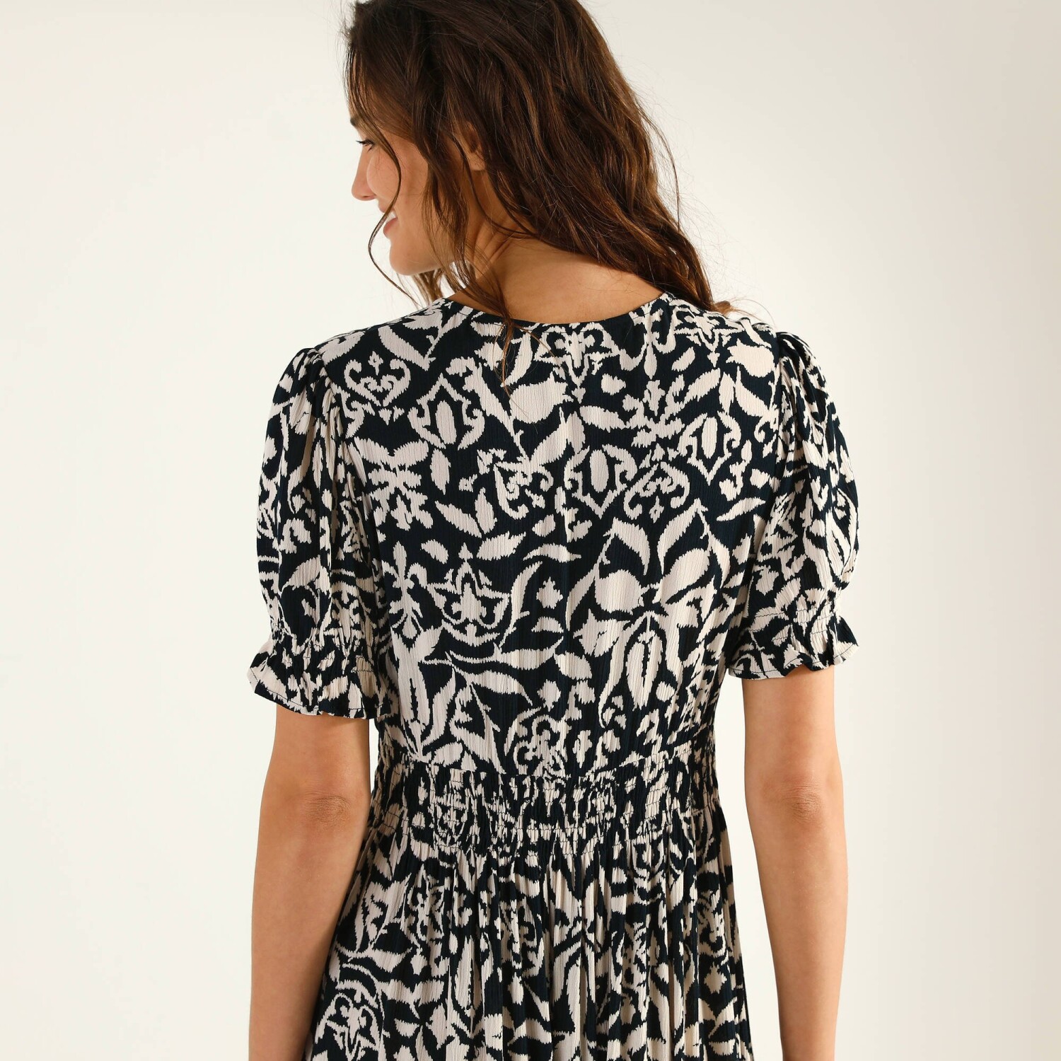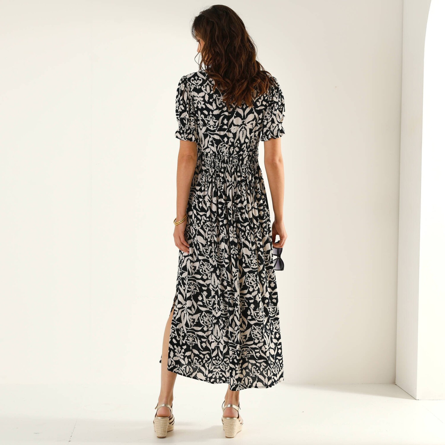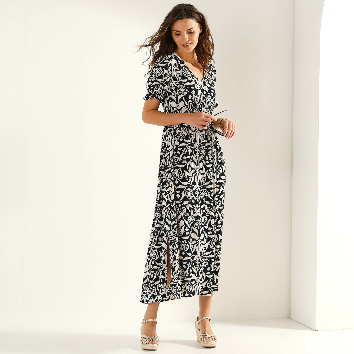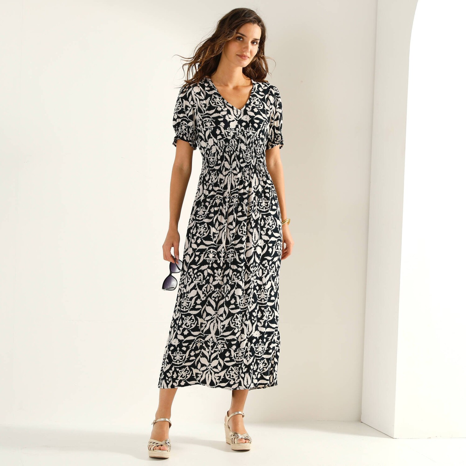 Dlouhé rozšířené šaty na knoflíky, kreponové s potiskem