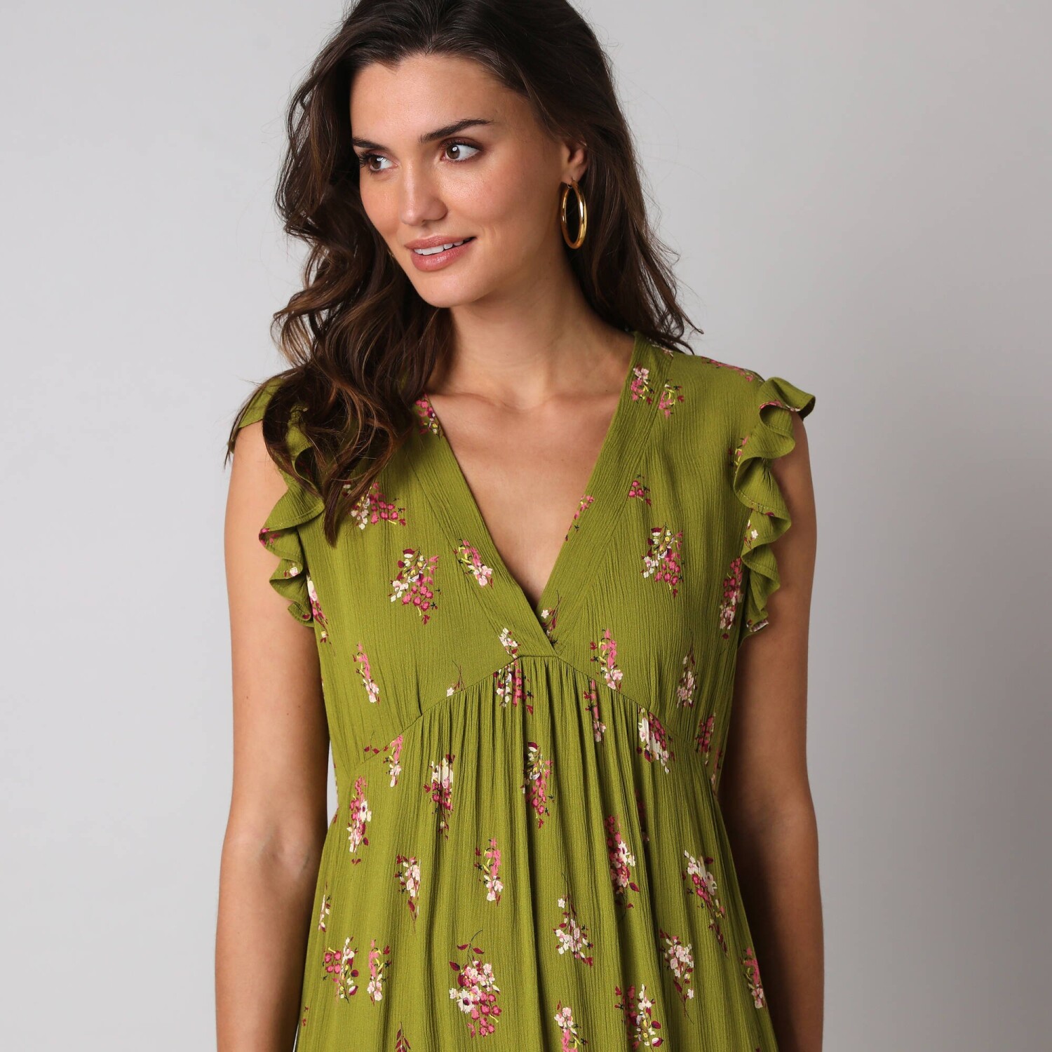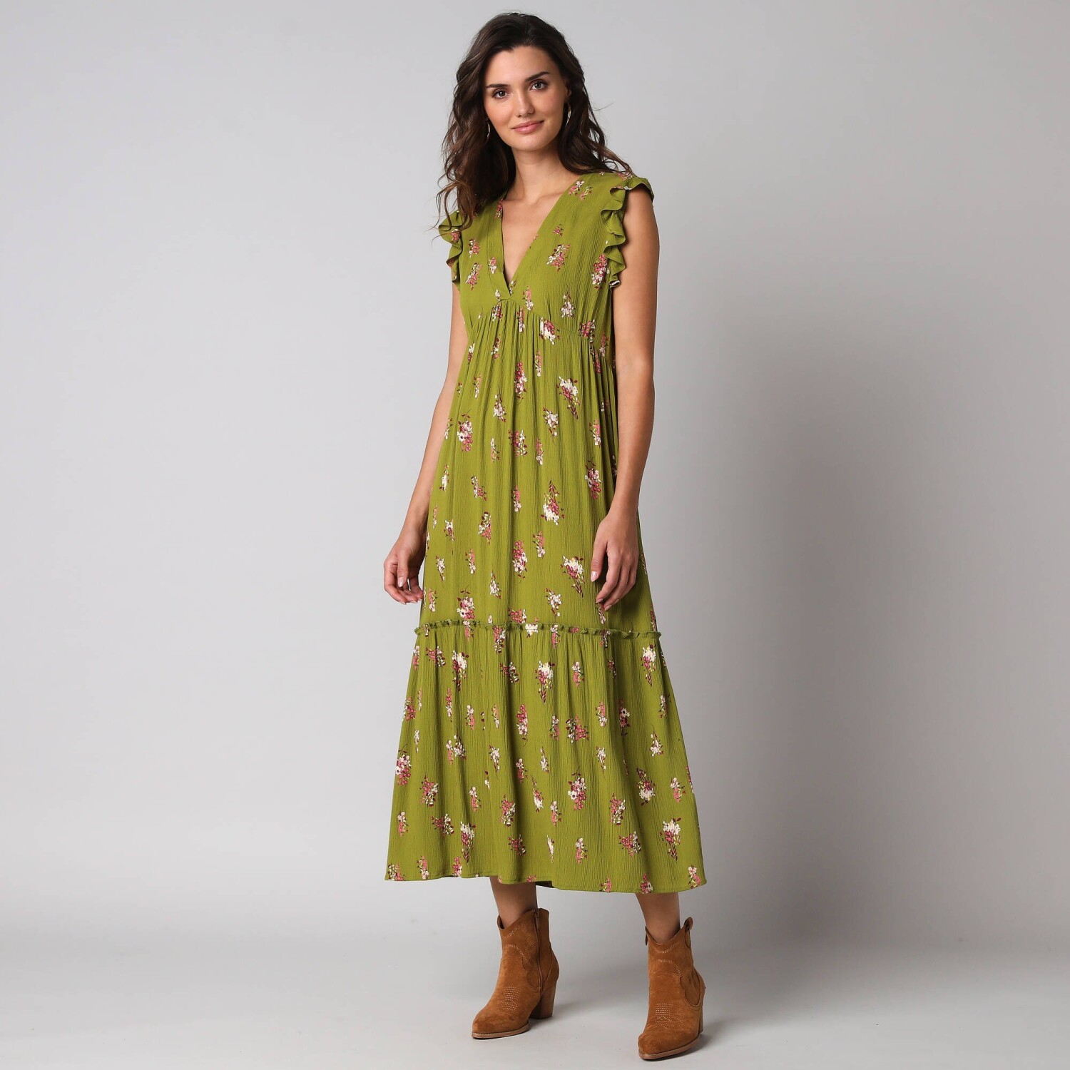 Dlouhé rozšířené šaty na knoflíky, kreponové s potiskem