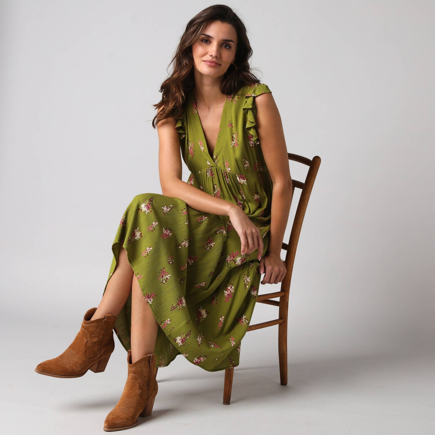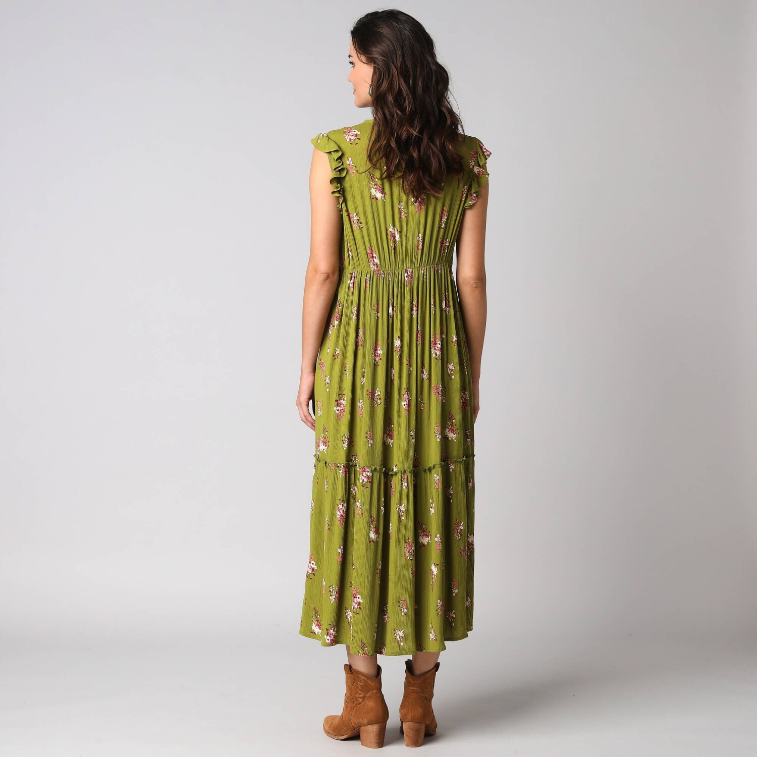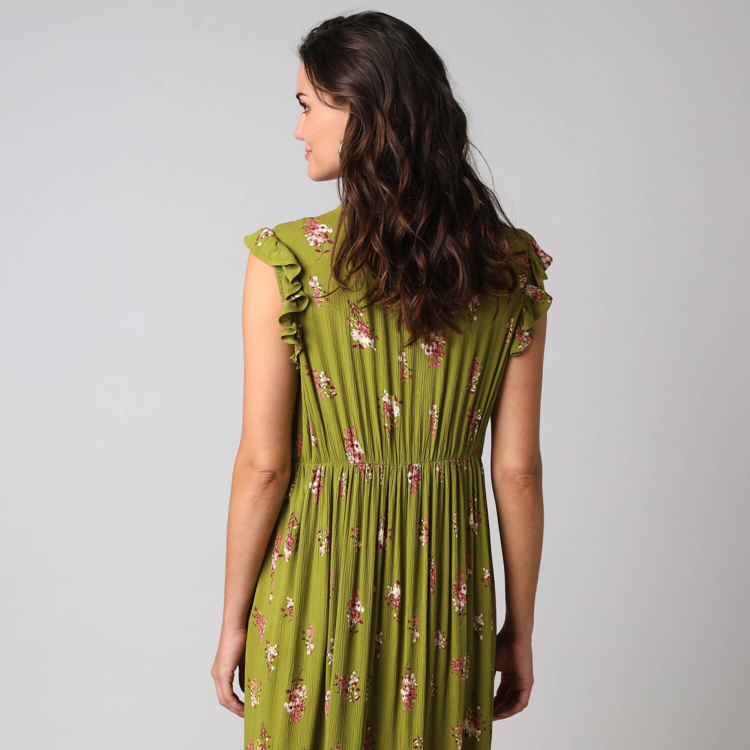 Jednobarevné dlouhé kreponové šaty na knoflíky, s dvoubarevným potiskem