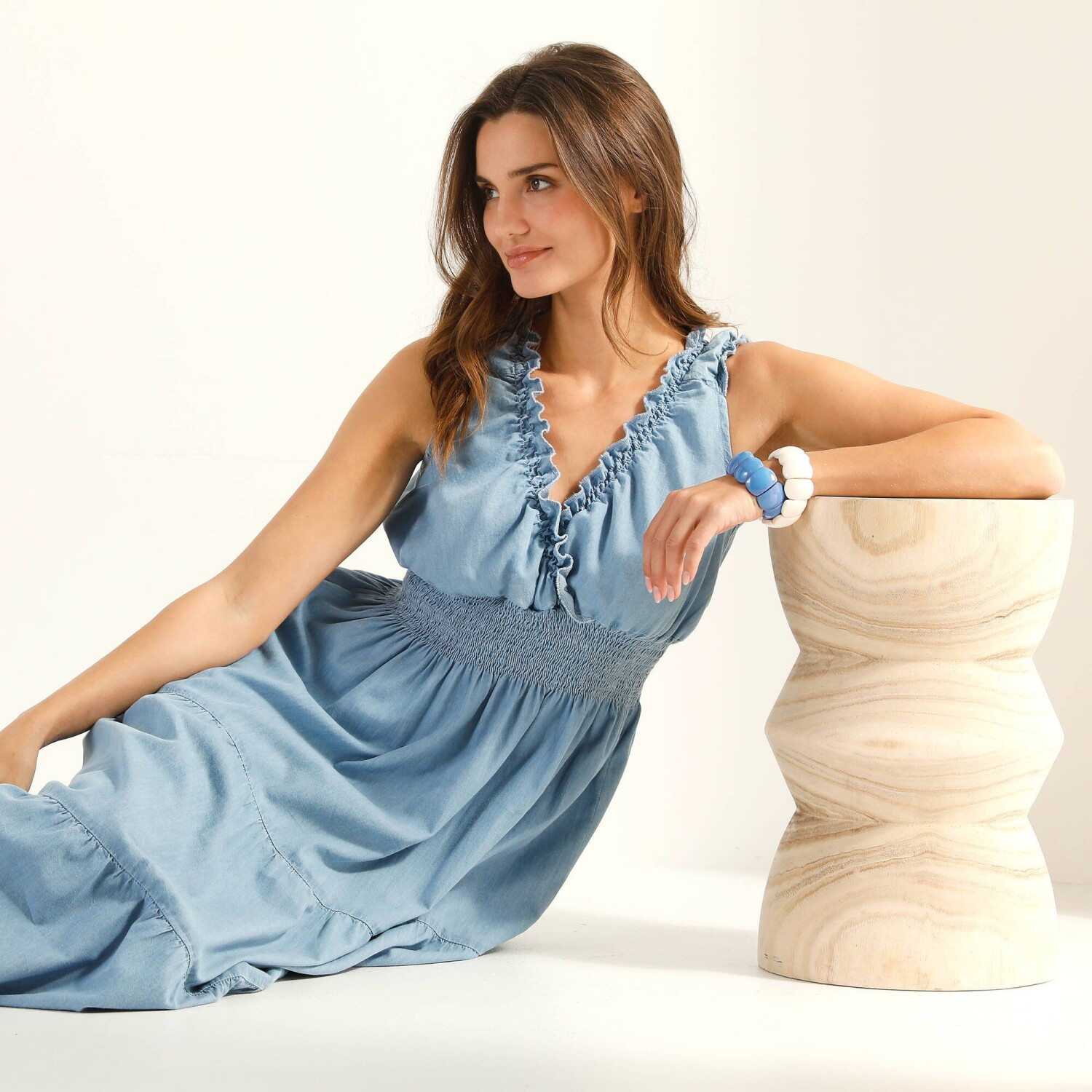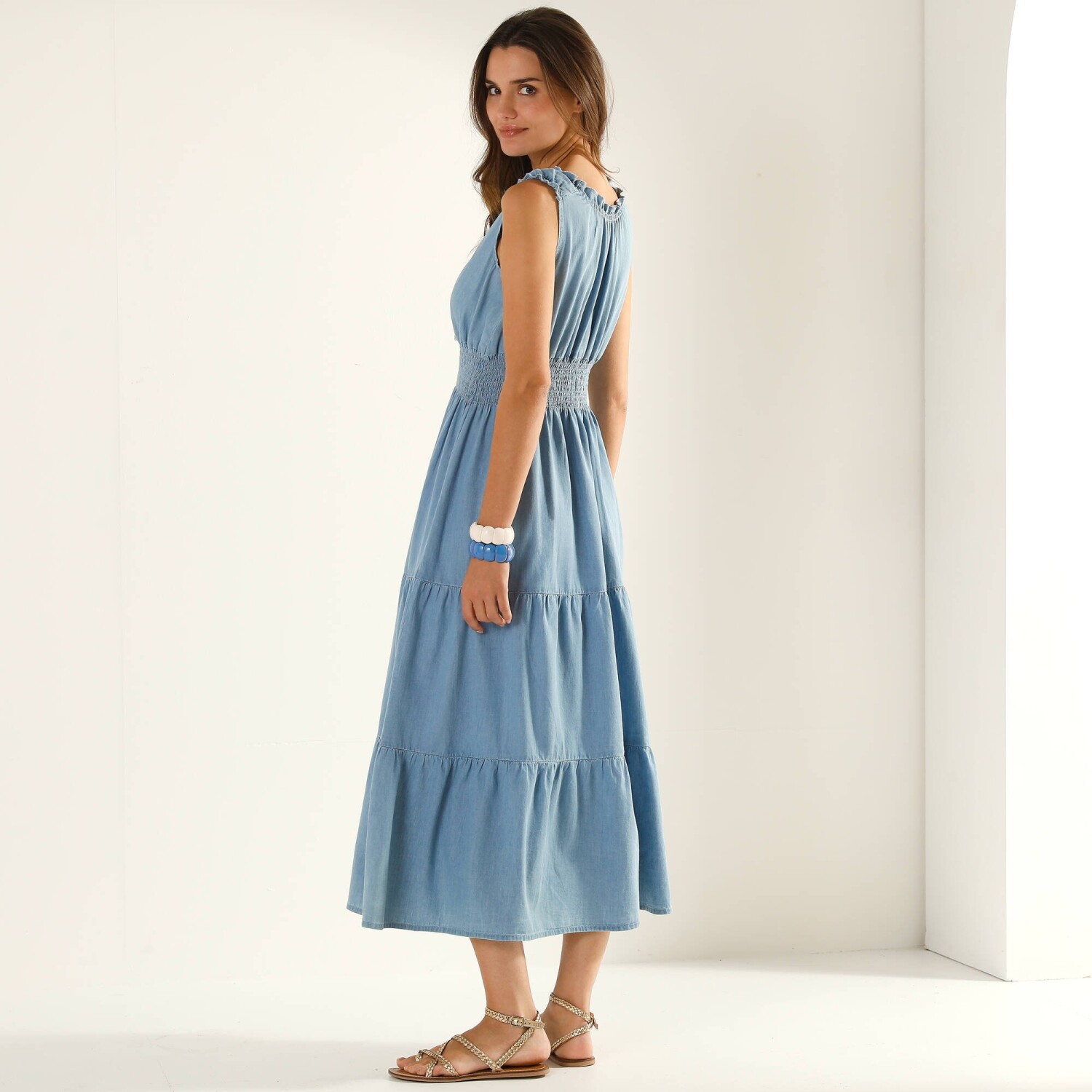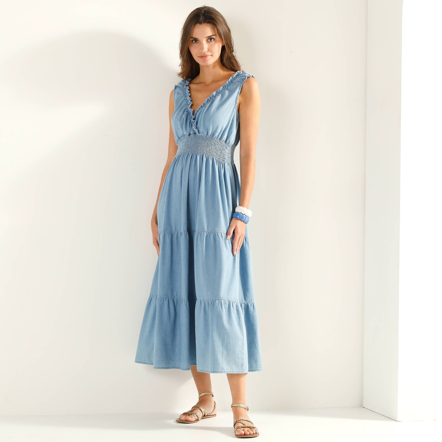Překřížený výstřih, rozšířený střih, žabičkovaný pas a volánové zdobení: dlouhé šaty nemají konkurenci. Lehká džínovina vhodná do horkého počasí. Výstřih do V. Pod prsy žabičkovaný pruh. Krátké pružné rukávy s volánem. 3 volány pod pasem. Délka ke kotníkům. Lze prát v pračce.