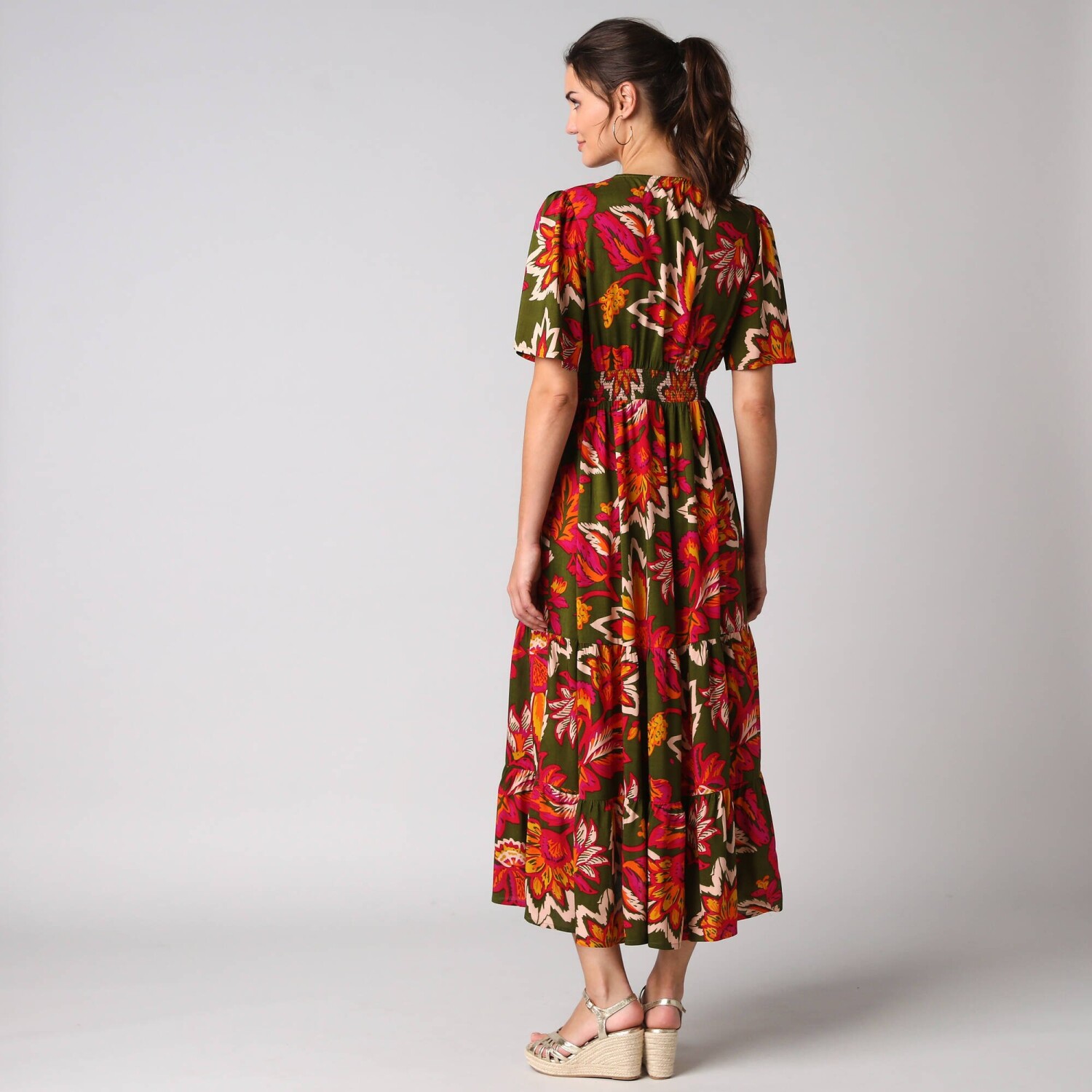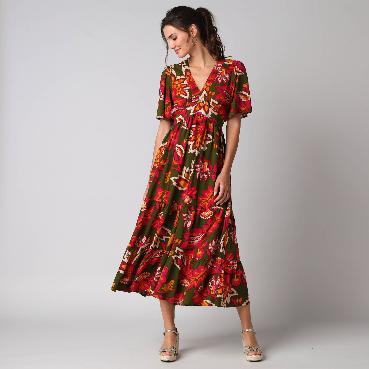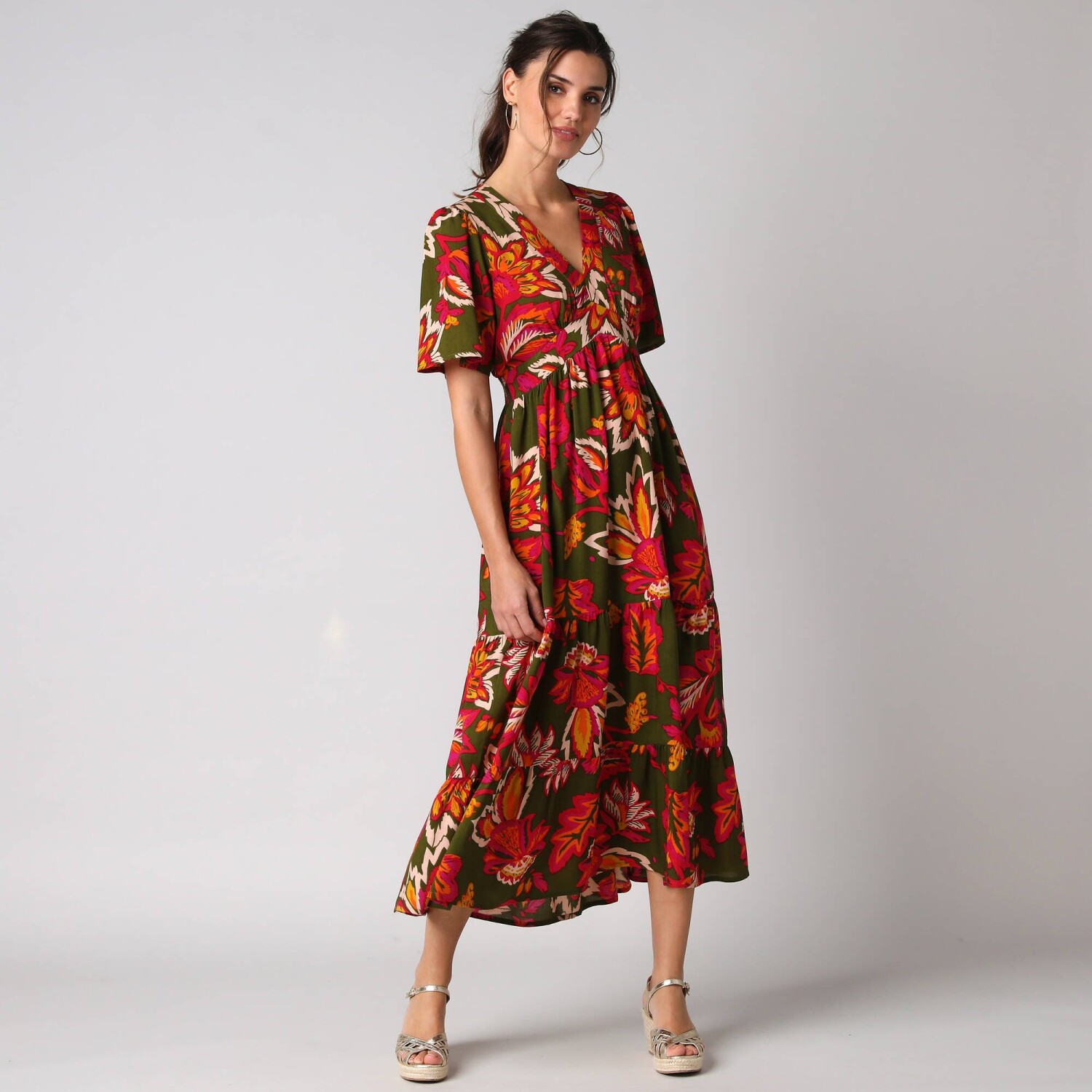 Dlouhé rozšířené šaty na knoflíky, kreponové s potiskem