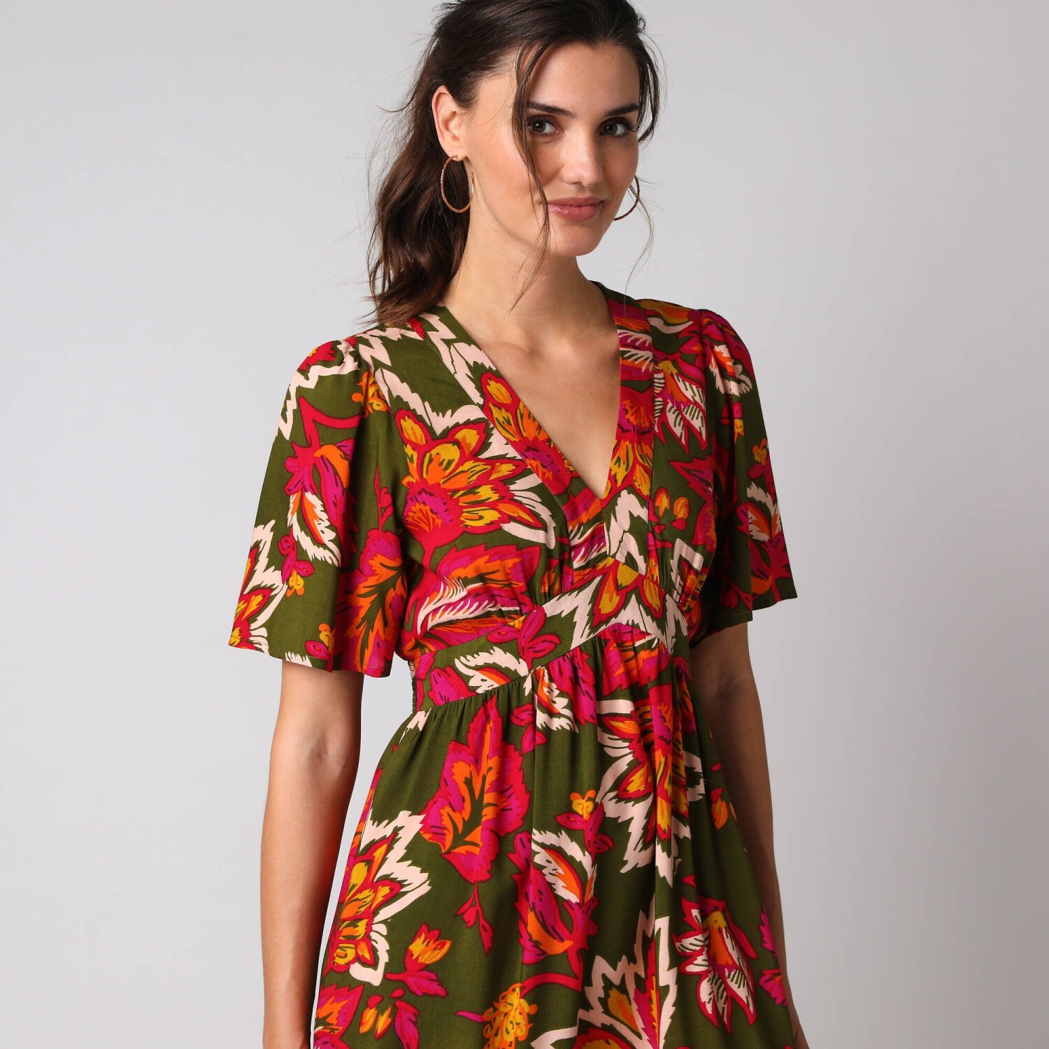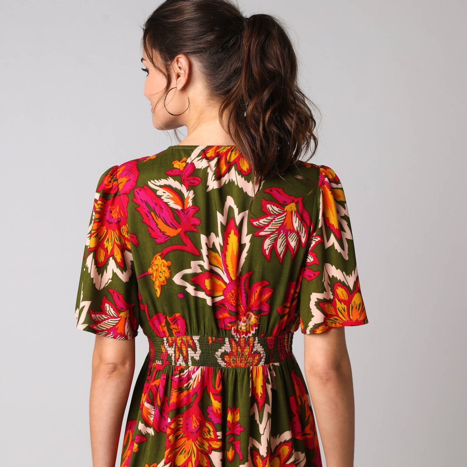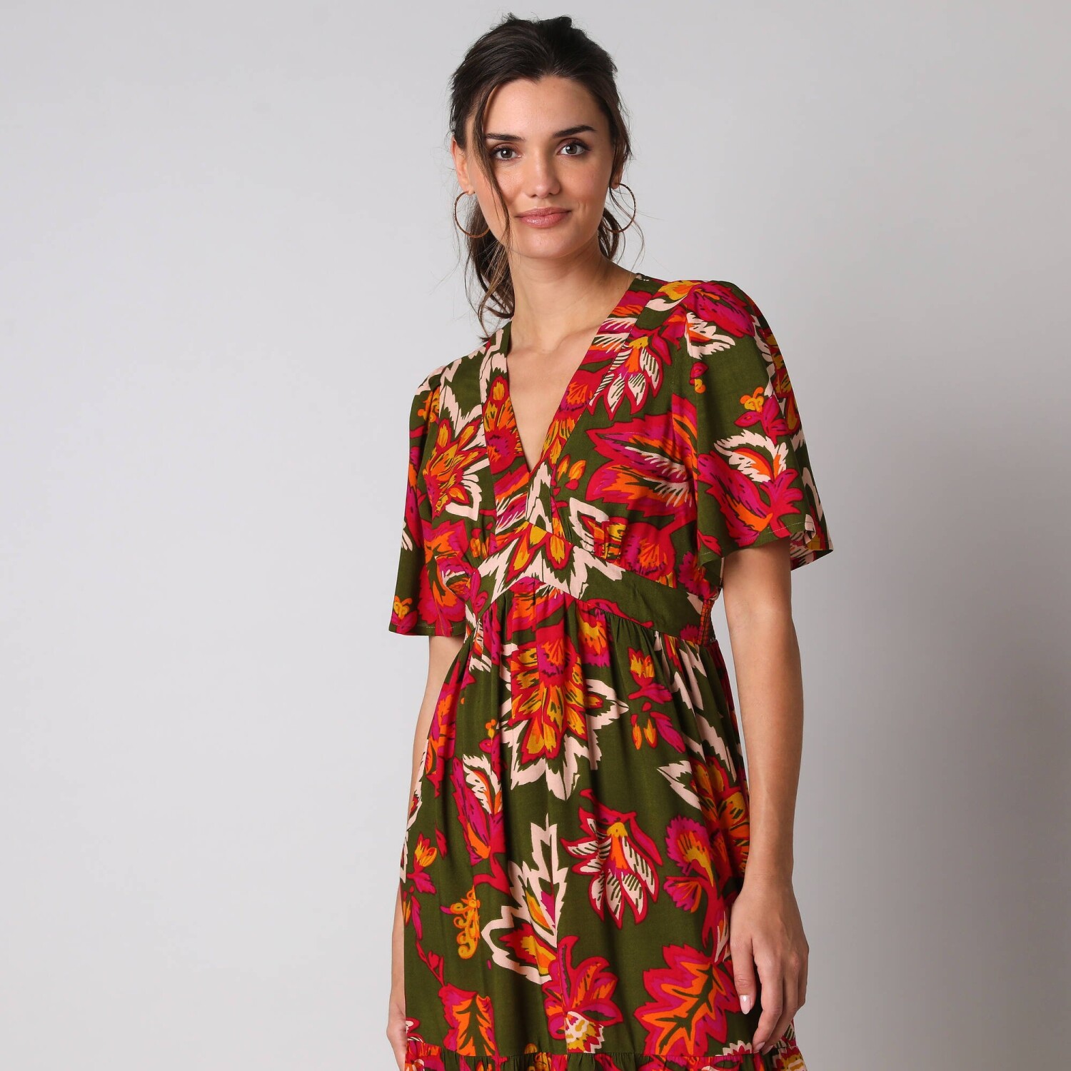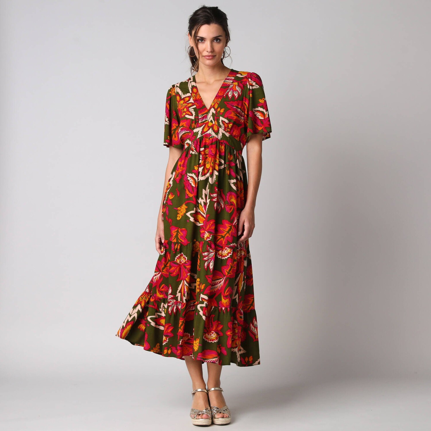 Dlouhé rozšířené šaty na knoflíky, kreponové s potiskem