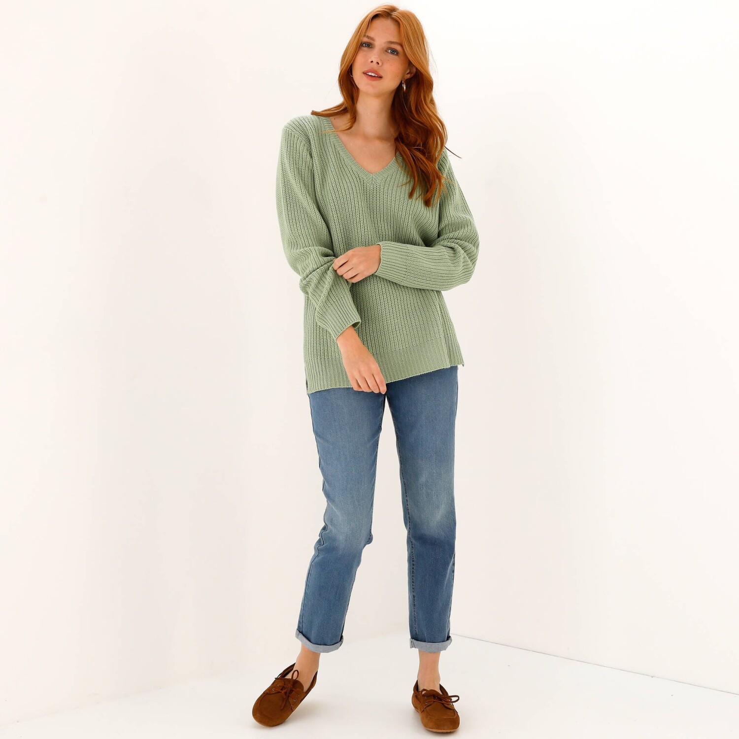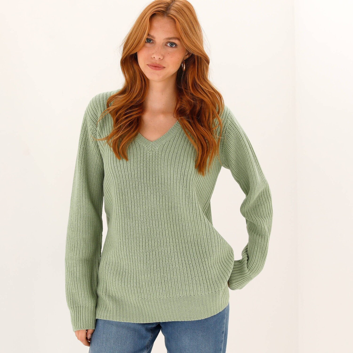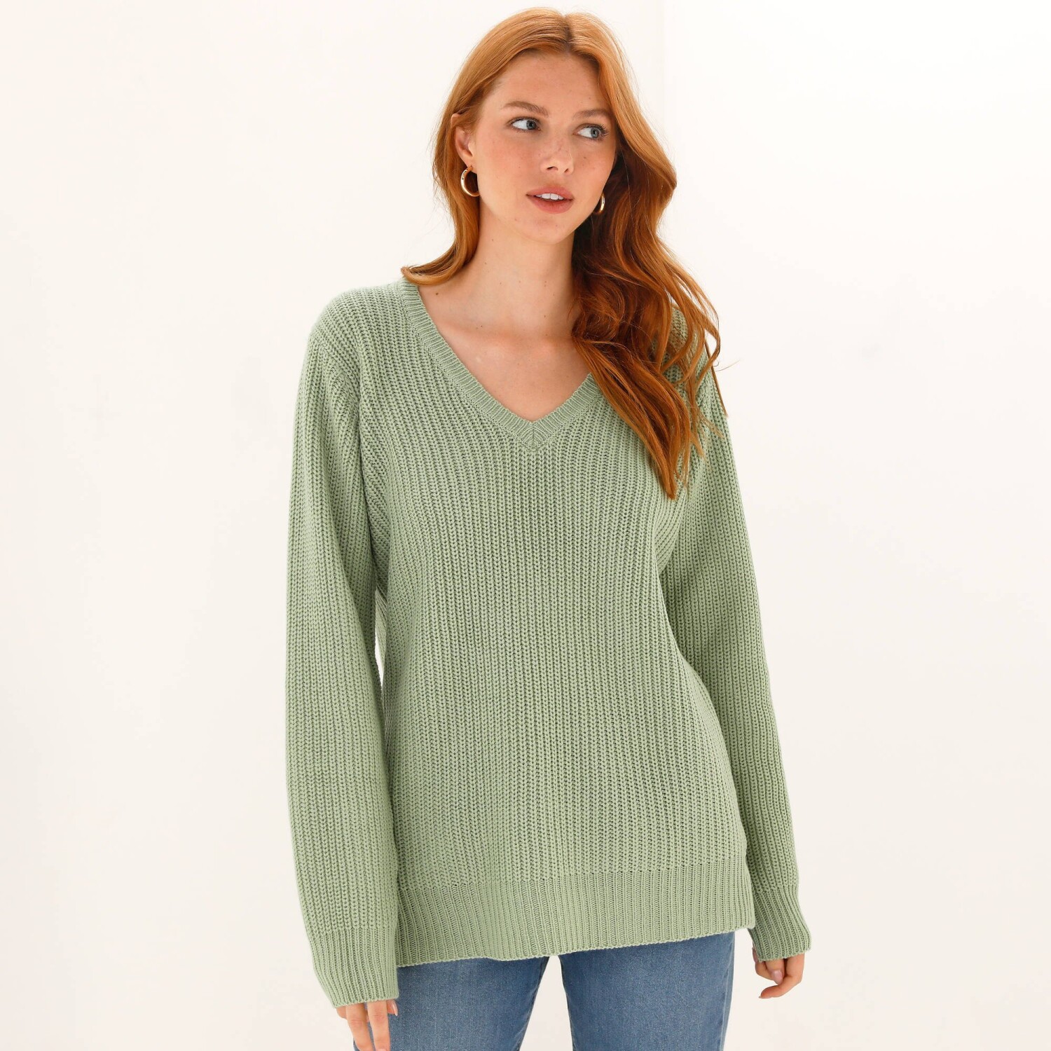 Dlouhý pulovr s výstřihem do V a hladkým vzorem