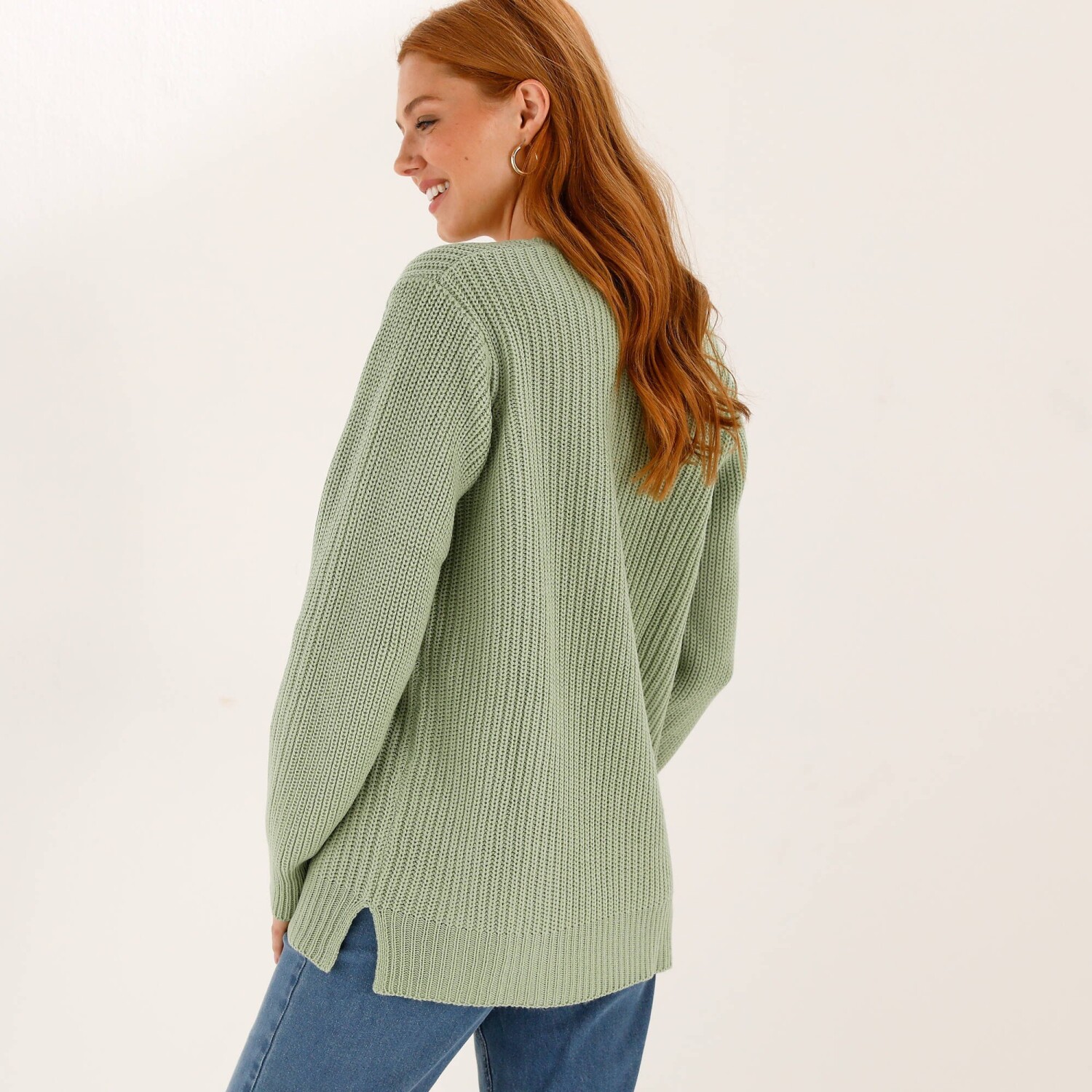 V lichotivém dlouhém střihu z příjemného akrylu, tento pulovr zahřeje v chladnějších dnech. Měkký hladký vzor. Snadná údržba. Výstřih do "V". Dlouhé rukávy. Dlouhá komfortní délka. Rovný dolní lem, Boční rozparky. Perte na 30 °C.