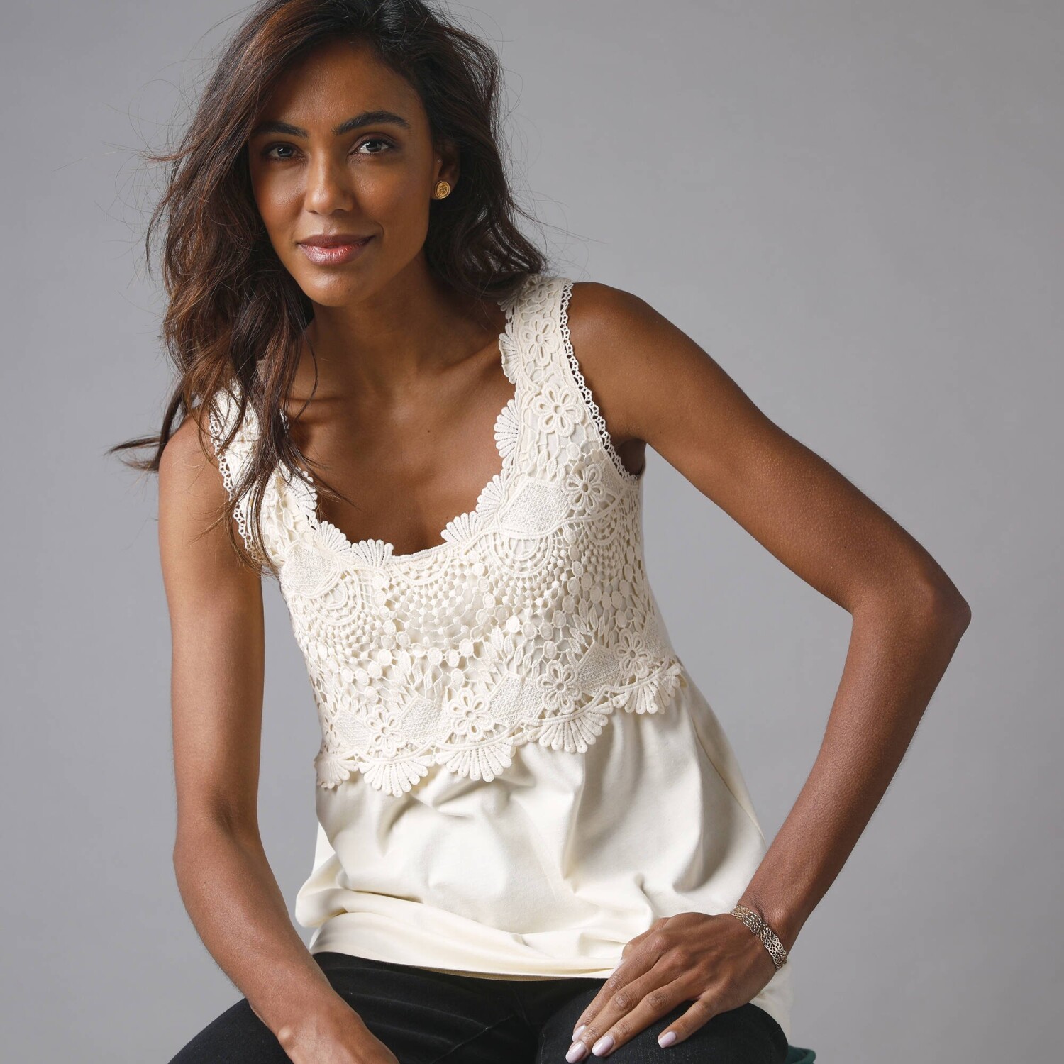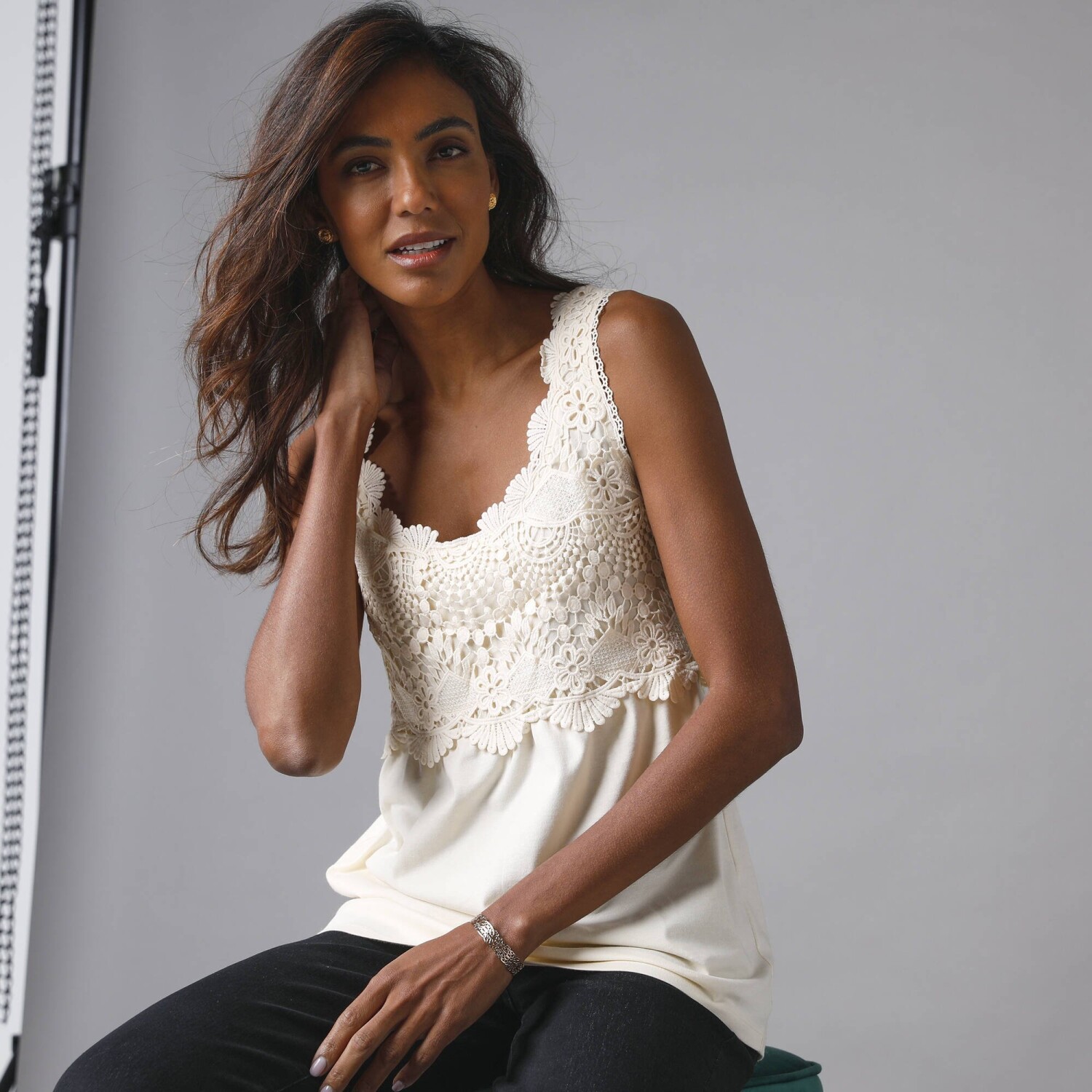Přímým zásahem do srdce bude dlouhý top s dotekem macramé, který je navržený se směsi bavlny/ viskózy. Zakulacený výstřih s macramé náprsenkou. Vpředu a vzadu vsadka s nařasením. V perfektní délce, která dá sbohem komplexům. Rovný dolní lem. Standard 100 podle Oeko-Tex (n° CQ 1216 / 3 IFTH). Tato známka označuje textilní výrobky, které byly podrobeny laboratorním testům na široké spektrum škodlivých látek a výrobek je bezpečný nad rámec platných norem. Lze prát v pračce.