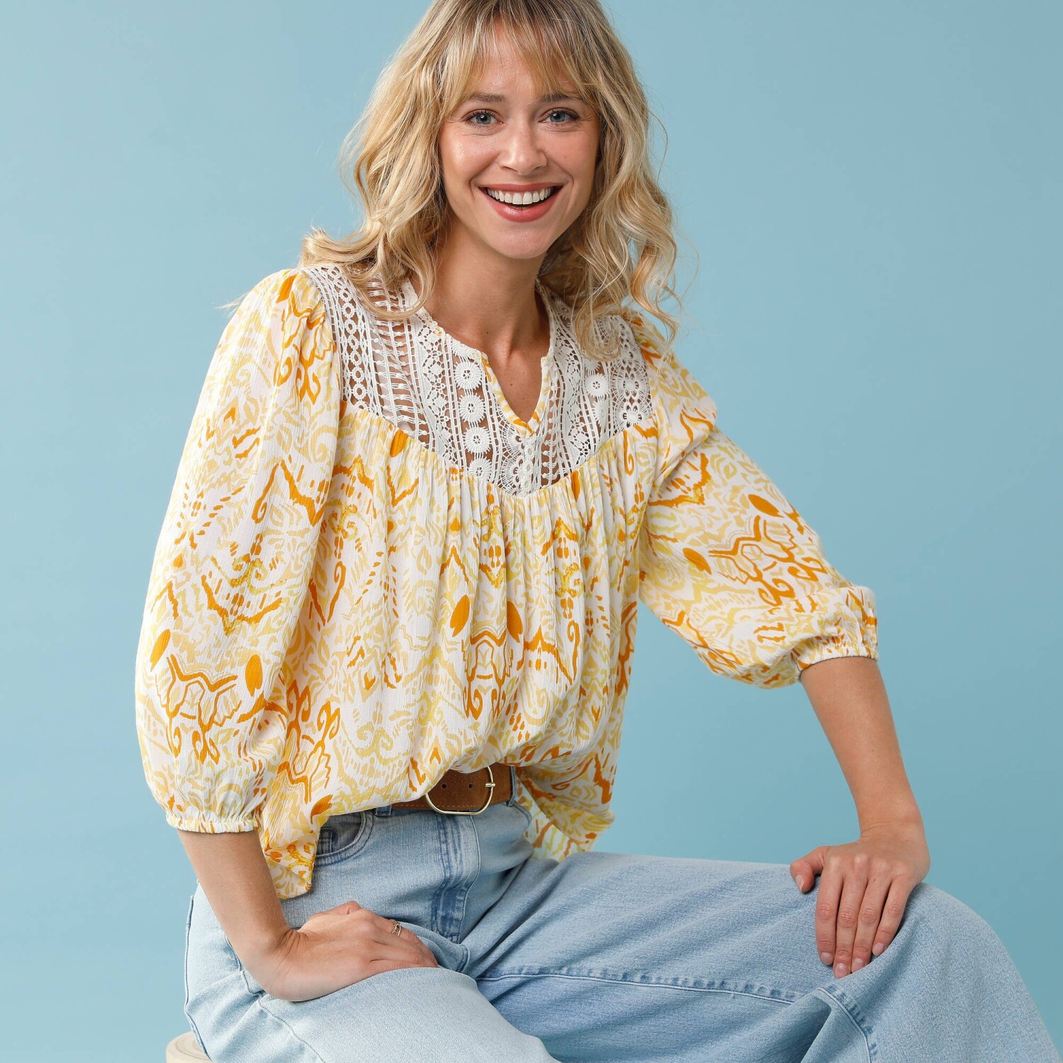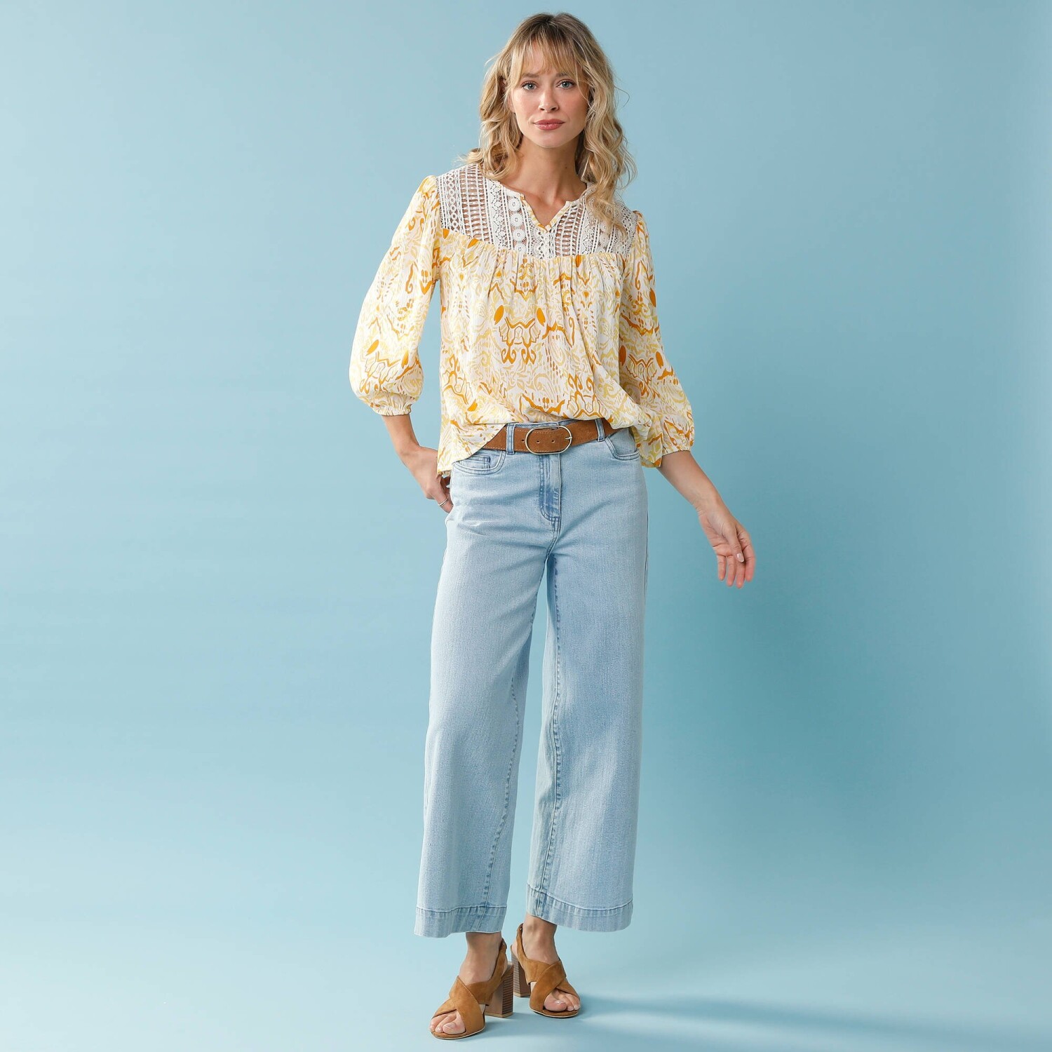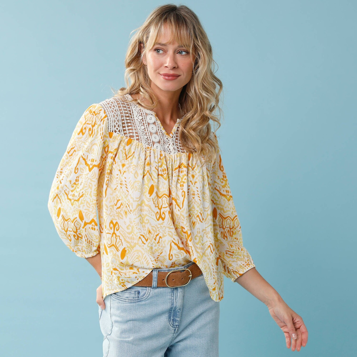 Jednobarevná halenka s krátkými rukávy a macramé proužky