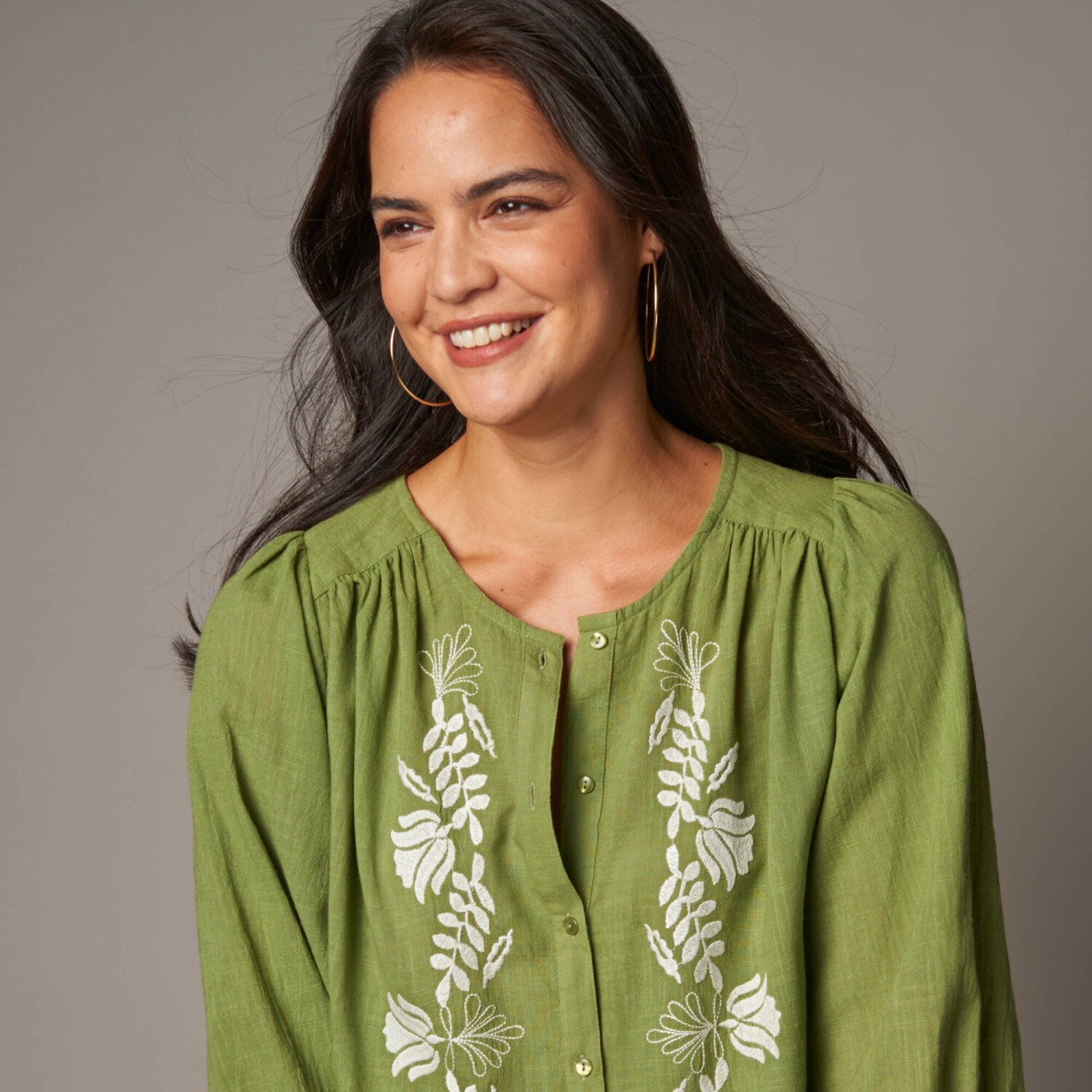 Boho módní styl se nosí i tuto sezónu. Nenechte si tedy uniknout halenku s výšivkou. Kulatý výstřih. Vpředu kontrastní výšivka. 3/4 široké halenkové rukávy. Pružné manžety. Vpředu a vzadu nařasená vsadka v ramenou. V ramenou nařasení. Vpředu perleťové knoflíčky. Rovný dolní lem. Lze prát v pračce.