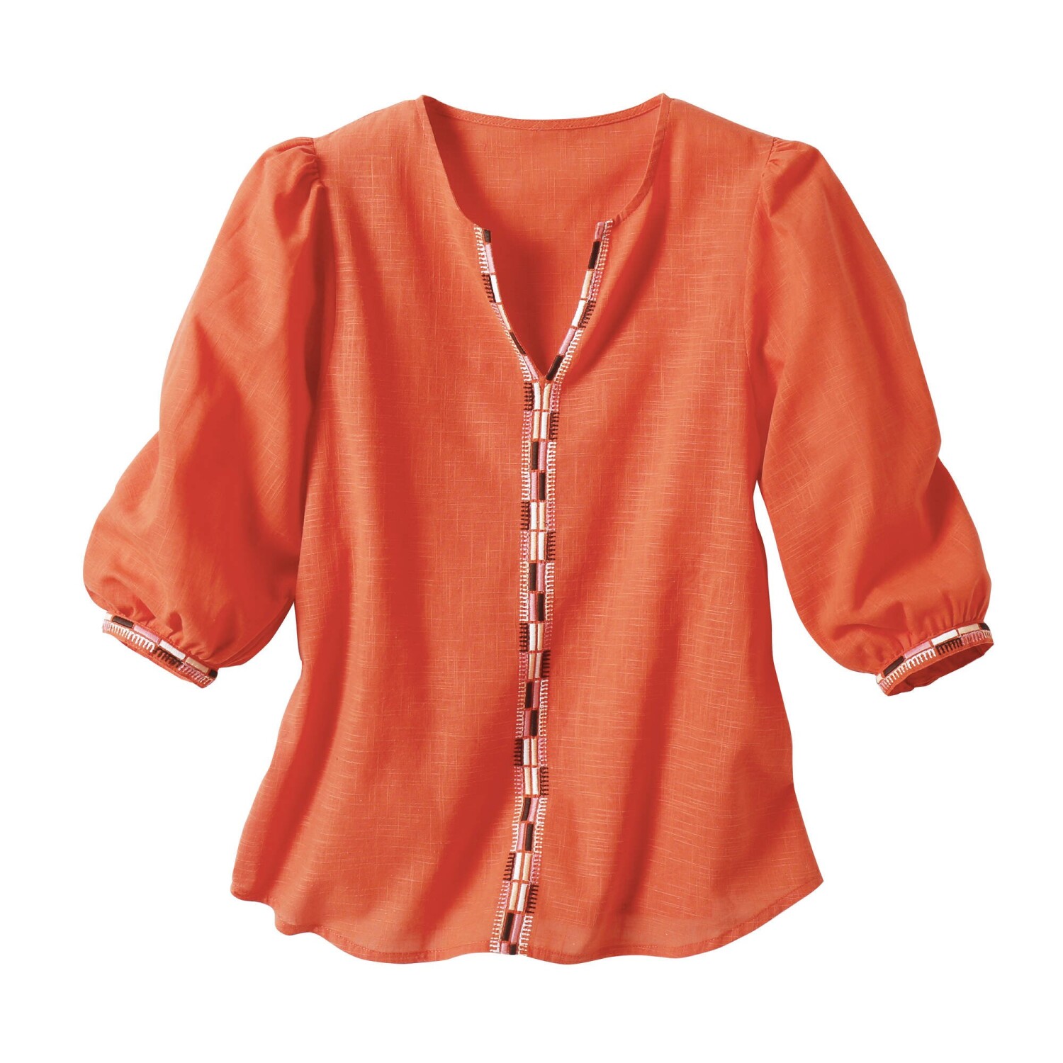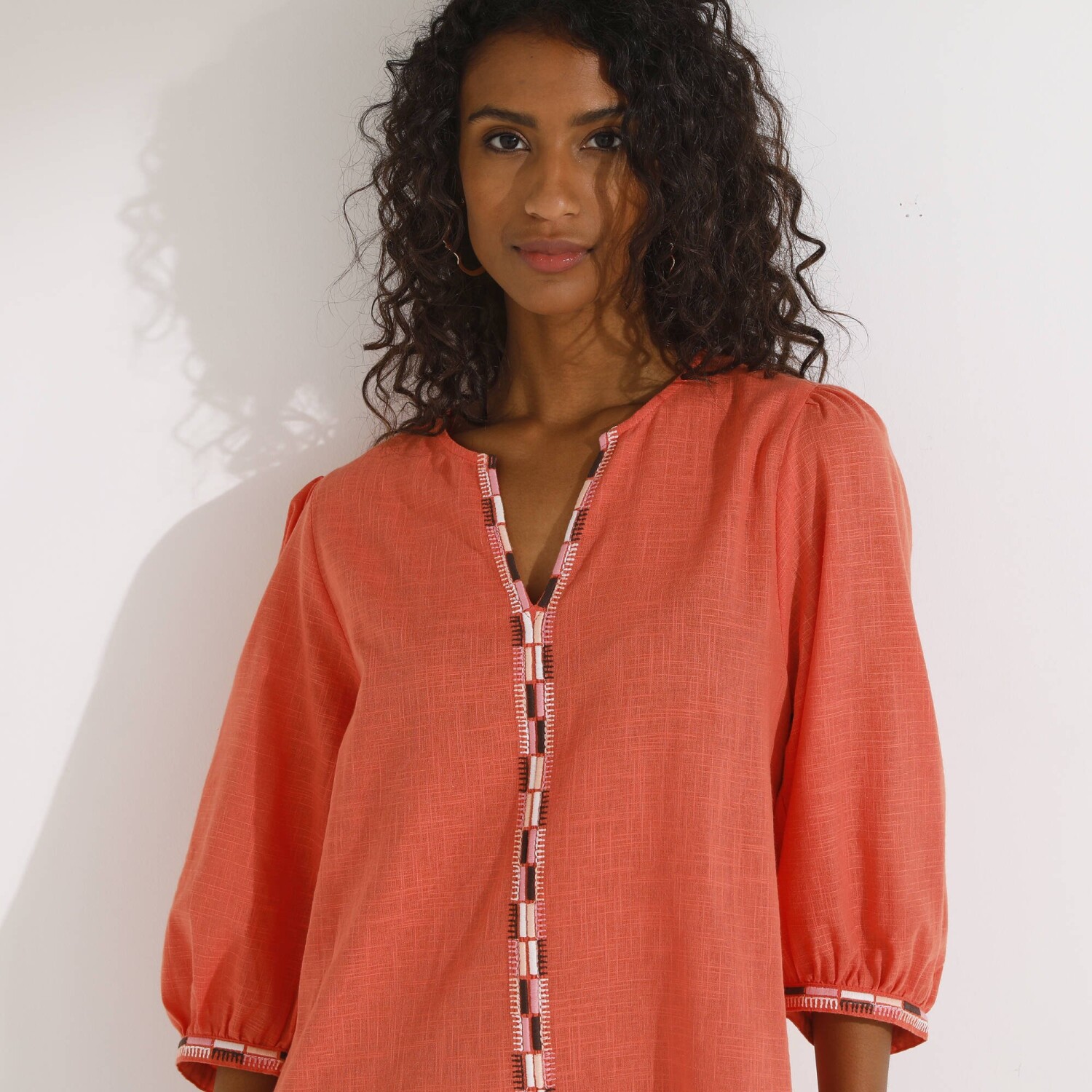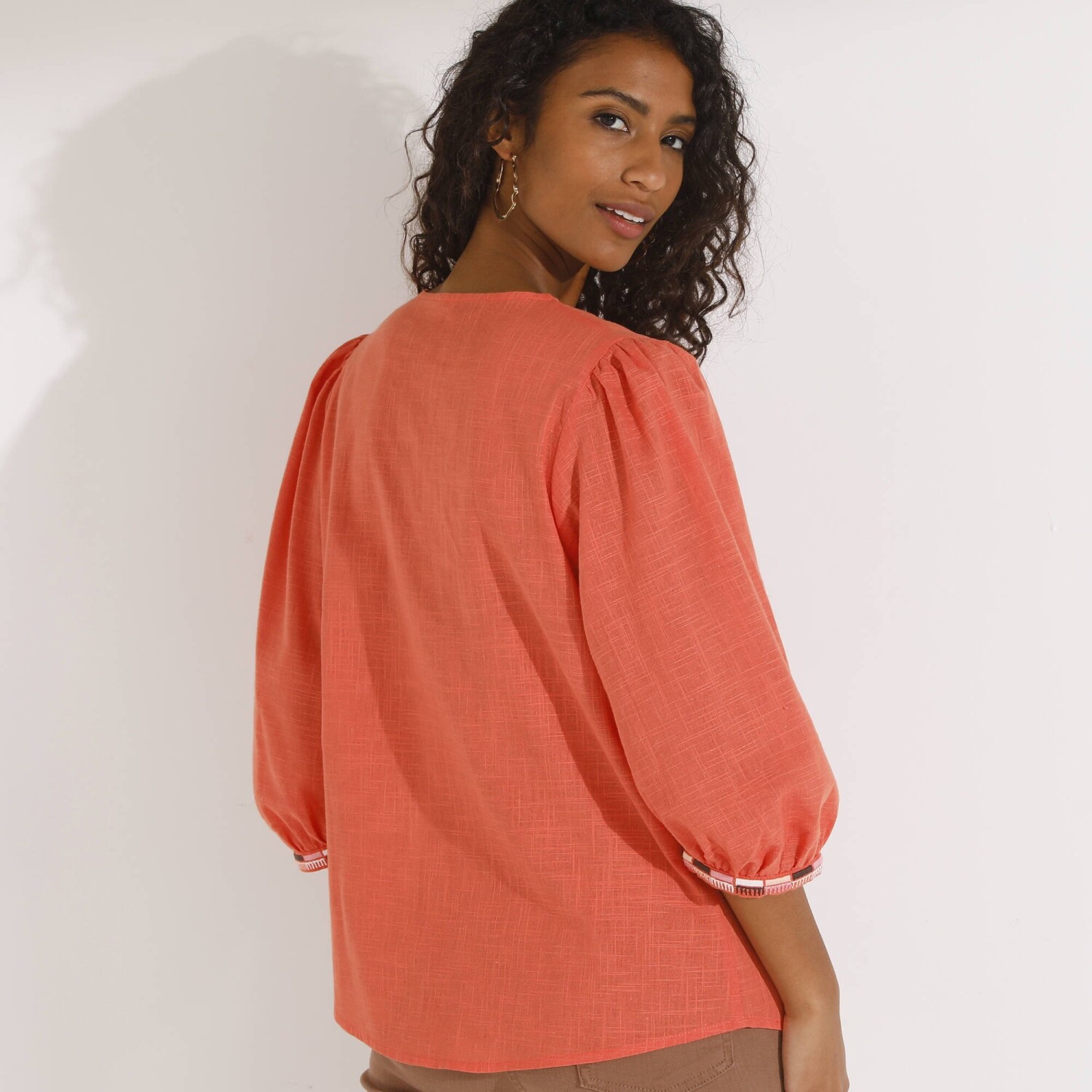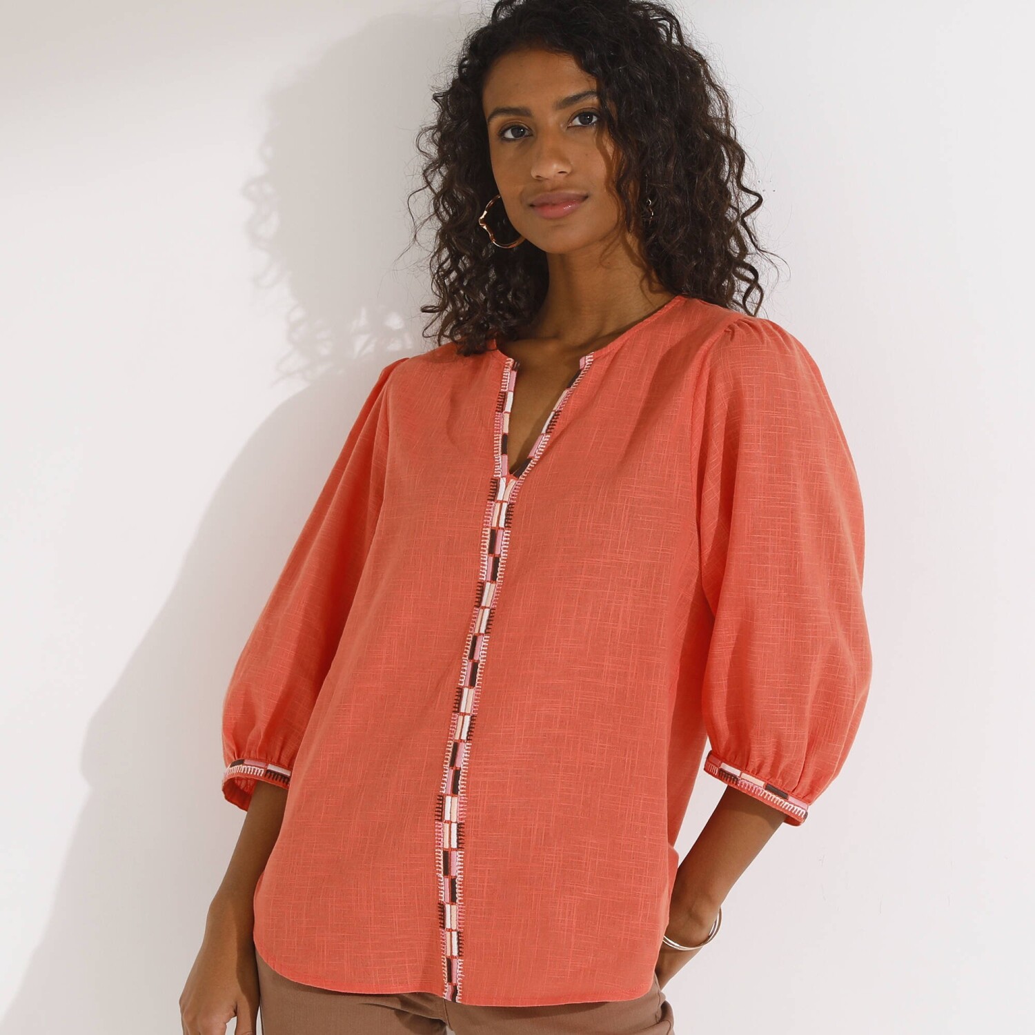 Jednobarevná halenka s krátkými rukávy a macramé proužky