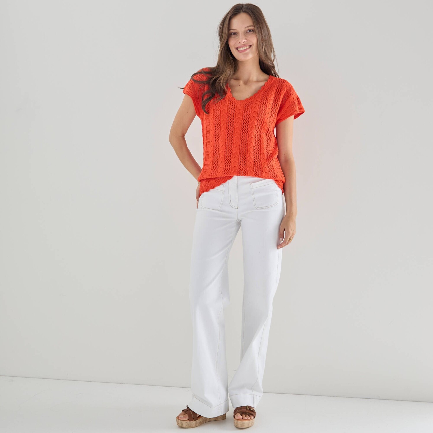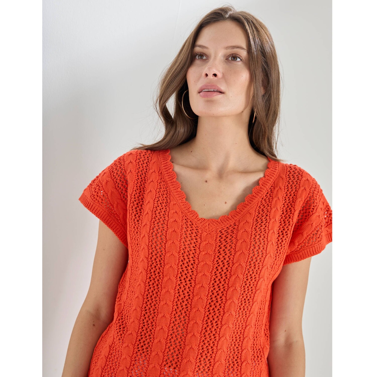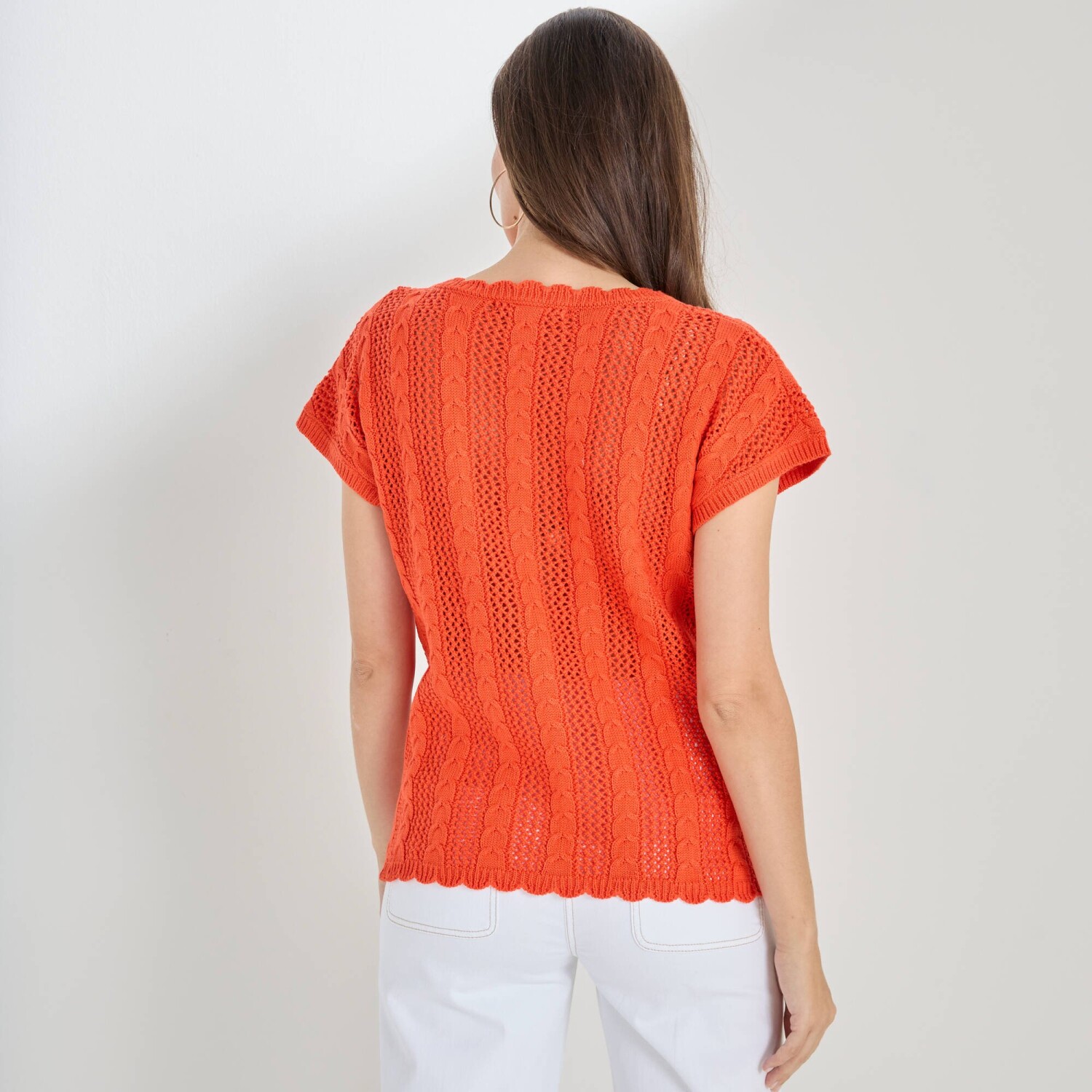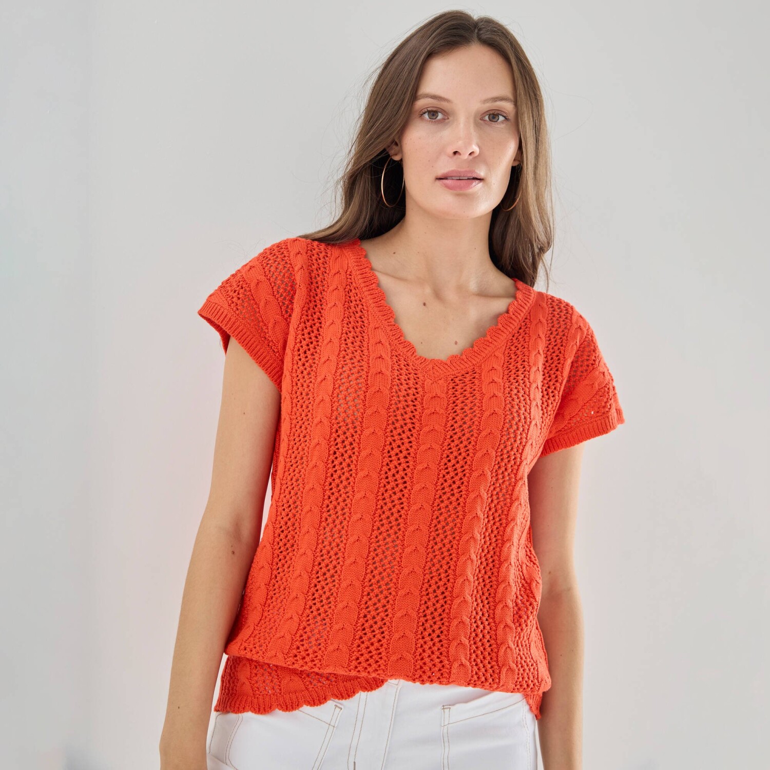 Ažurová halenka zdůrazní Vaši ženskost díky rafinovanému výstřihu. Copánkový a ažurový vzor. Výstřih do V s vlnkovaným zakončením. Krátké rukávy. Rovný dolní lem s vlnkovaný zakončením. Lze prát v pračce.