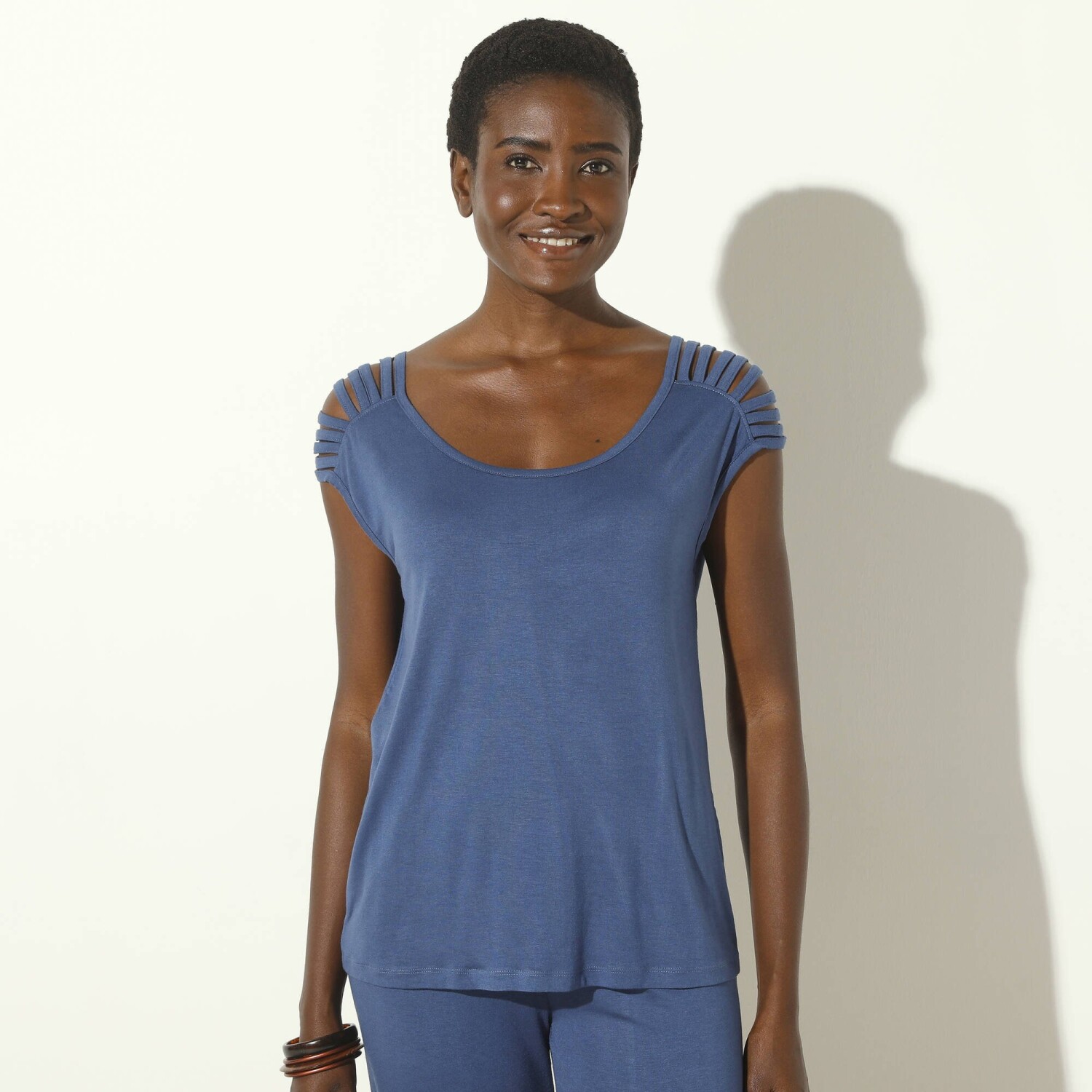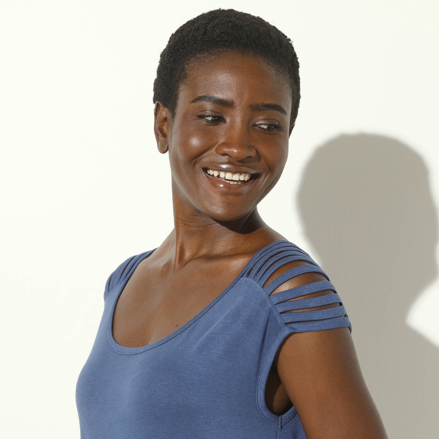 Svůdné šňůrky v ramenou, módní rovný střih a strečový úplet - to jsou přednosti tohoto ženského trička! Ze vzdušného úpletu snadného na údržbu. Pohodlný rovný střih. Kulatý výstřih. V ramenou pevné šňůrky tvořící krátké rukávy. Rovný spodní lem. Jednobarevné. Standard 100 podle Oeko-Tex (n° CQ 1216 / 3 IFTH). Tato známka označuje textilní výrobky, které byly podrobeny laboratorním testům na široké spektrum škodlivých látek a výrobek je bezpečný nad rámec platných norem. Lze prát v pračce.