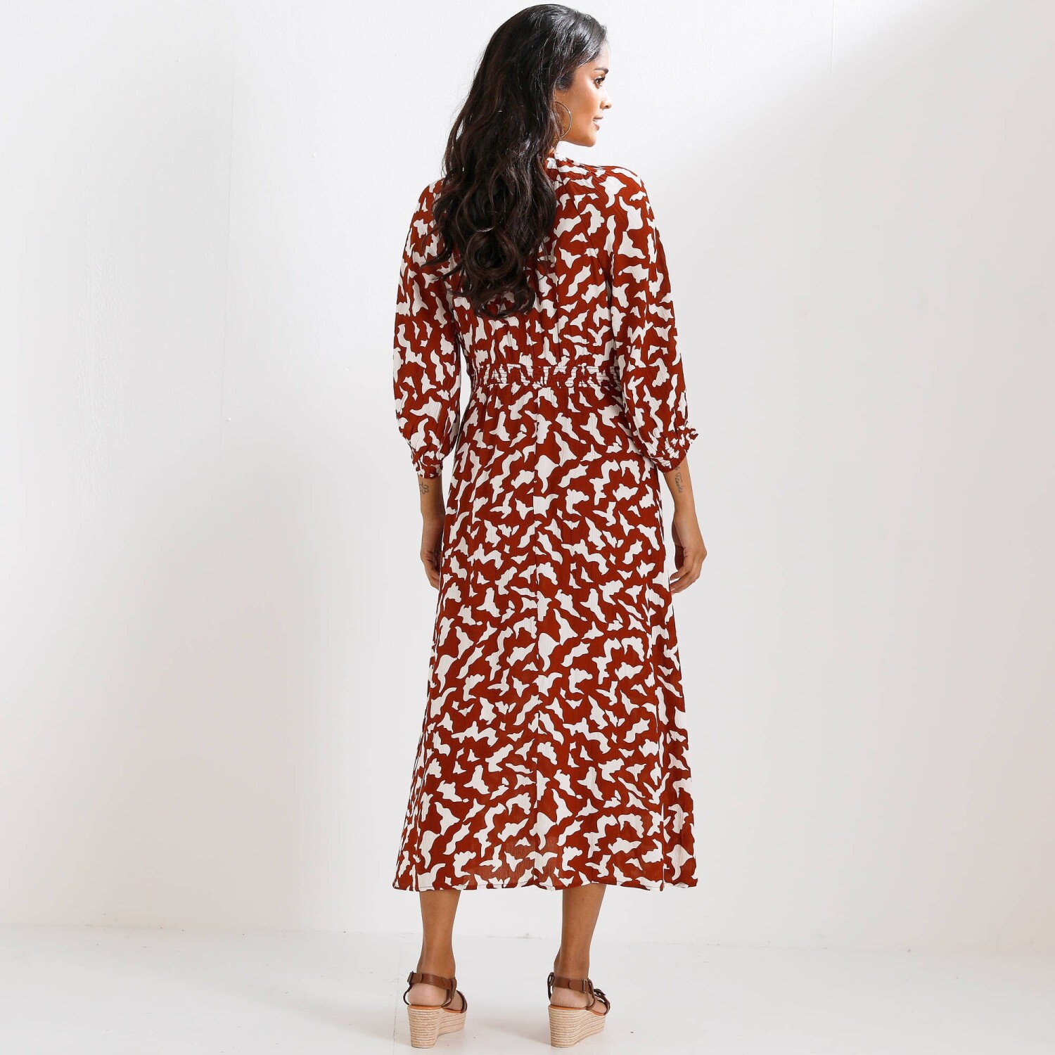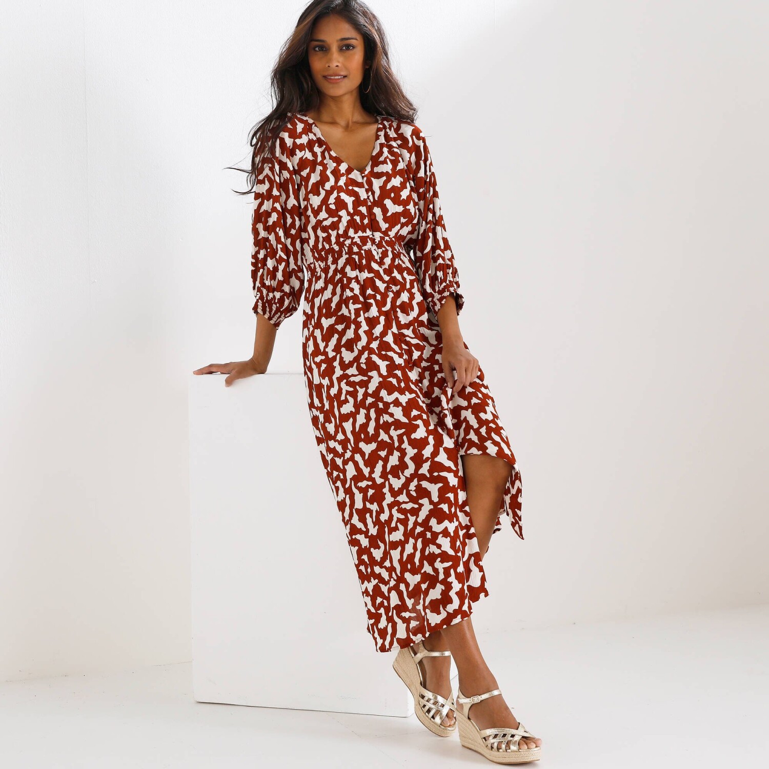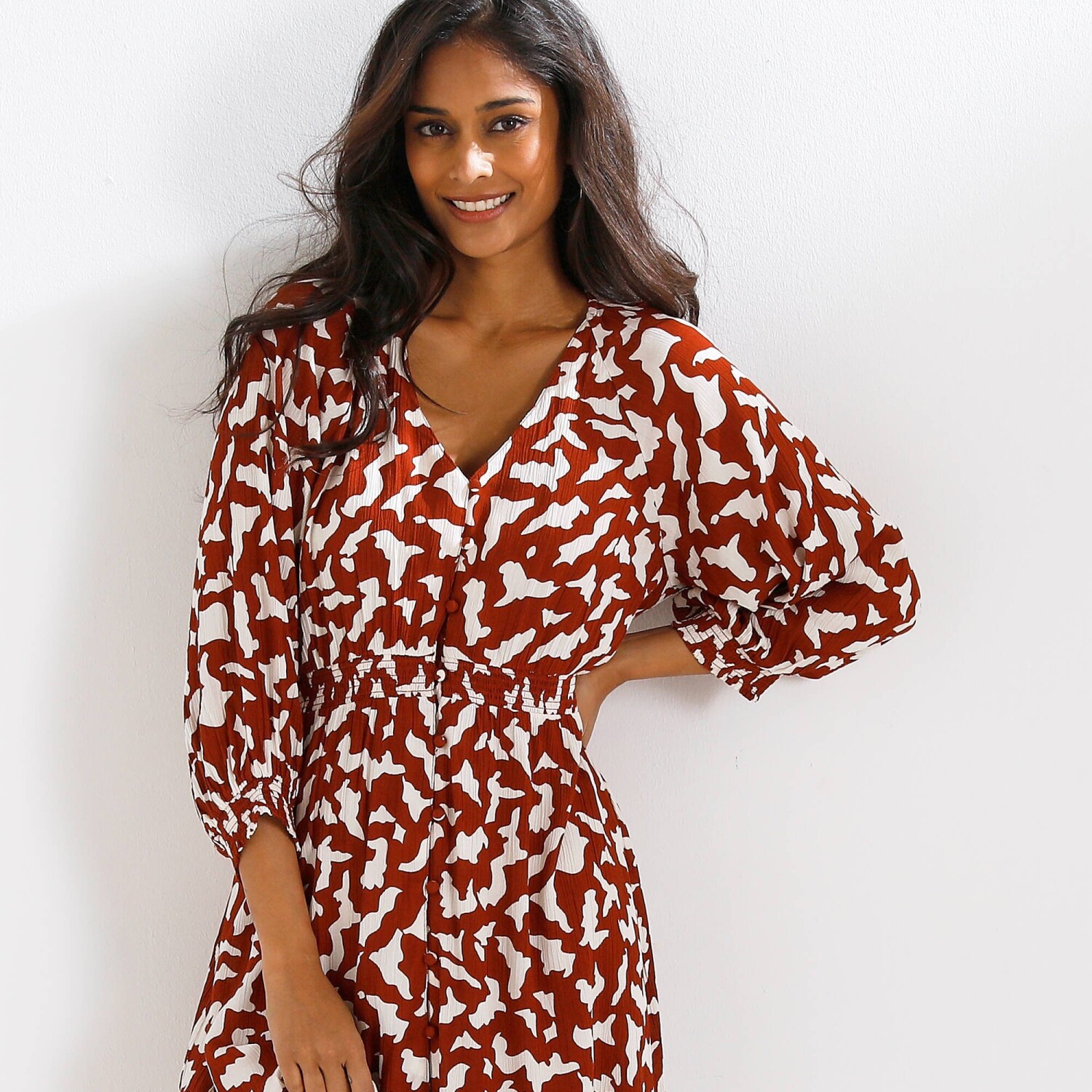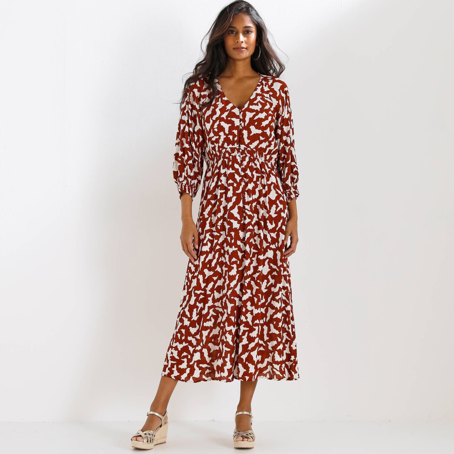 Jednobarevné dlouhé kreponové šaty na knoflíky, s dvoubarevným potiskem