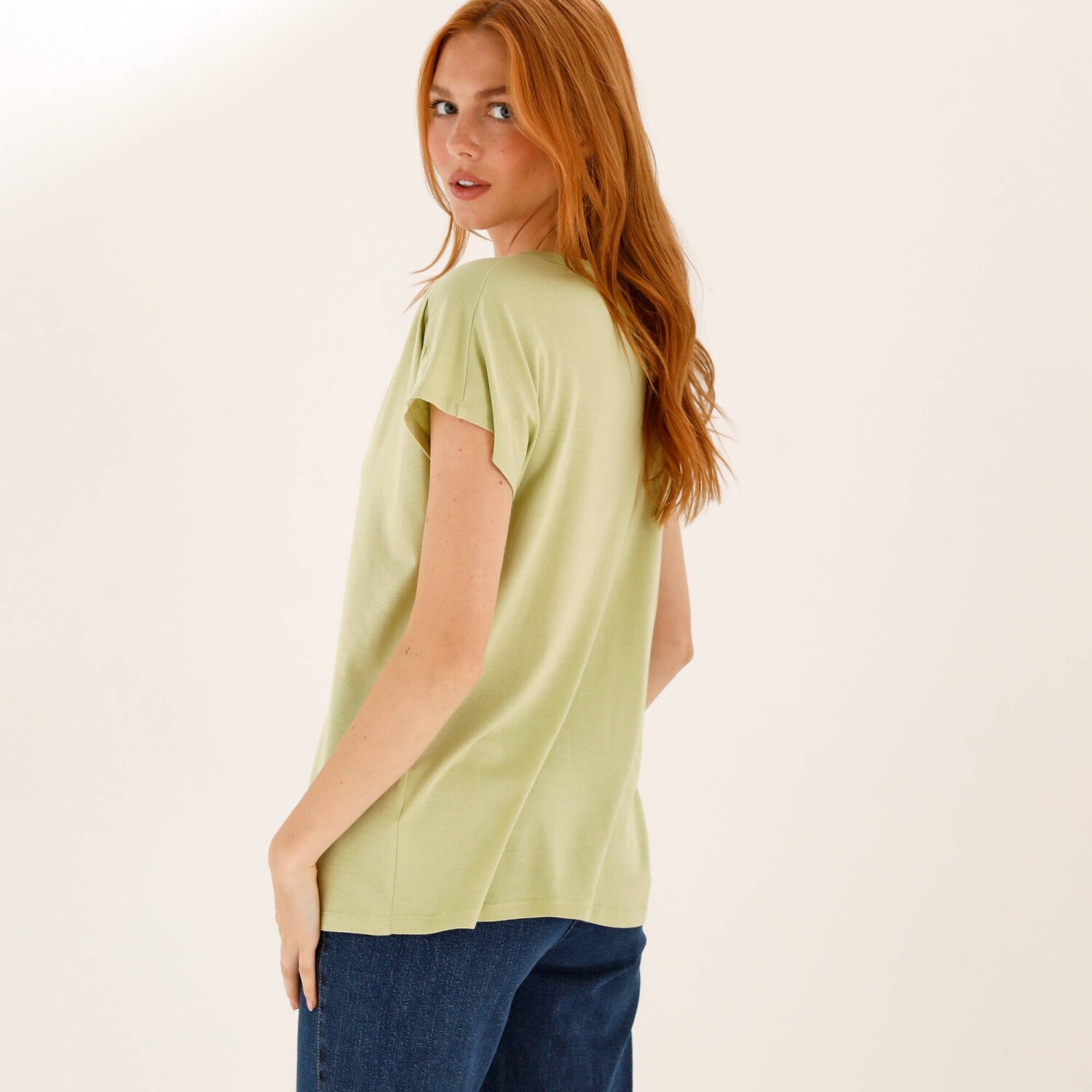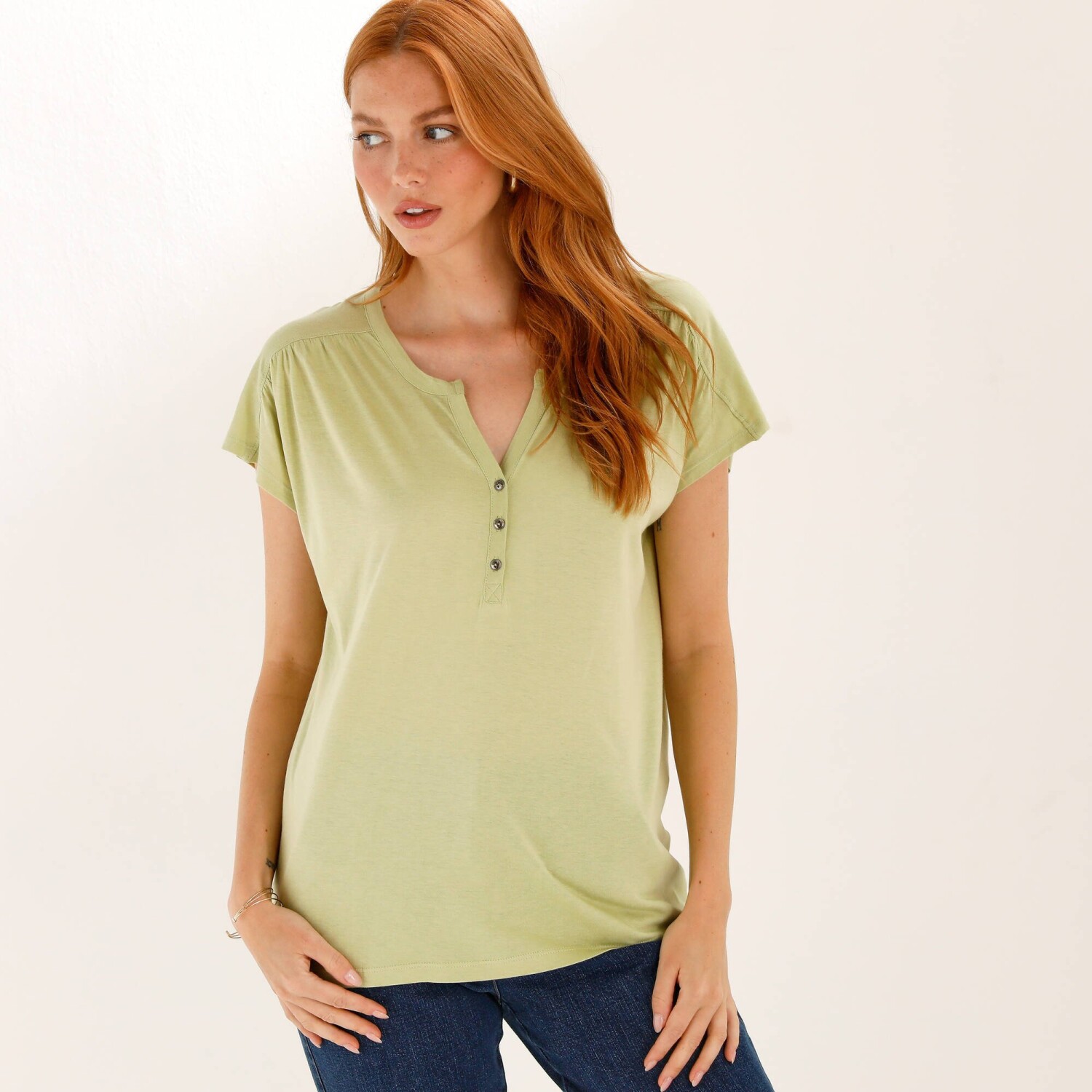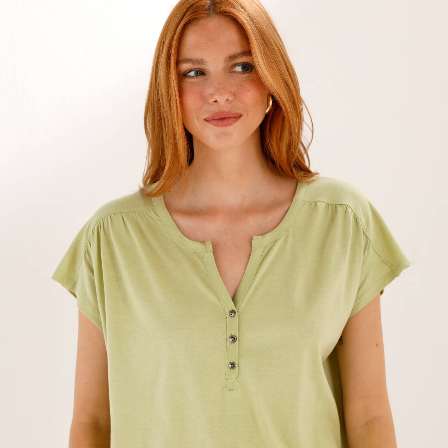 Jemné, barevné a vzdušné, je tu jednobarevné tričko s tuniským výstřihem a krátkými rukávy. Kulatý výstřih s průstřihem a knoflíkovou légou. V ramenou nařasená vsadka. Krátké rukávy, spadlá ramena. Jemný vzdušný žerzeje. Rovný spodní lem. Standard 100 podle Oeko-Tex (n° CQ 1216 / 3 IFTH). Tato známka označuje textilní výrobky, které byly podrobeny laboratorním testům na široké spektrum škodlivých látek a výrobek je bezpečný nad rámec platných norem. Lze prát v pračce.