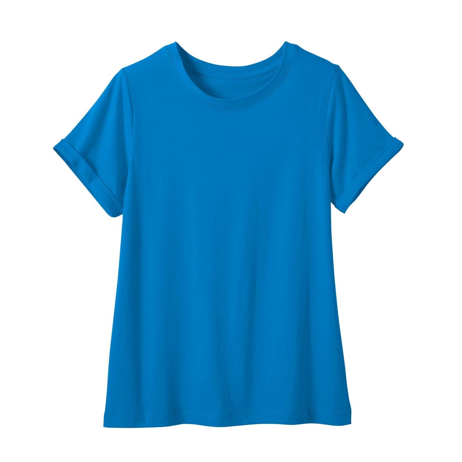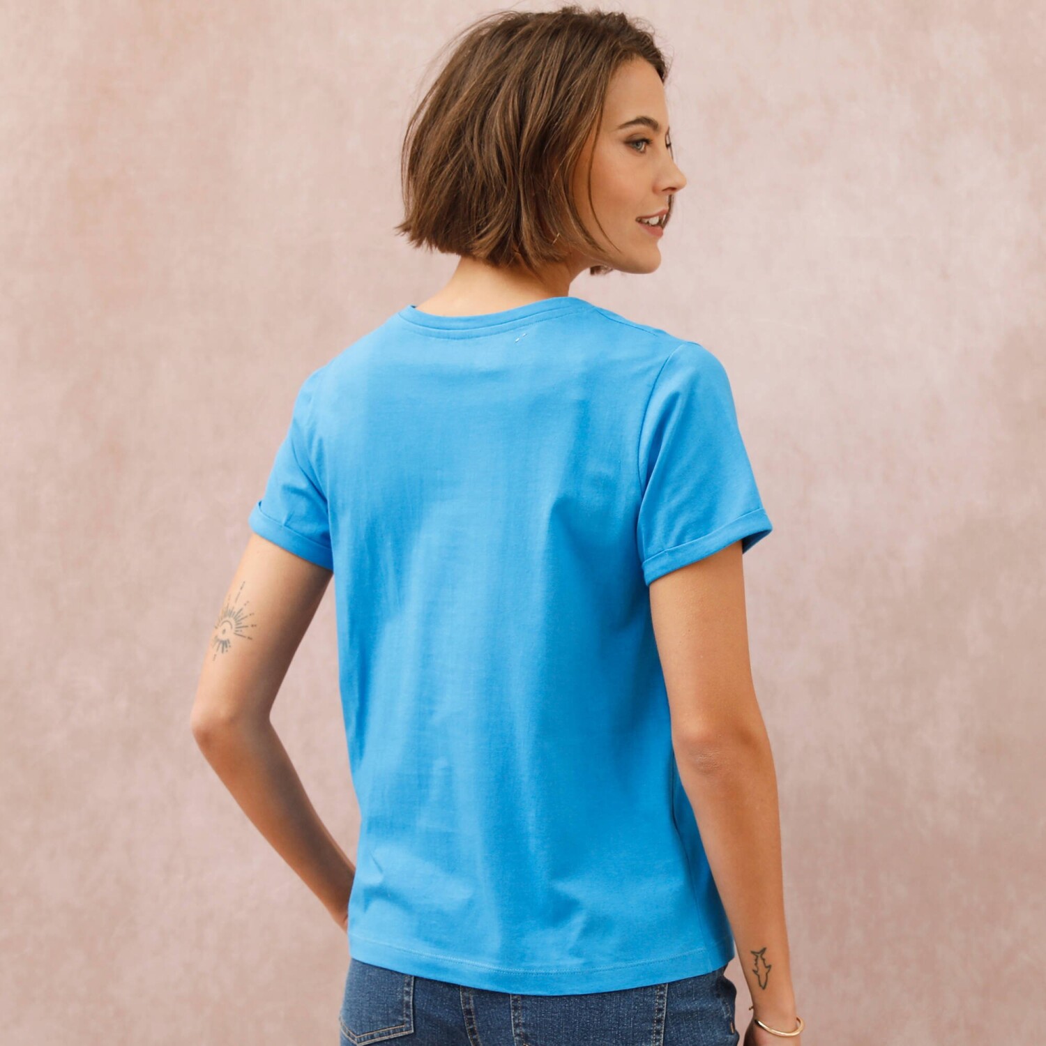 Pokud byste měli mít v letním šatníku jeden kousek, pak by to zaručeně mělo být tričko s krátkými ohrnutými rukávy. Kulatý výstřih. Krátké ohrnuté rukávy. Rovný dolní lem. Vzdušný žerzej, příjemné nošení. Standard 100 podle Oeko-Tex. Tato známka označuje textilní výrobky, které byly podrobeny laboratorním testům na široké spektrum škodlivých látek a výrobek je bezpečný nad rámec platných norem. Lze prát v pračce.