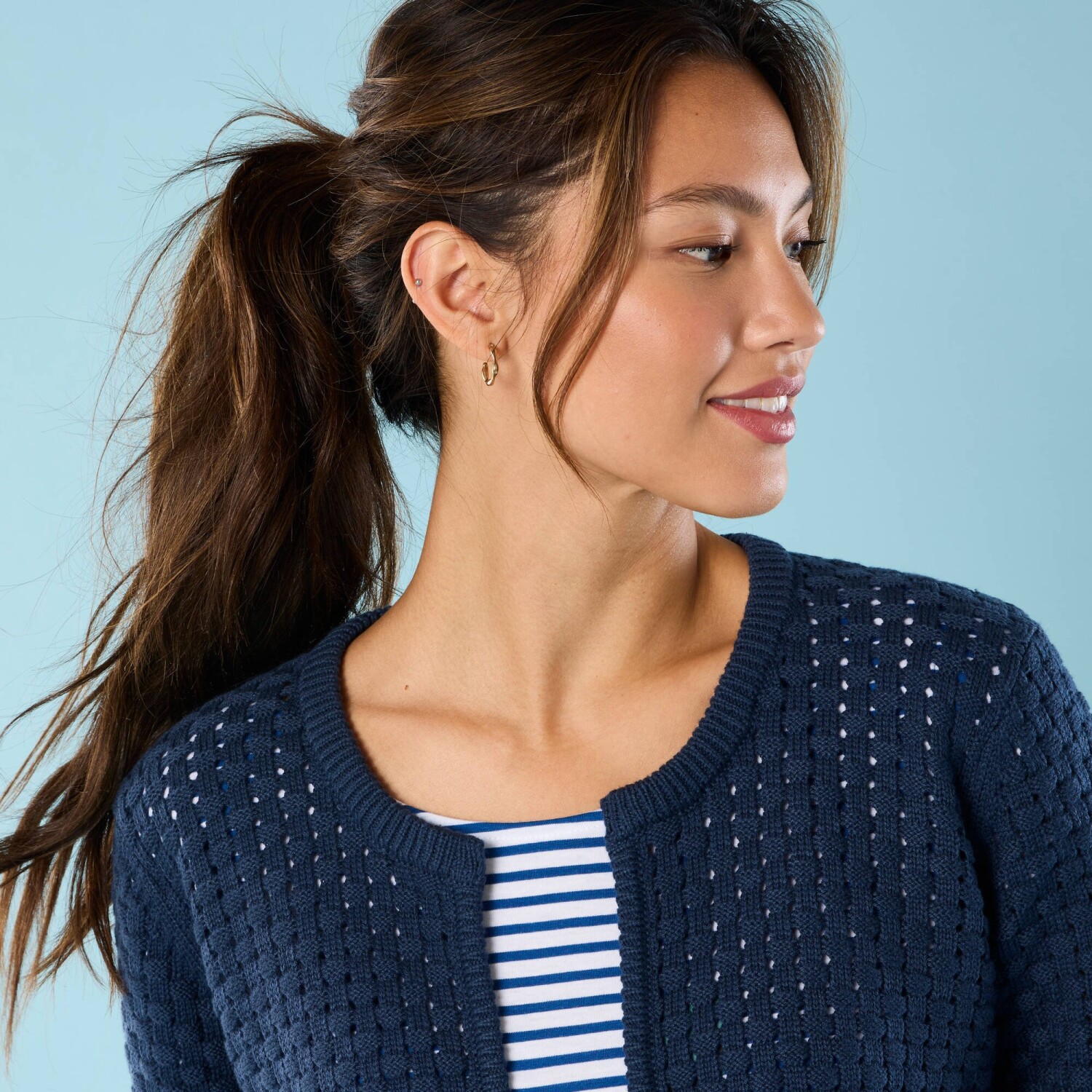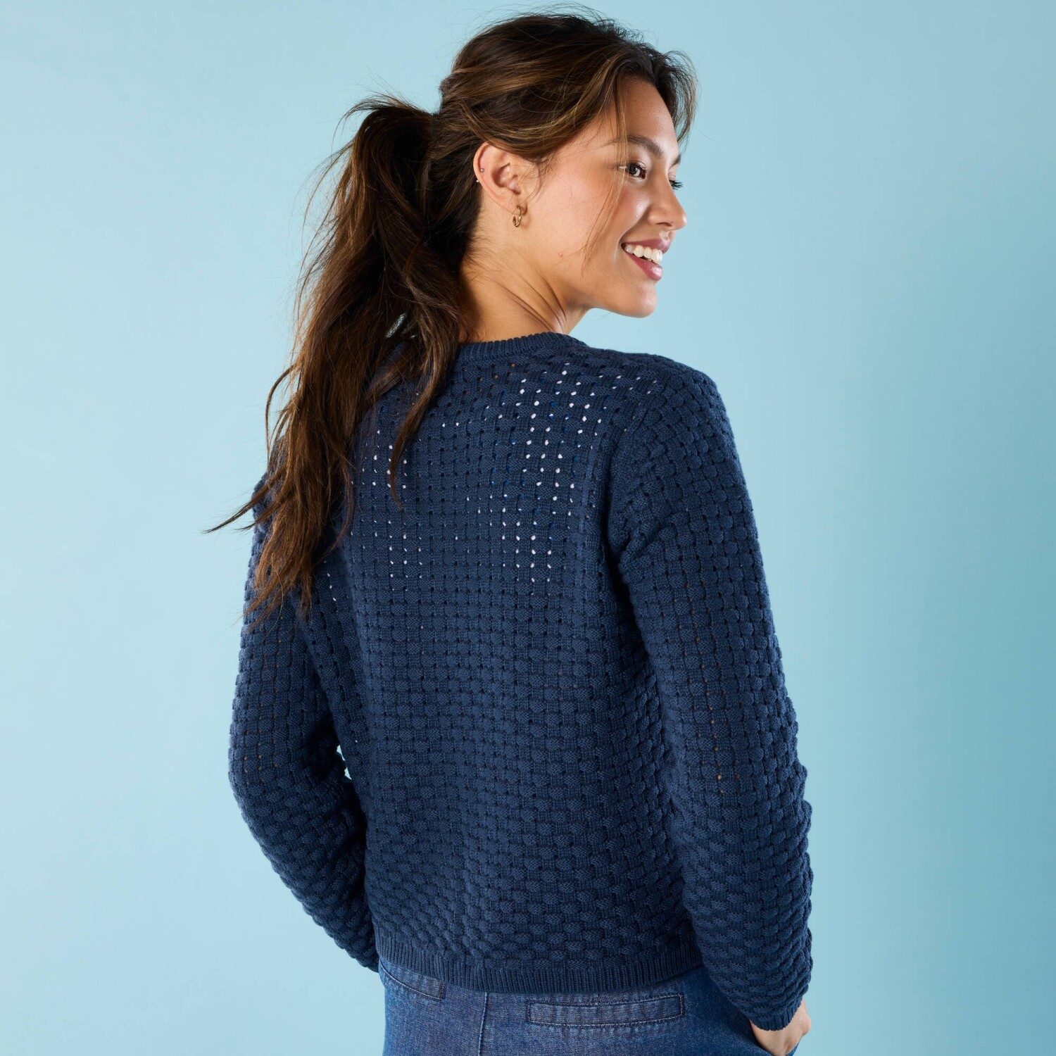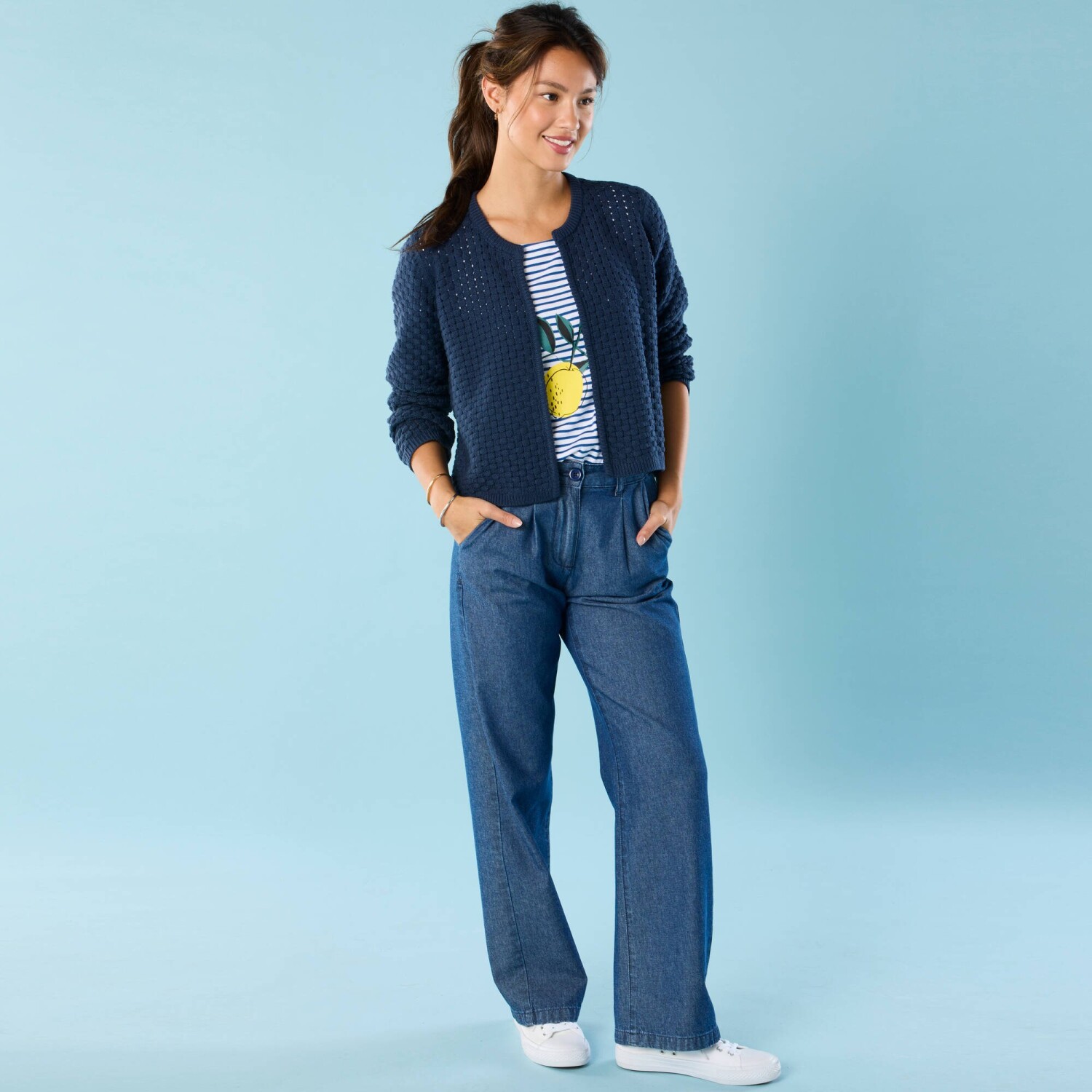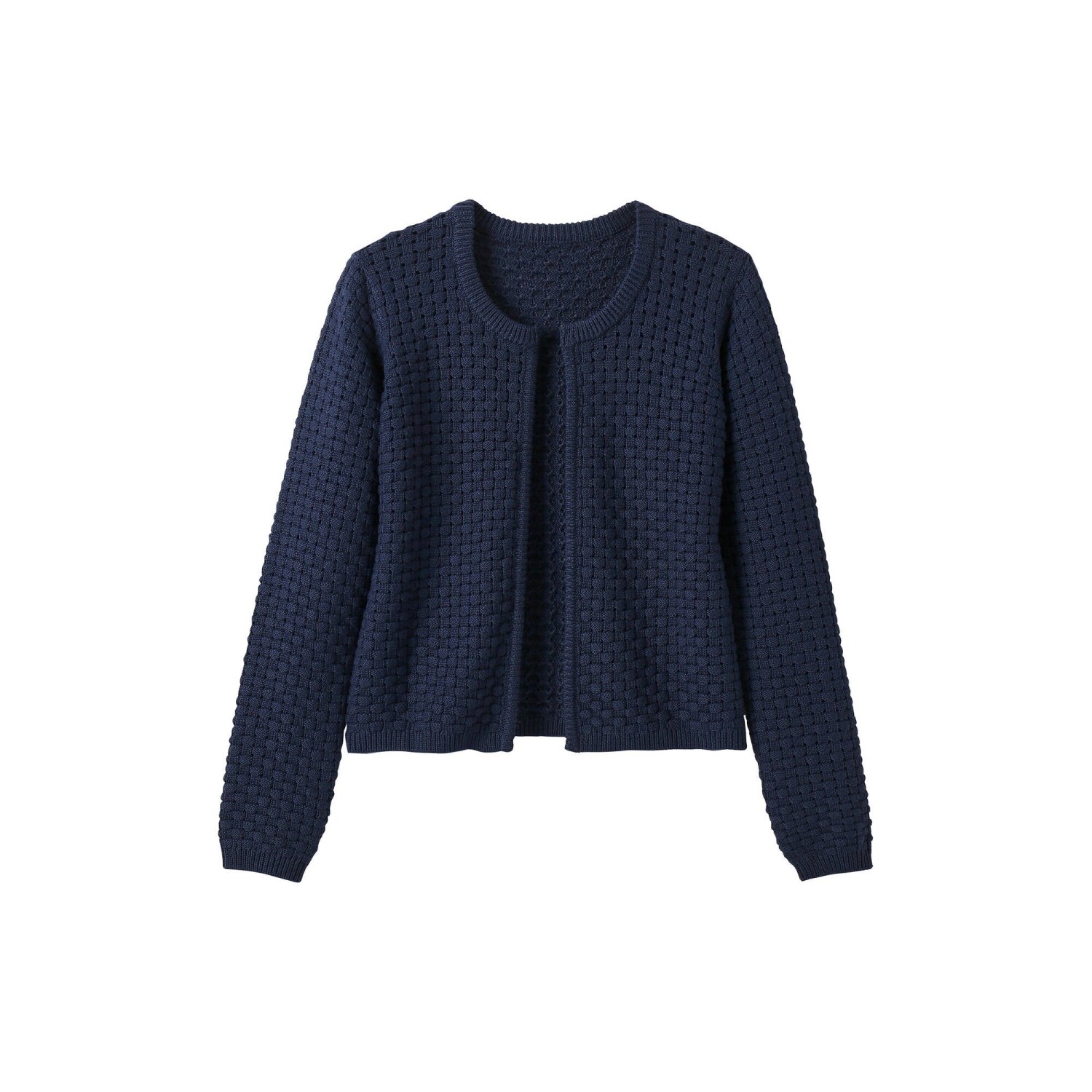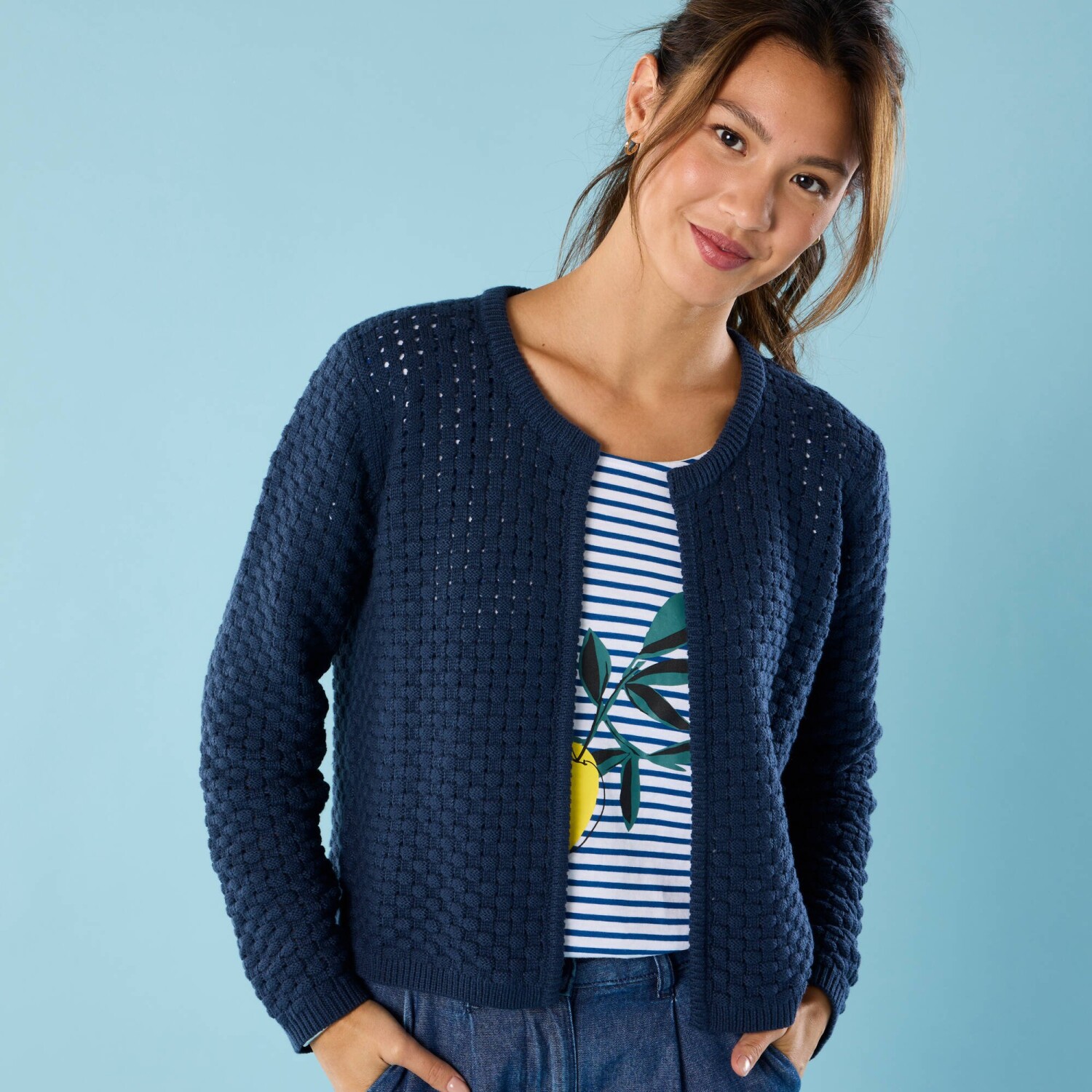 Přes šaty nebo tričko, krátký kardigan dodá originalitu každému outfitu. Originální úplet v tkaném vzhledu. Bez zapínání. Kulatý výstřih. Dlouhé rukávy. Žebrované zakončení dolního lemu, manžet a předního dílu. Rovný dolní lem. Lze prát v pračce.