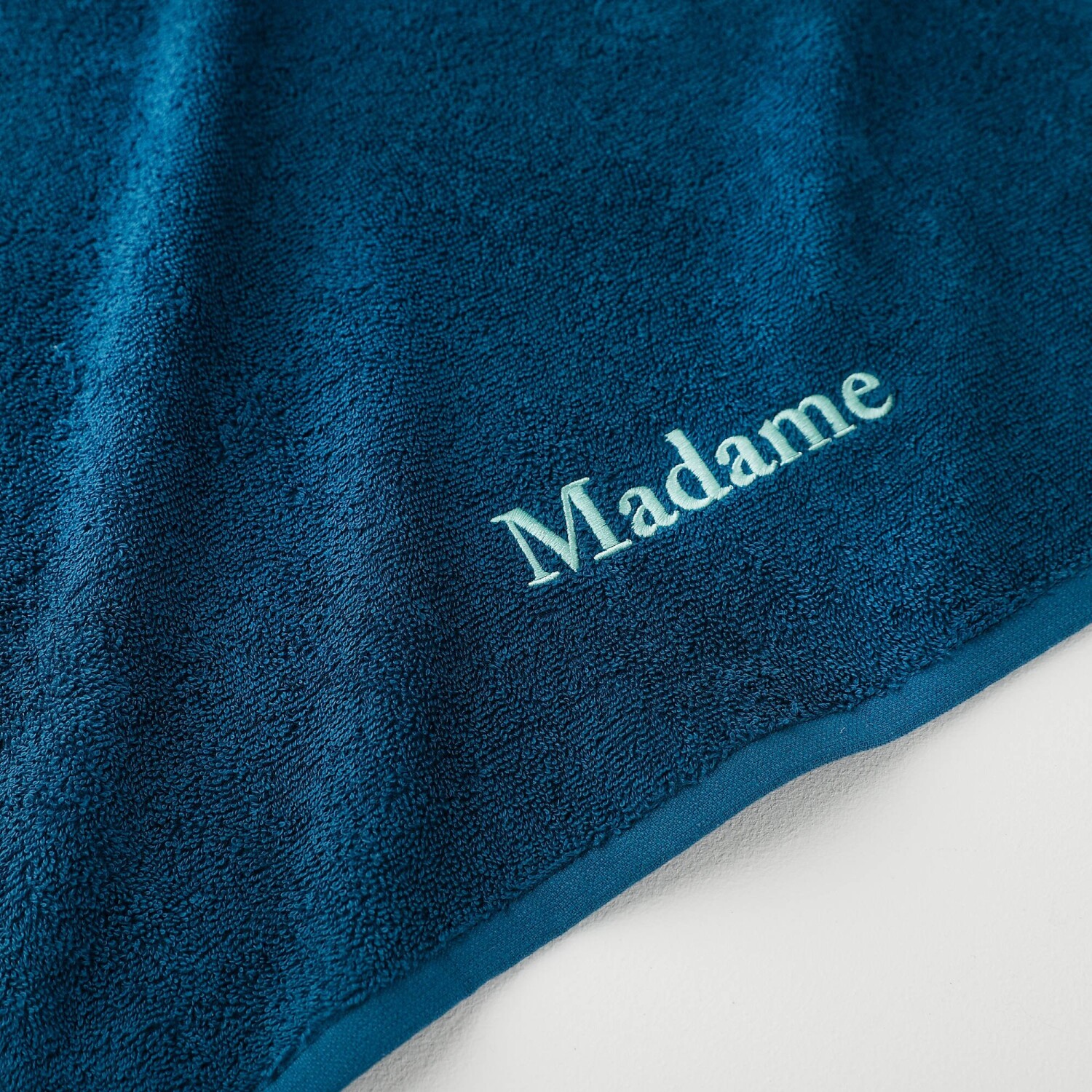 Koupelnový textil s výšivkou MADAME (PANÍ) z měkkého froté buklé, s vysoce absorpčními vlastnostmi a kvalitou zn. Colombine. Z materiálu vybraného pro svou jemnost a odolnost. Barvy odolné praní. Pečlivá výšivka MADAME z barveného vlákna. Ručník 50 x 100 cm. Sada 2 žínek 15 x 21 cm. Osuška 70 x 130 cm. Maxi osuška 90 x 150 cm. Žínky s poutkem pro pověšení. Certifikát Made In Green od OEKO-TEX®. Kromě ověření několika stovek chemických látek, které přispívají k vysoké bezpečnosti, toto označení zaručuje ohleduplné výrobní principy a kontrolované společenské postupy. Lze prát na 60 °C, pro ochranu životního prostředí doporučujeme prát na 40 °C a sušit volně na vzduchu.