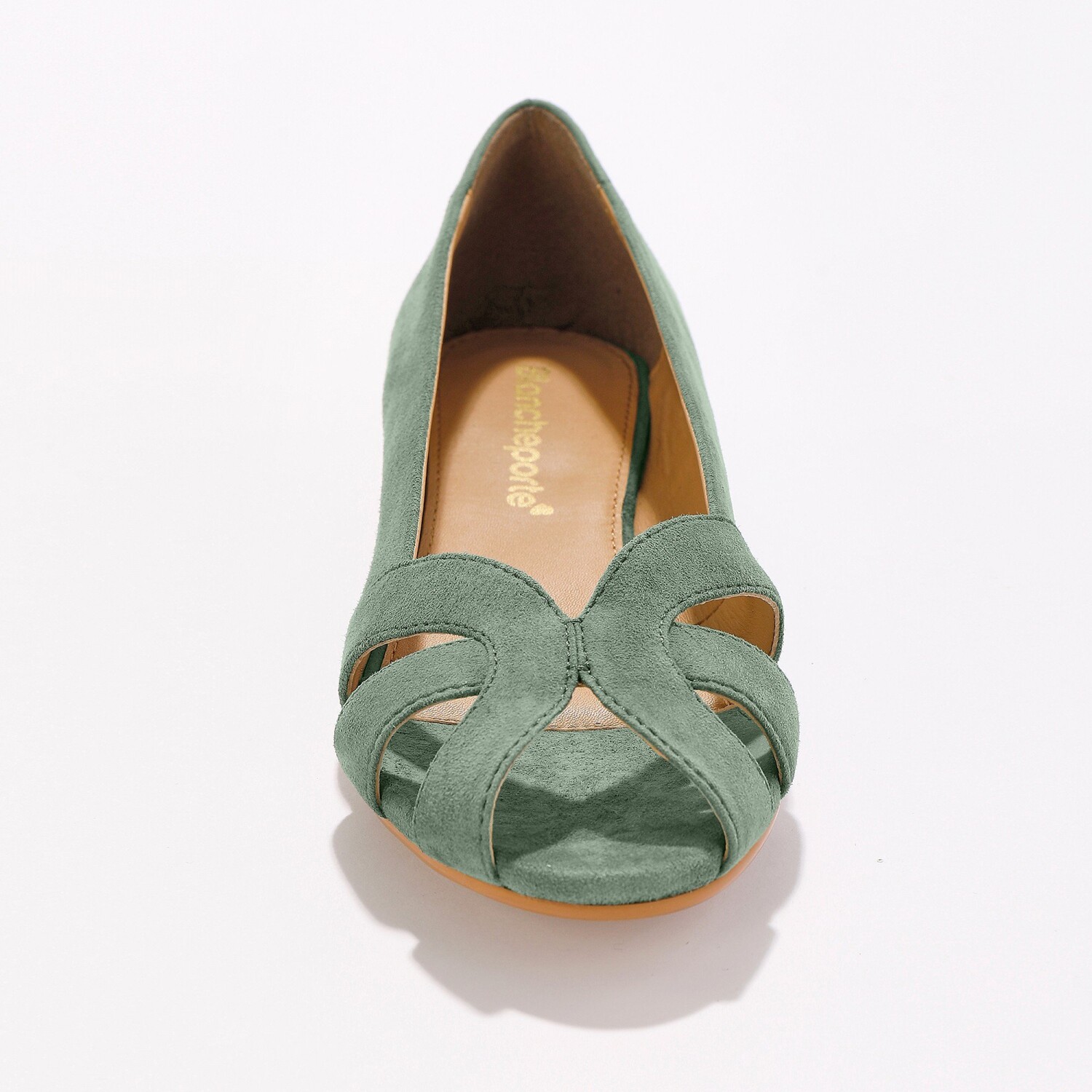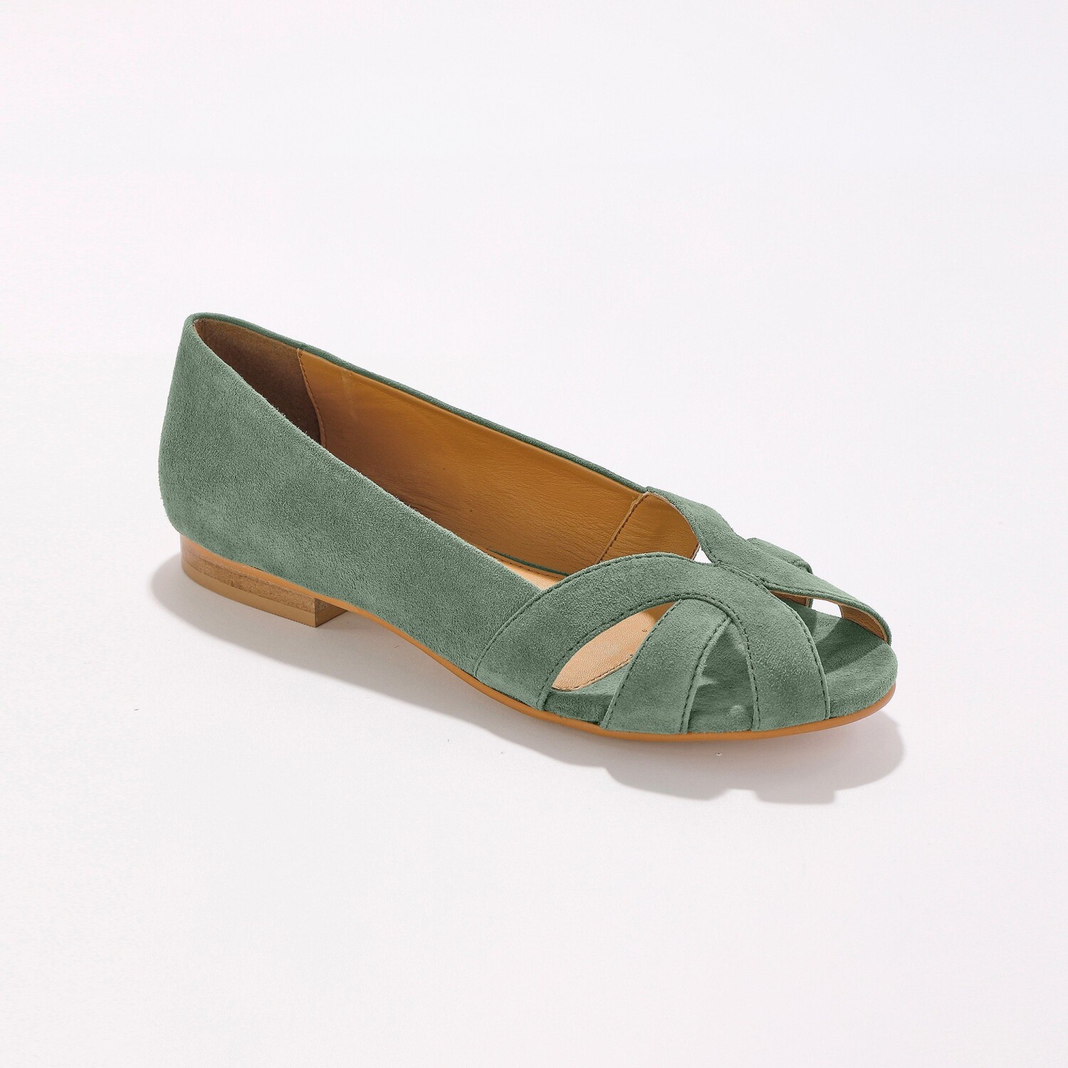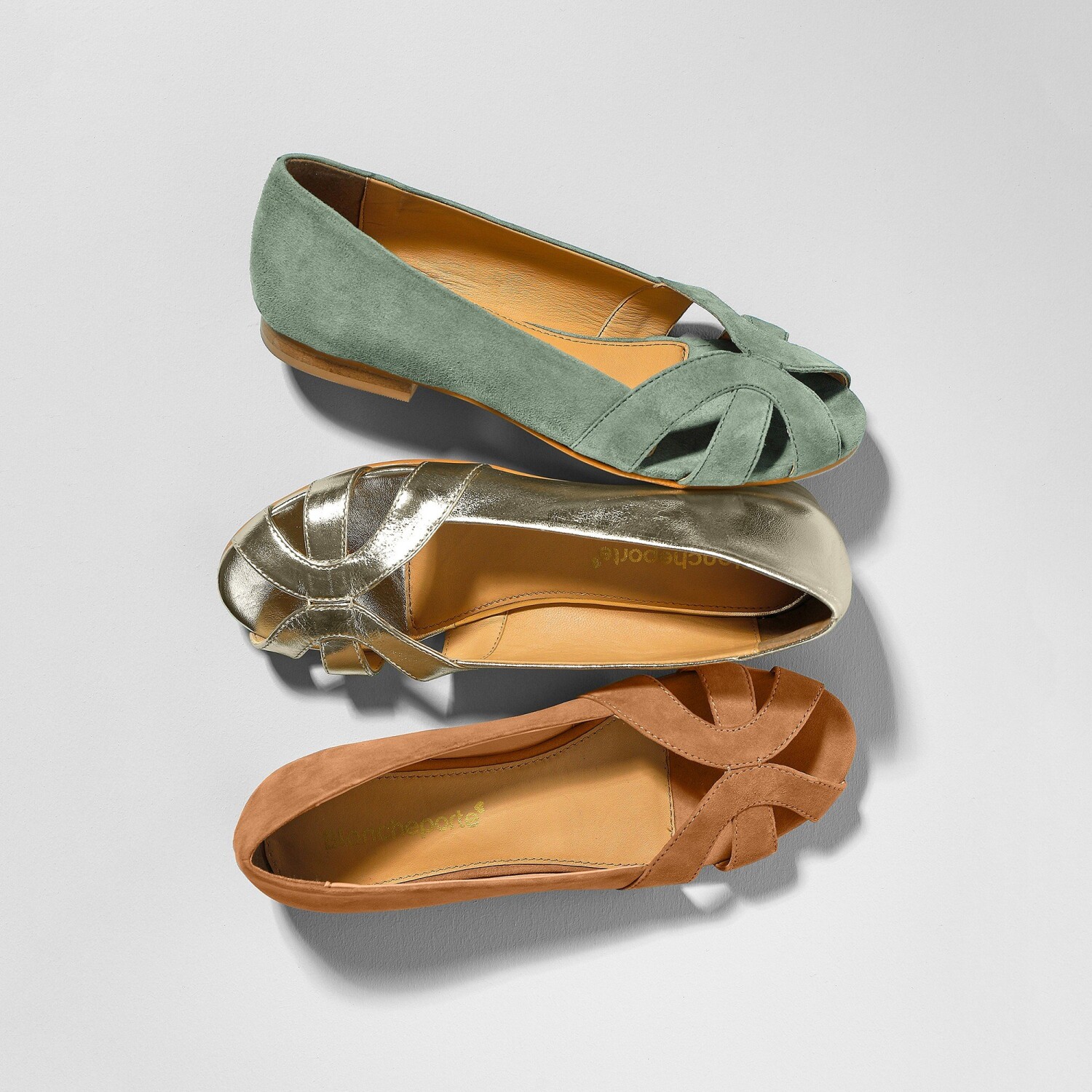 Kožené baleríny s otevřenou špičkou jsou maximálně módní a navíc prodyšné! Z pravé kvalitní kůže. Stélka z kůže na pěnovém podkladu pro měkké pohodlí. Otevřená špička, svršek v členitém střihu. Pevný opatek. Vaše boty pravidelně ošetřujte přípravkem pro ochranu před skvrnami a vlhkostí.