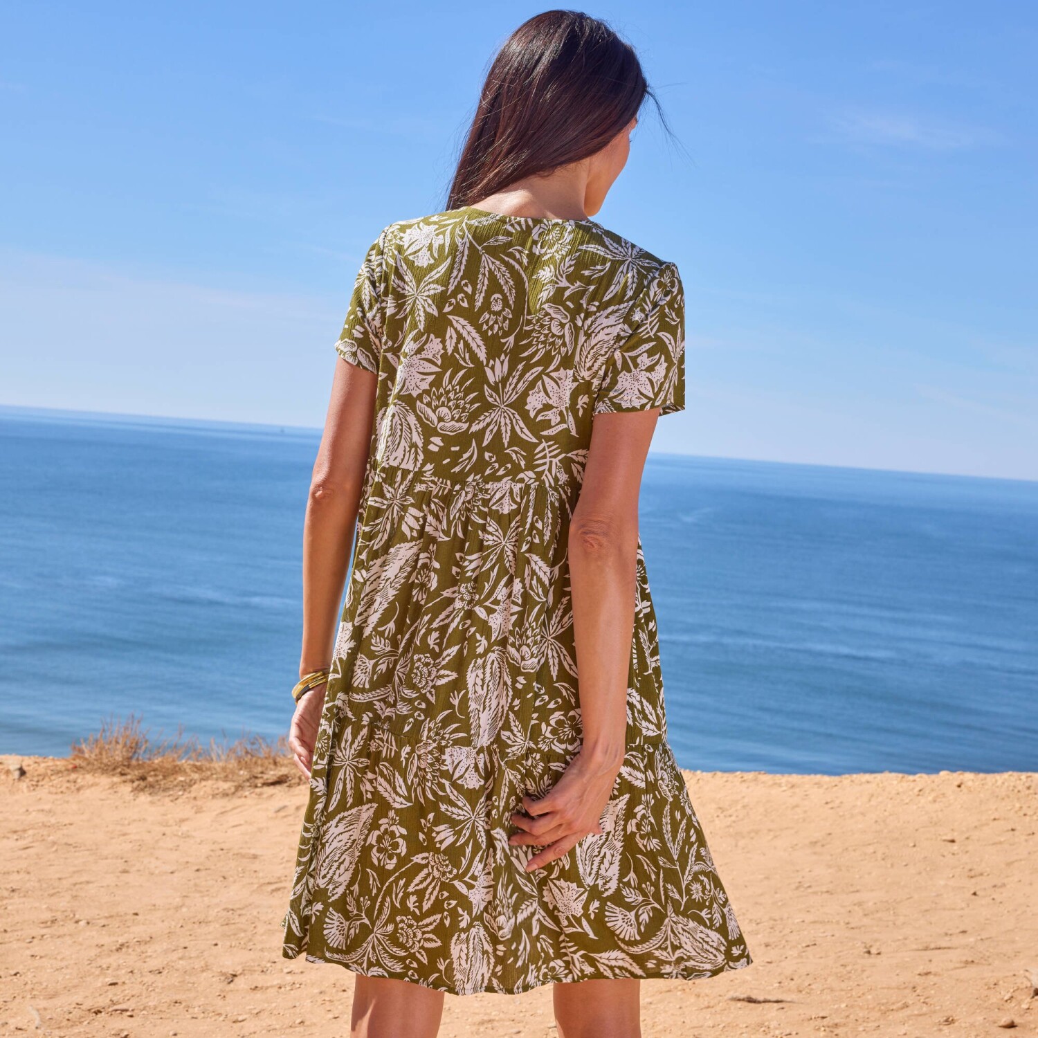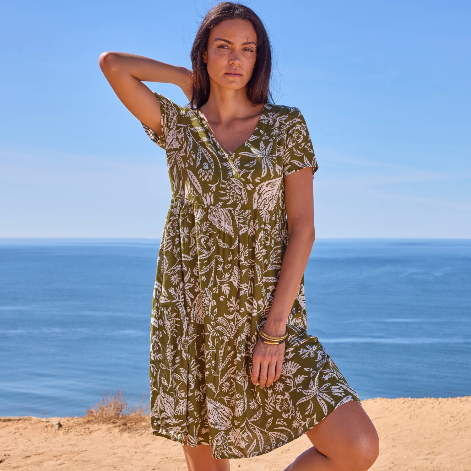 Krátké šaty s potiskem jsou navržené v rozšířeném střihu, který sluší každé postavě. Z lehkého kreponu. Rozšířený střih. Výstřih do "V". Krátké rukávy. Prsní záševky. Vysoko v pase přestřižení. Volánová dolní část šatů. Lze prát v pračce.