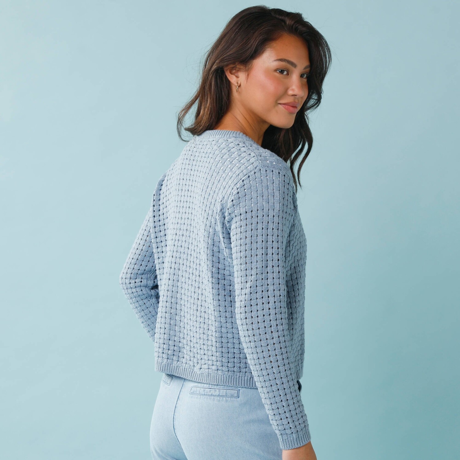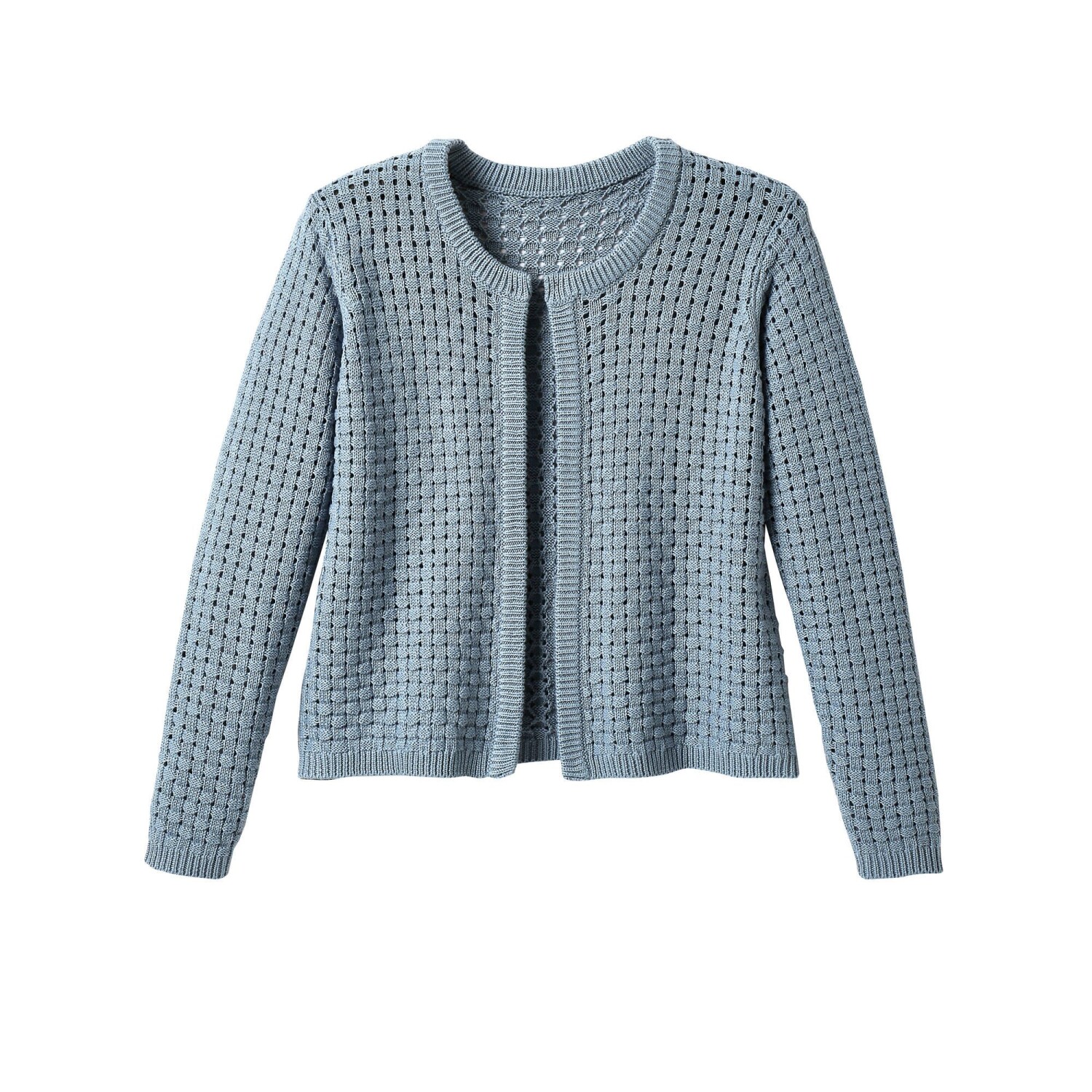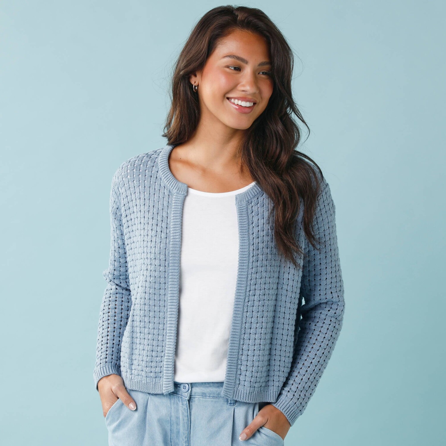 Propínací svetr s výstřihem do V a 3/4 rukávy.