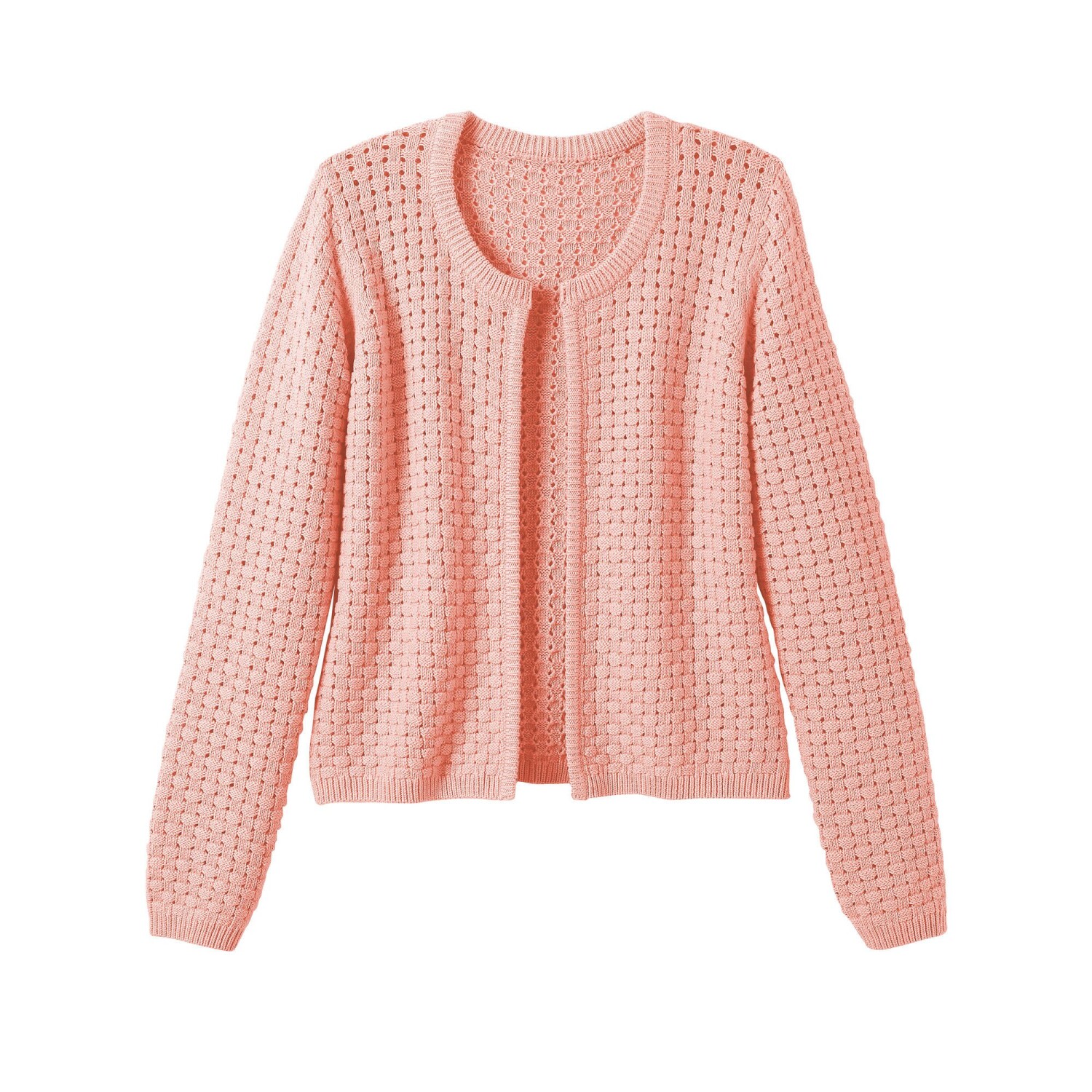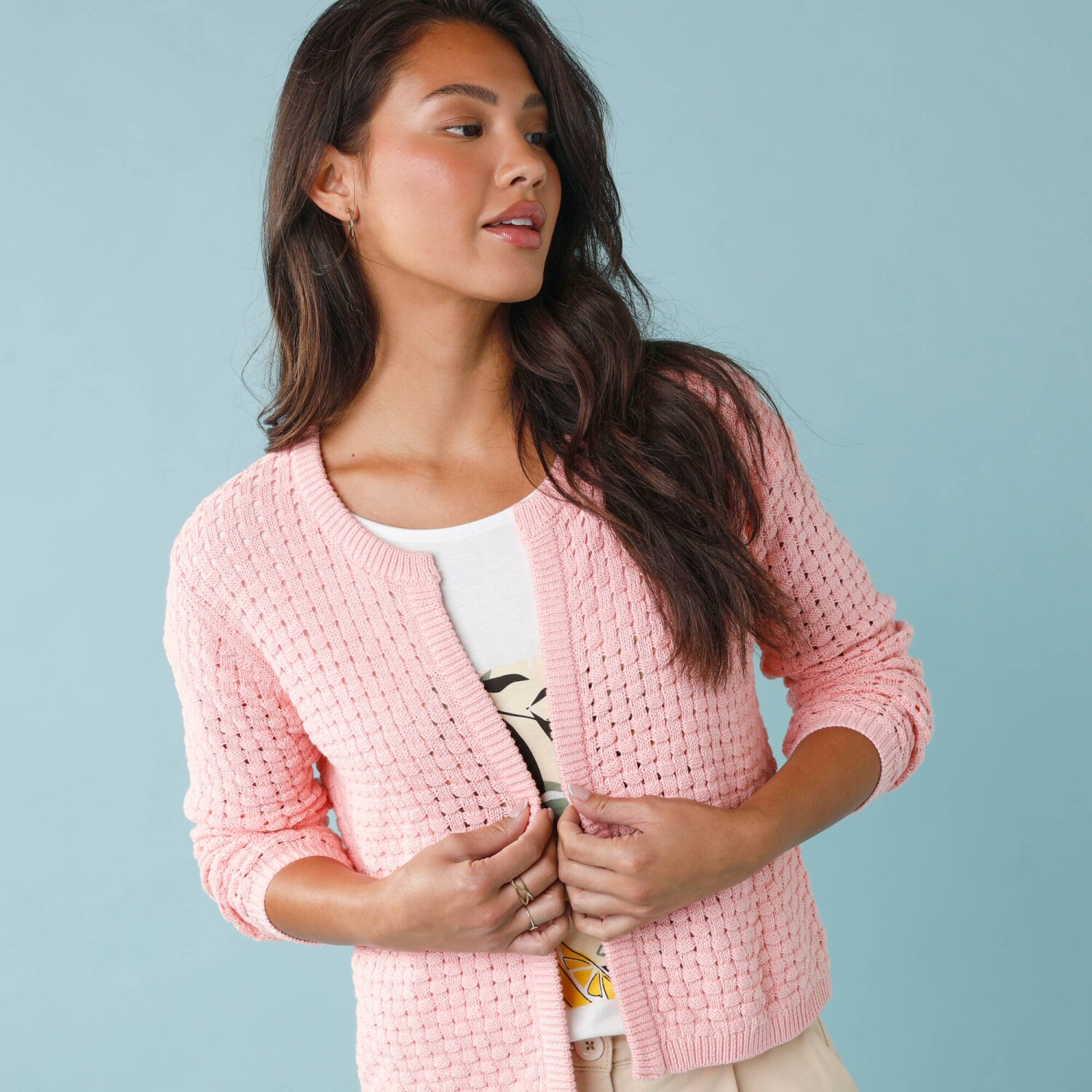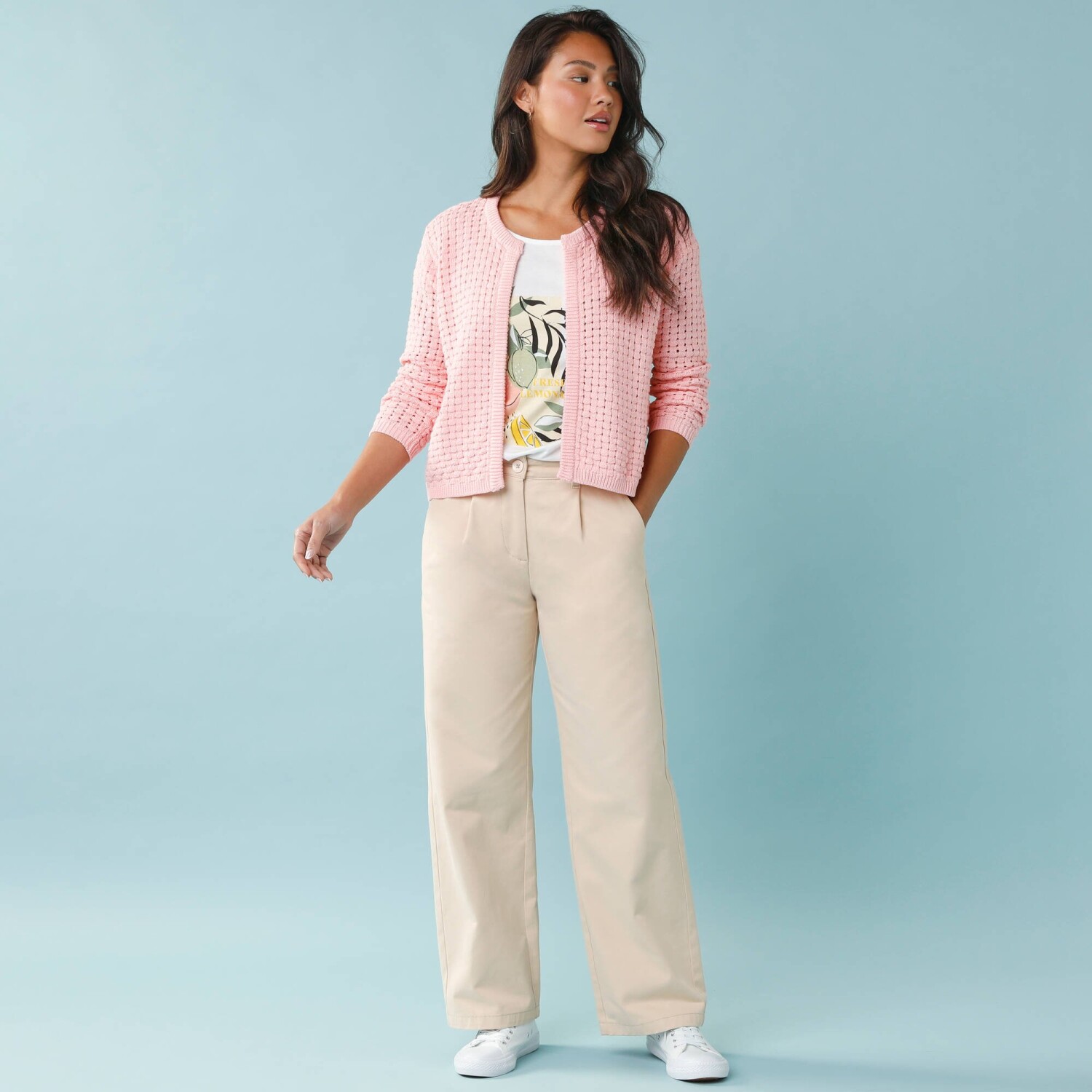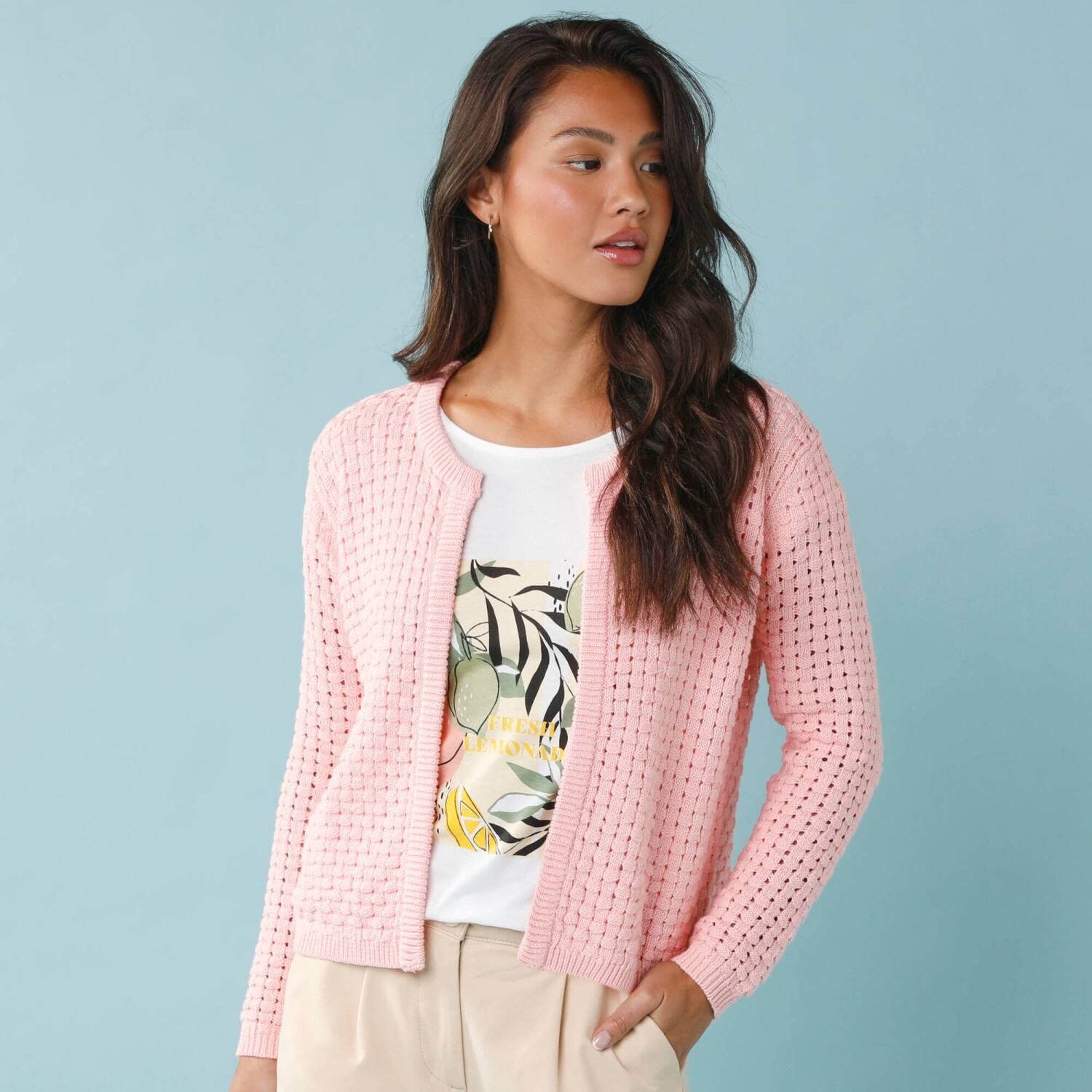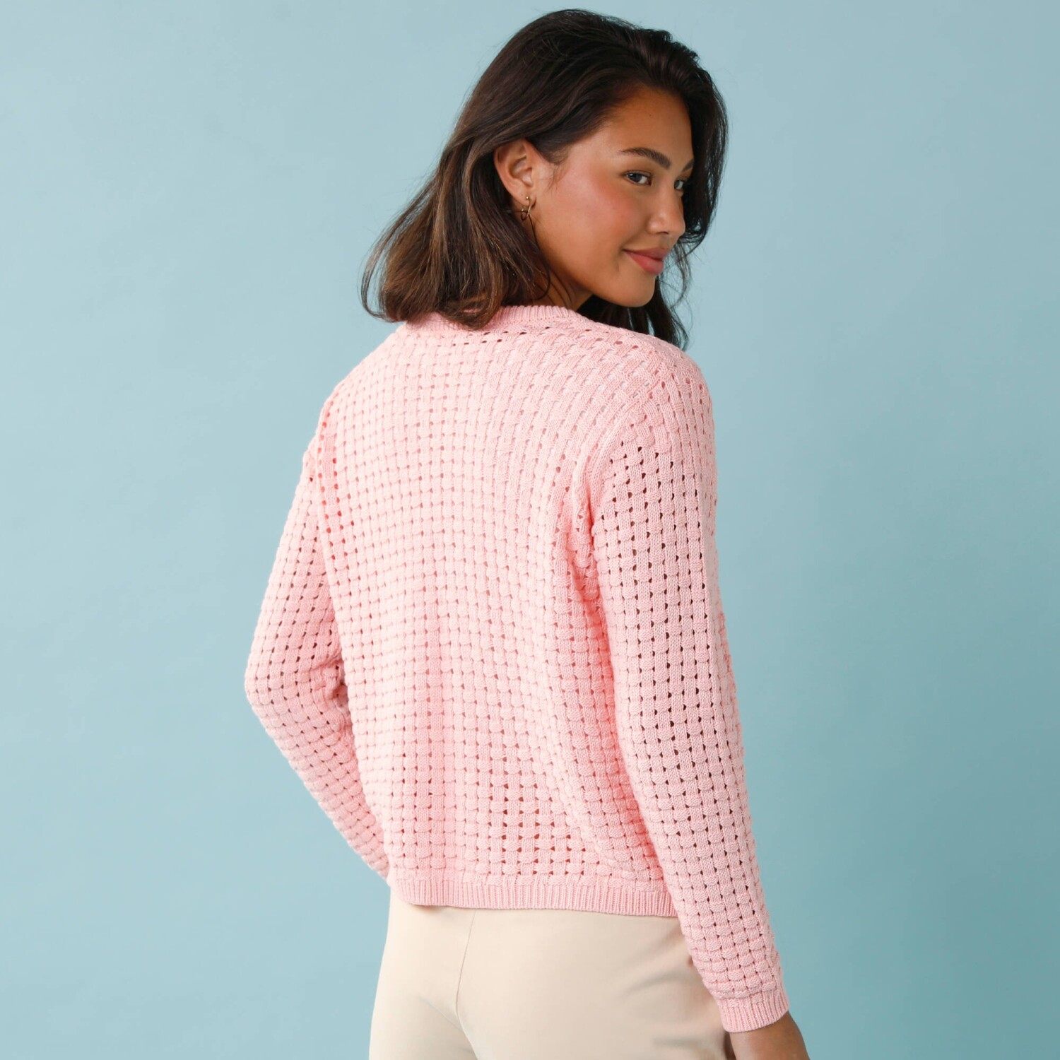 Propínací svetr s výstřihem do V a 3/4 rukávy.