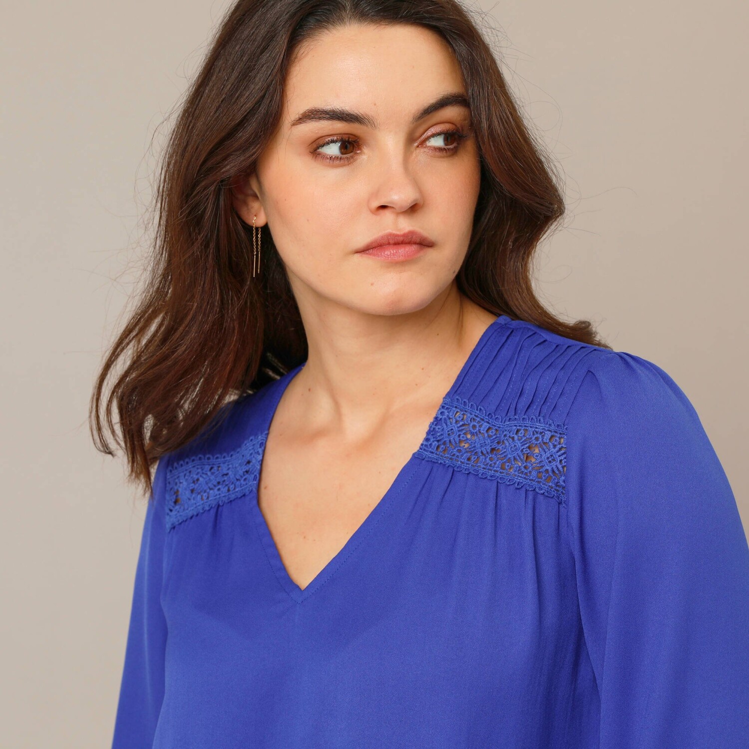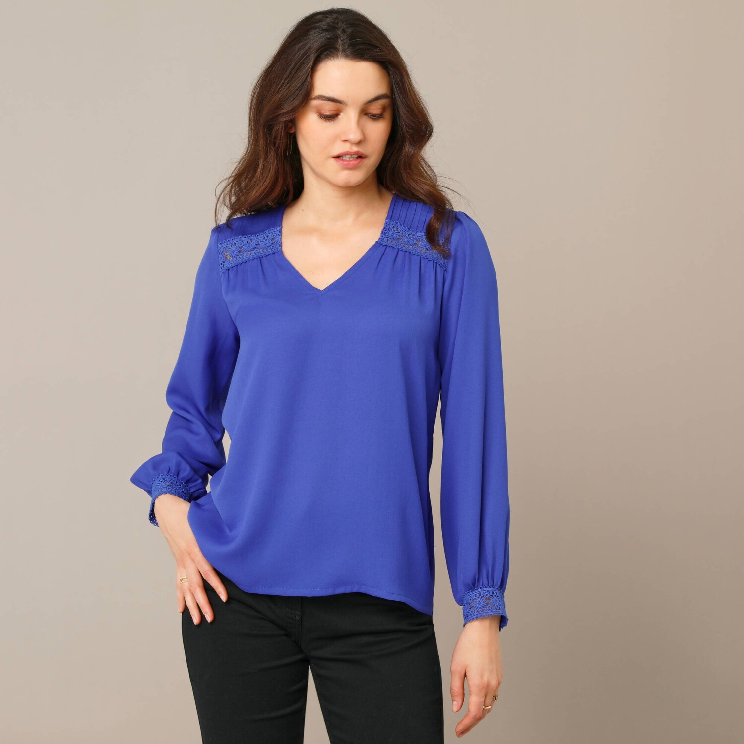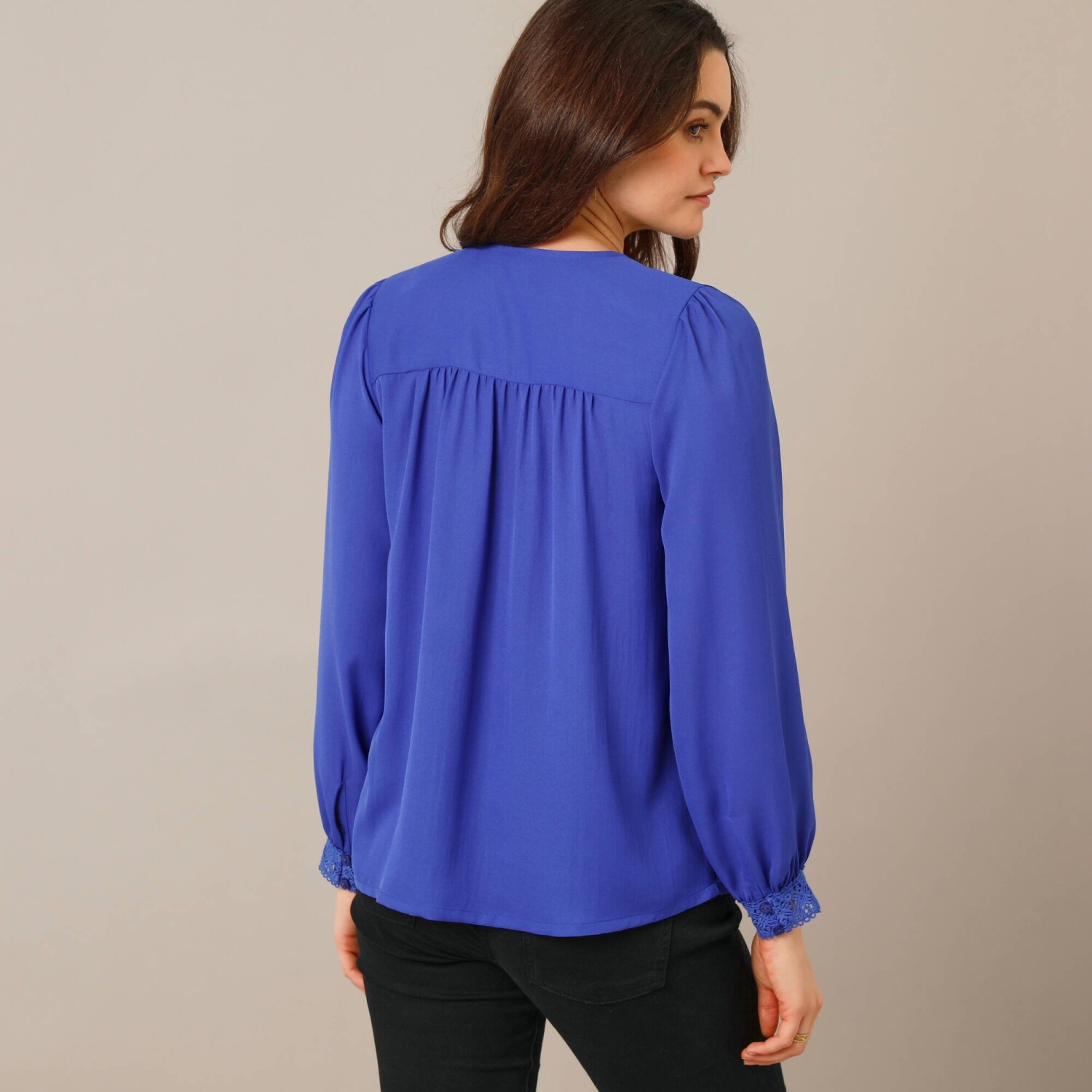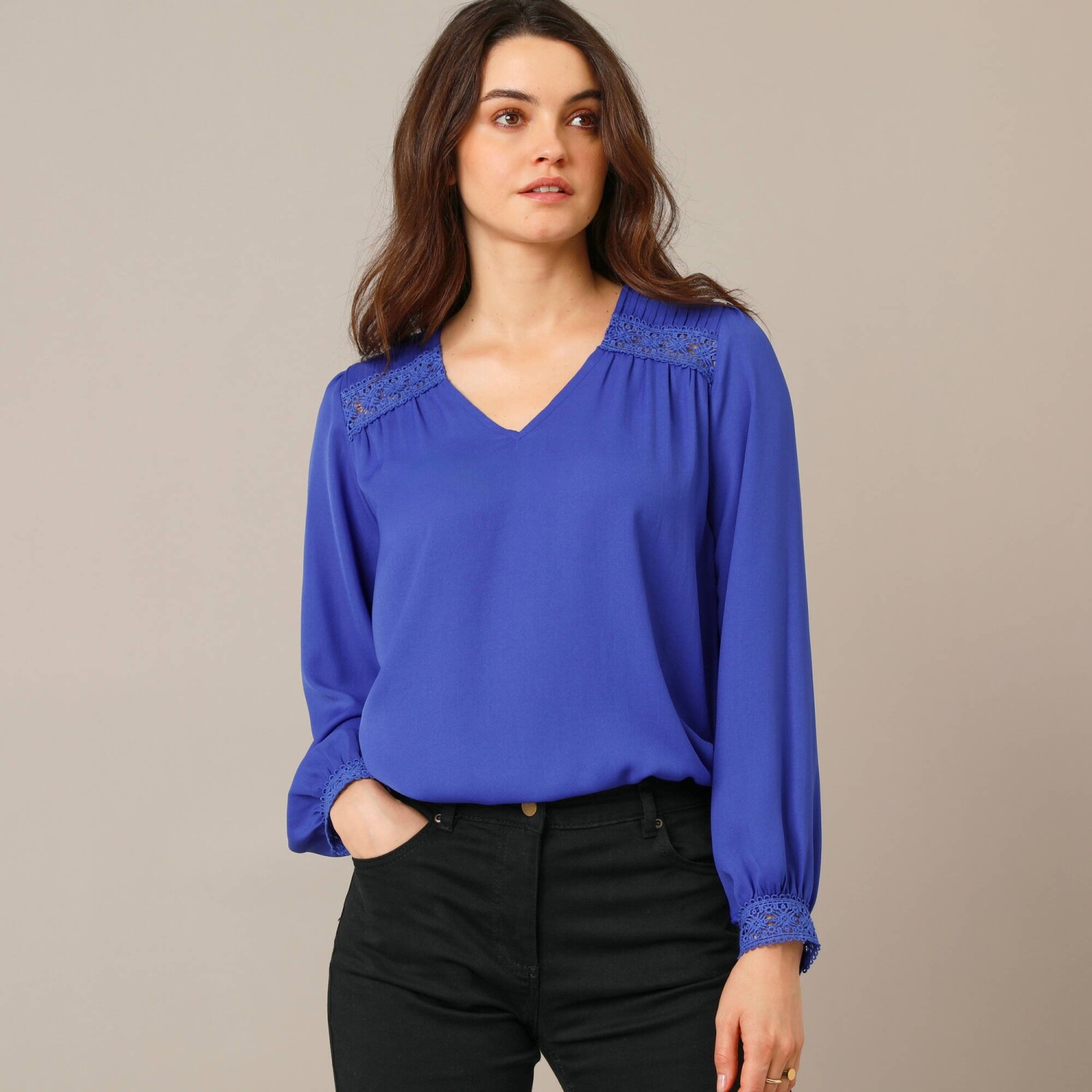 Halenka s propracovanými detaily rozzáří Vaše sezónní outfity! Z lehkého krepu, zdobená prošívanými sklady na ramenou a krajkovým prýmkem v horní části trupu a spodním lemu rukávů. Romantický kousek, který skvěle vynikne jak k džínům, tak k sukni. Výstřih do V. Vpředu v ramenou vsadka s prošitými sklady, ažurovou krajkou a nařasením. Vzadu sedlo a nařasení. Dlouhé rukávy s krajkou manžetou na knoflík. V ramenou a na manžetách nařasení. Rovný dolní lem. Lze prát v pračce.