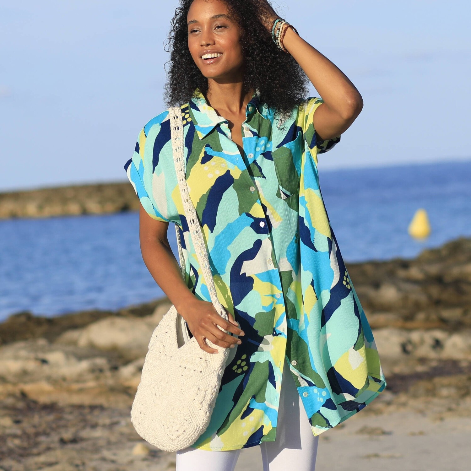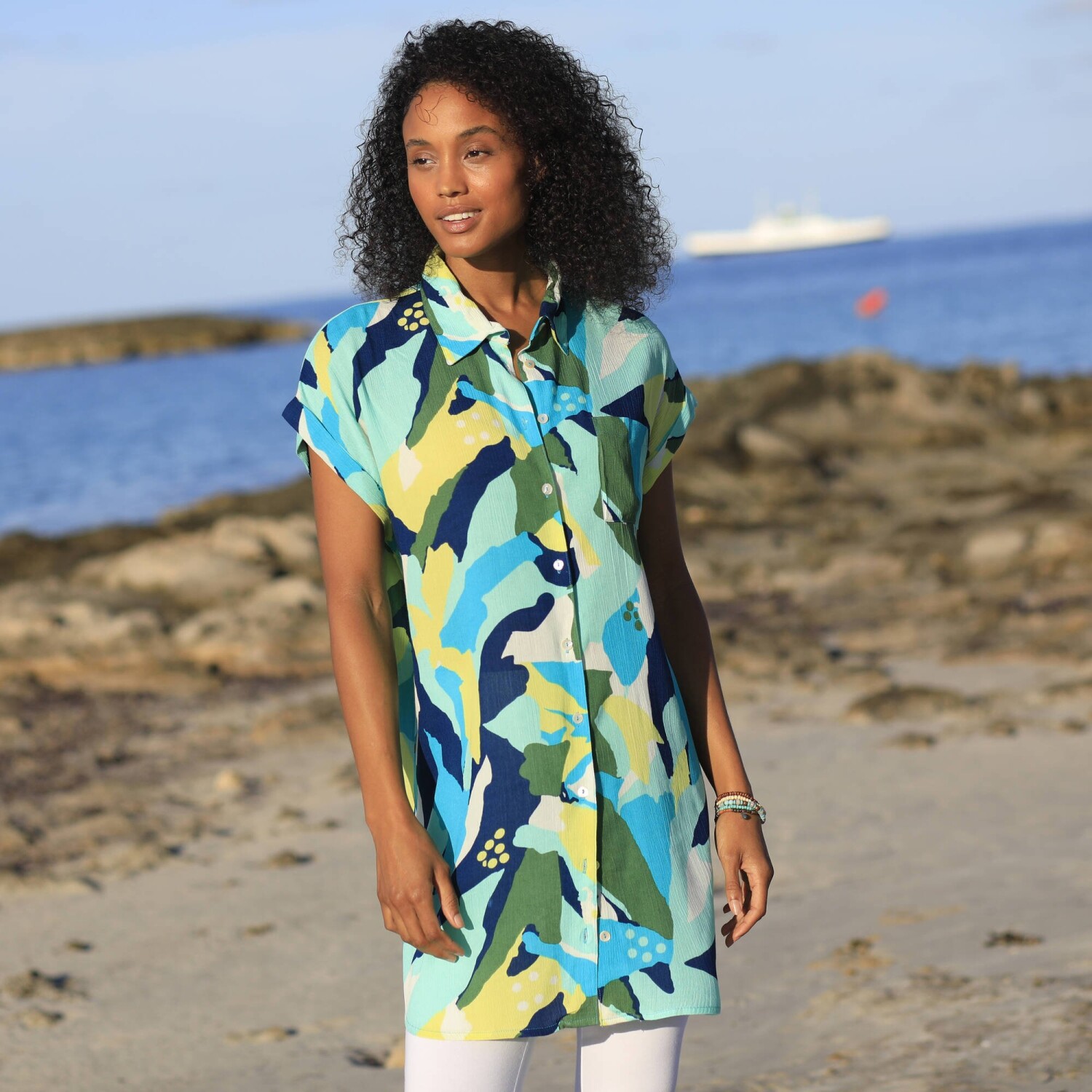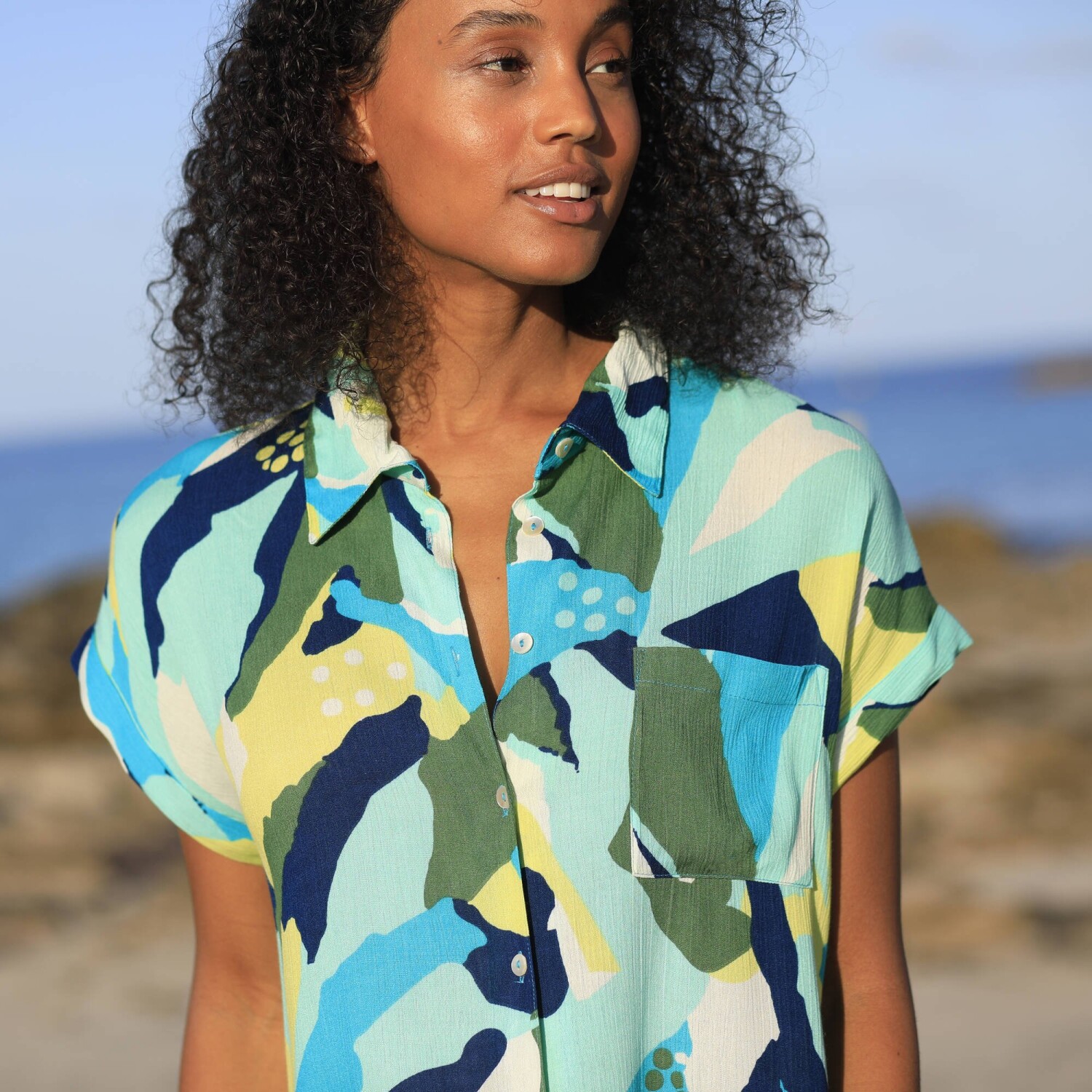 Lehoučký krepon, vzdušný střih a barevný potisk XXL vzoru: tyto plážové šaty lákají k odpočinku. Lehký krepon. Módní XXL potisk. Košilový límeček. Knoflíková léga, perleťové knoflíčky vpředu uprostřed. Krátké rukávy zakončené ohrnutím. 1 náprsní kapsa. Zakulacený dolní lem. Lze prát v pračce.