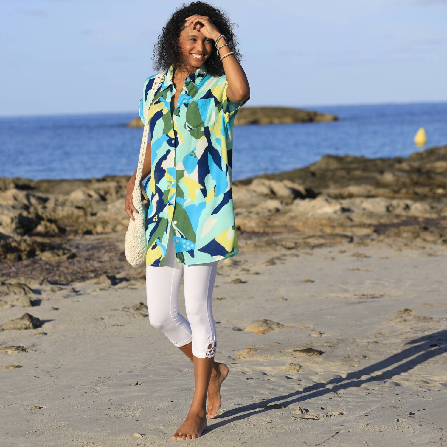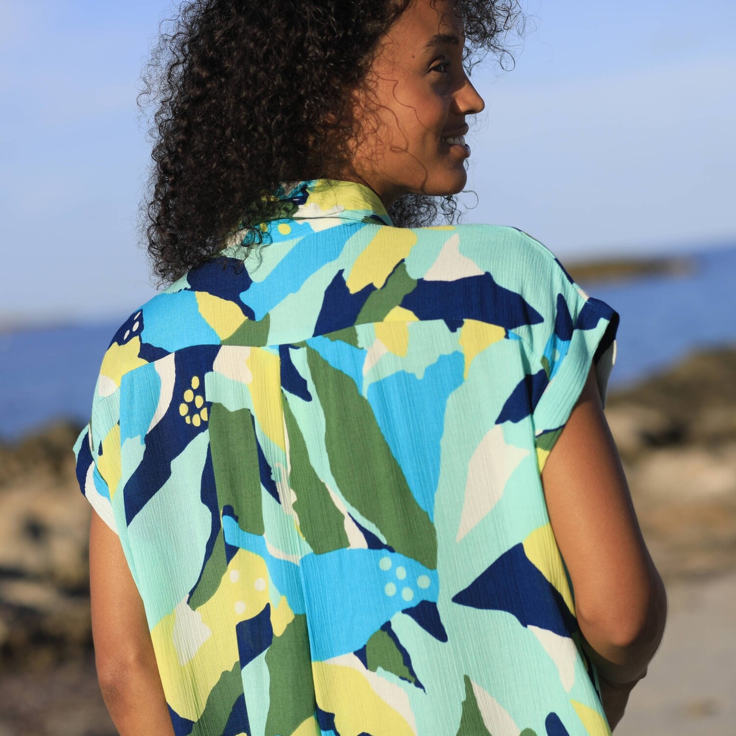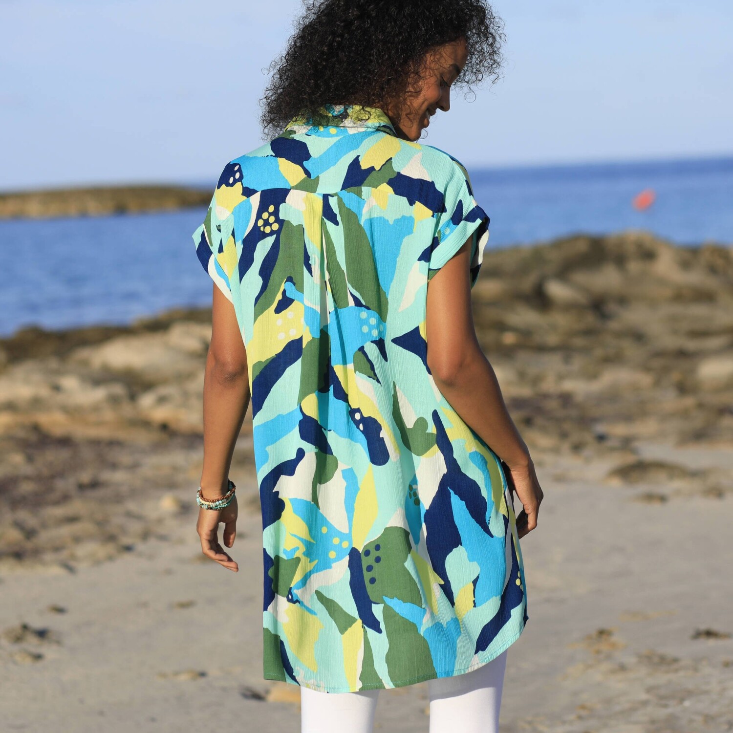Lehoučký krepon, vzdušný střih a barevný potisk XXL vzoru: tyto plážové šaty lákají k odpočinku. Lehký krepon. Módní XXL potisk. Košilový límeček. Knoflíková léga, perleťové knoflíčky vpředu uprostřed. Krátké rukávy zakončené ohrnutím. 1 náprsní kapsa. Zakulacený dolní lem. Lze prát v pračce.