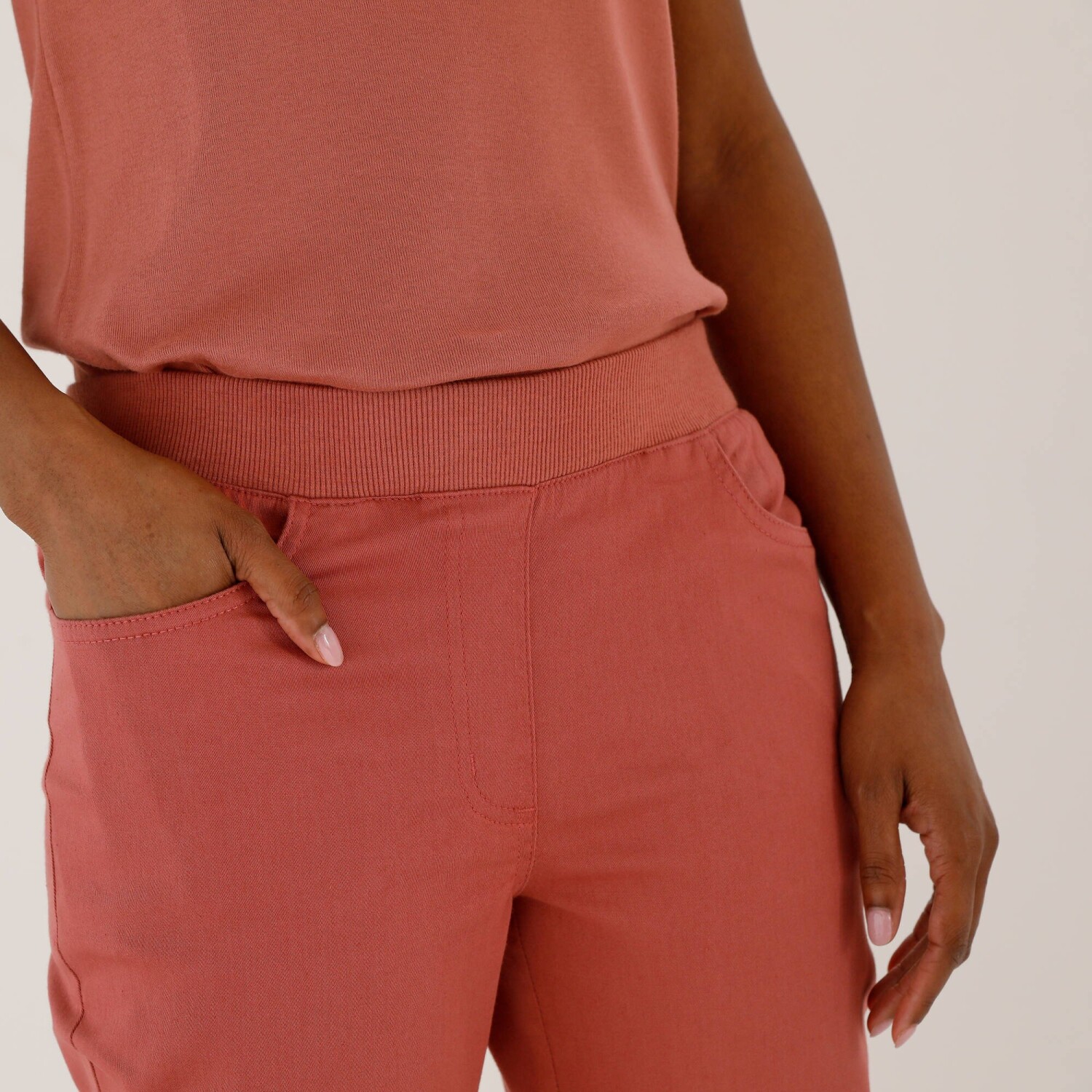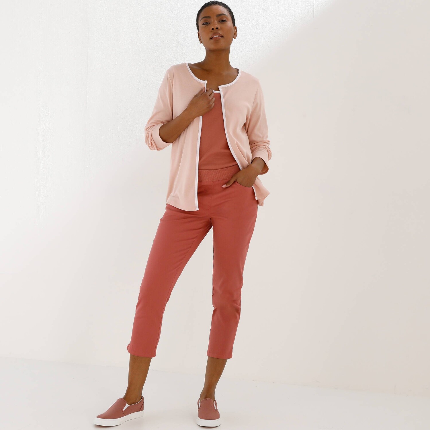 3/4 kalhoty jsou navržené z pružného úpletu, to vše pro Vaše pohodlí. Obohacené strečovou příměsí. Úzký střih. Běžná výška pasu. Žebrovaný pružný pas. Vsazený úpletový pas. Vzadu zvýšení. Falešný poklopec. 2 kapsy. Vzadu 2 našité kapsy. Na koncích nohavic rozparky. Standard 100 podle Oeko-Tex (CQ1216/3 IFTH). Tato známka označuje textilní výrobky, které byly podrobeny laboratorním testům na široké spektrum škodlivých látek a výrobek je bezpečný nad rámec platných norem. Perte na 30 °C.