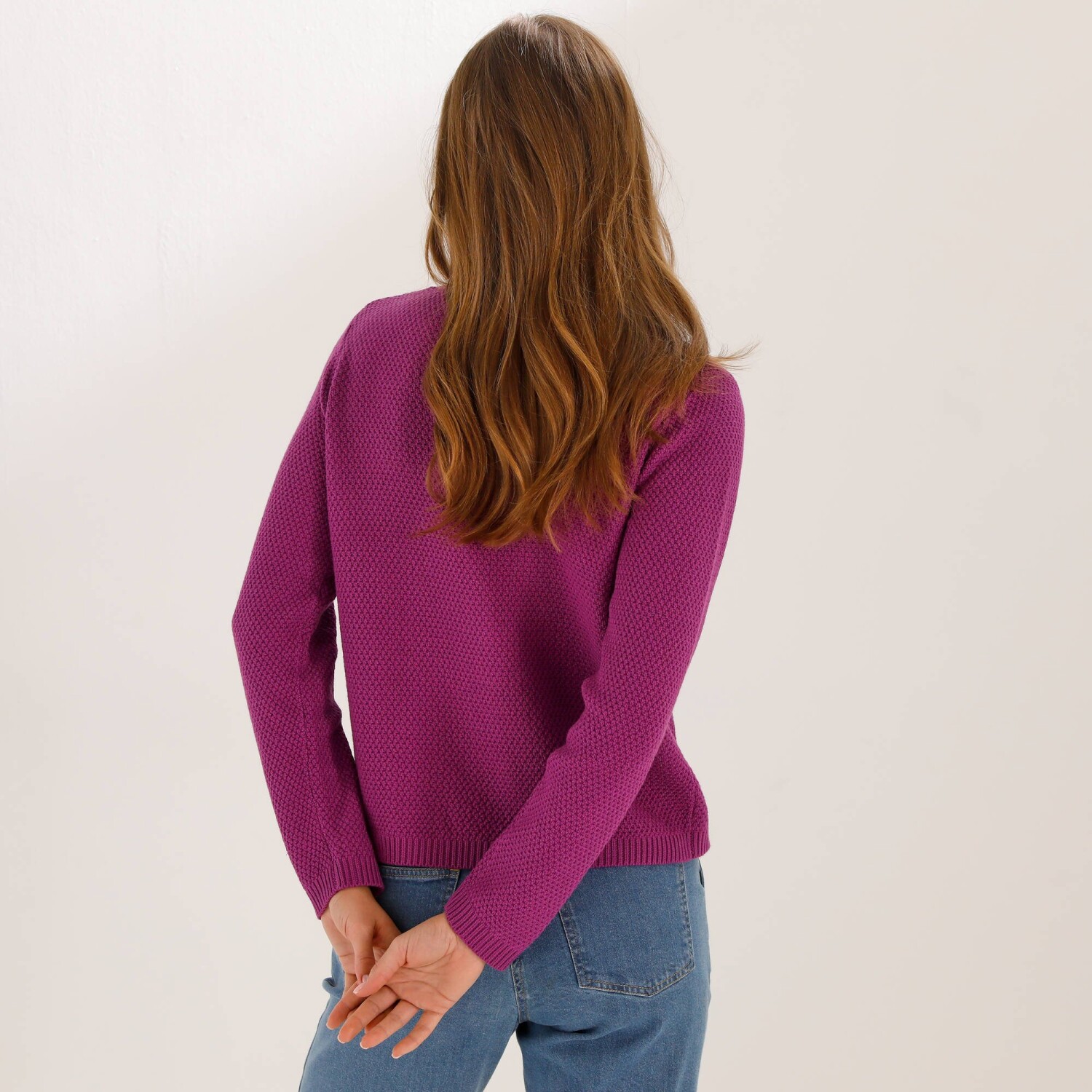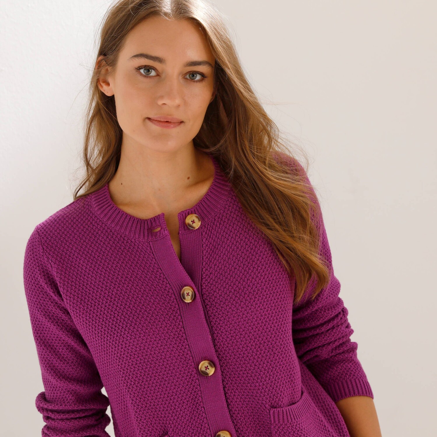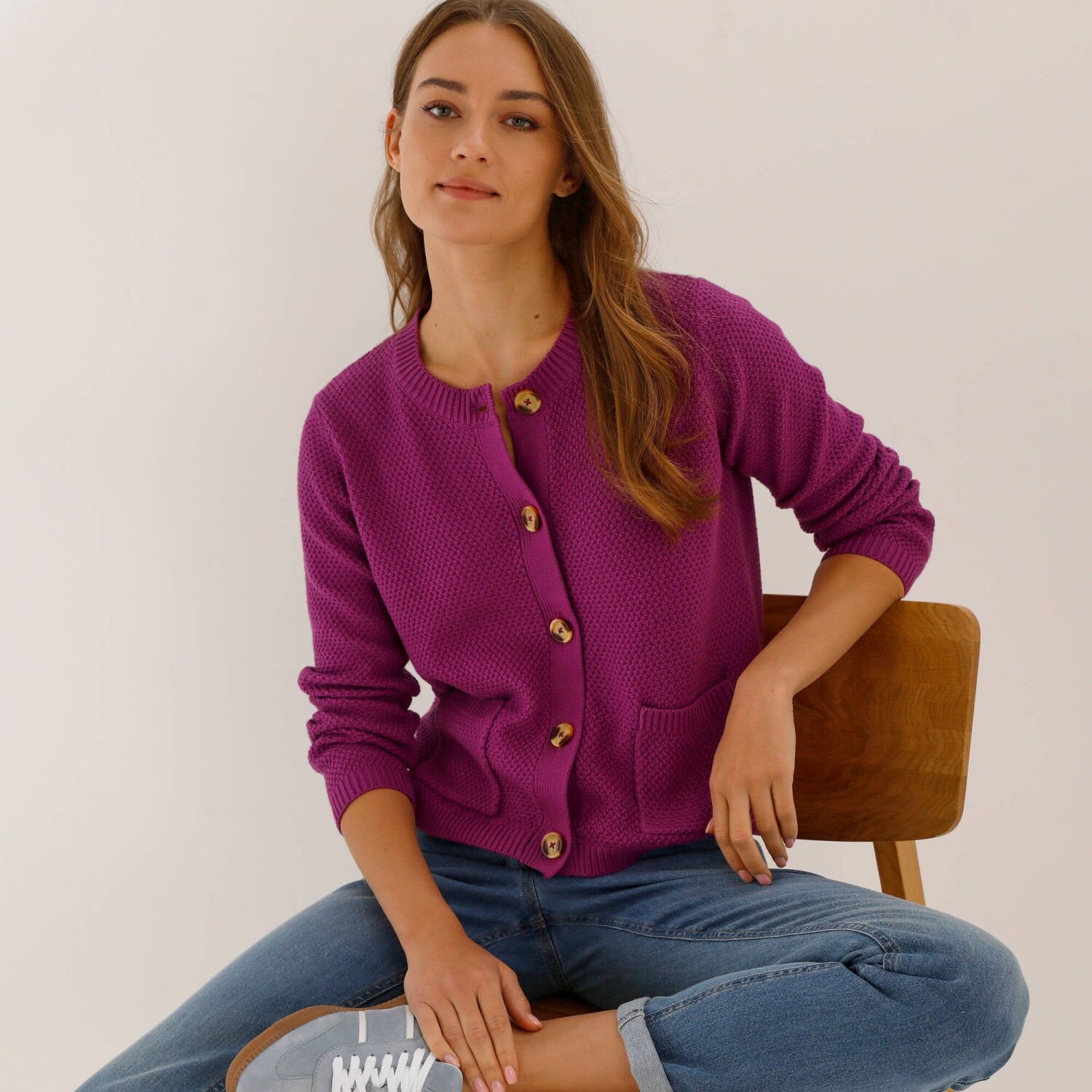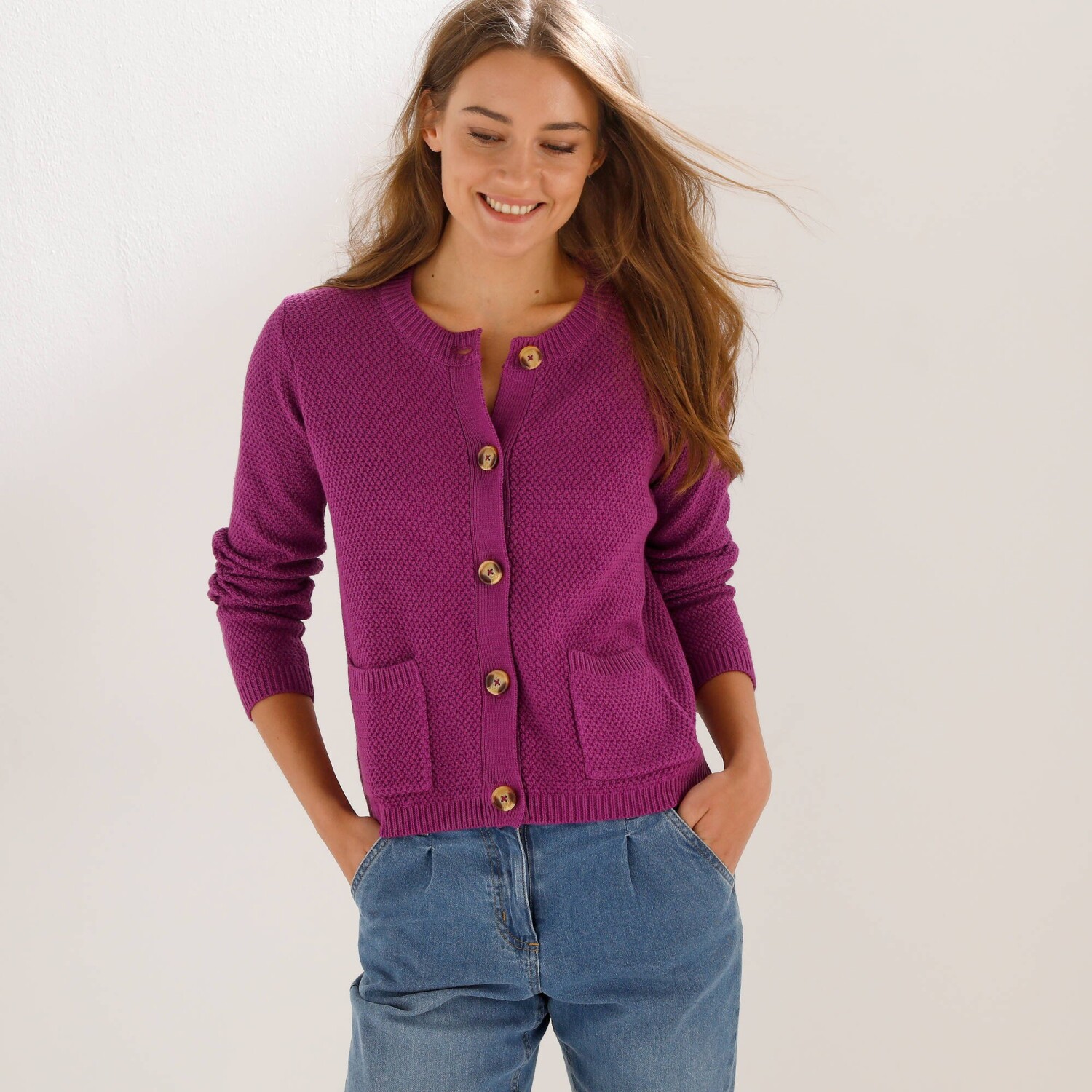 Propínací svetr snadno sladíte s oblíbenými džínami, sukní či košilí. Kulatý výstřih. Dlouhé rukávy. Knoflíky ve vzhledu rohoviny. 2 našité kapsy vpředu. Perličkový vzor. Lze prát v pračce.