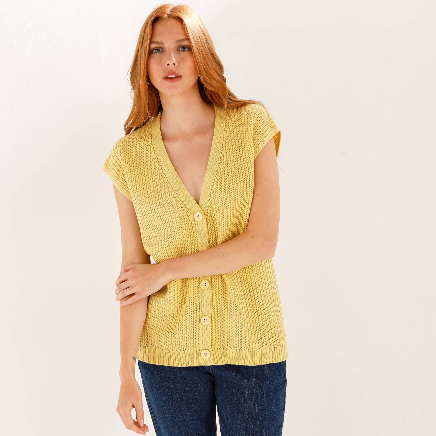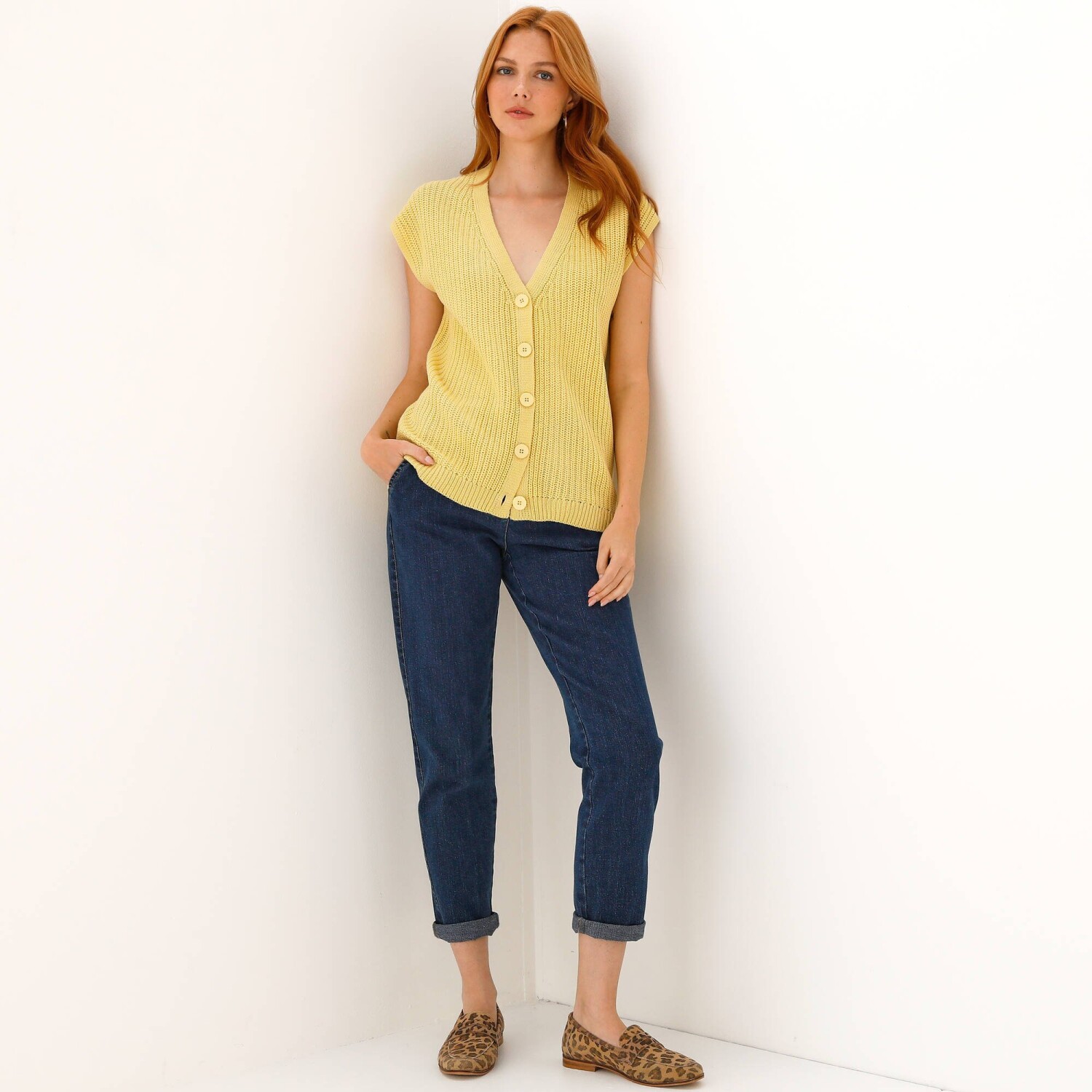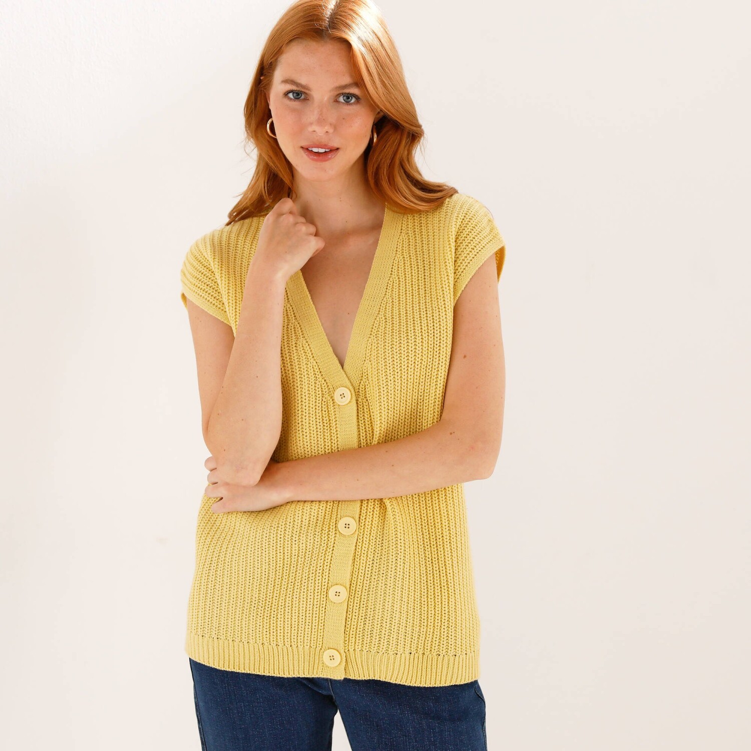 Skvělá pro každou příležitost, to je naše oblíbená vesta. Měkký úplet s hladkým vzorem. Hřejivý úplet. Hluboký výstřih do V. Knoflíková léga. Žebrované zakončení. Rovný dolní lem. Lze prát v pračce.