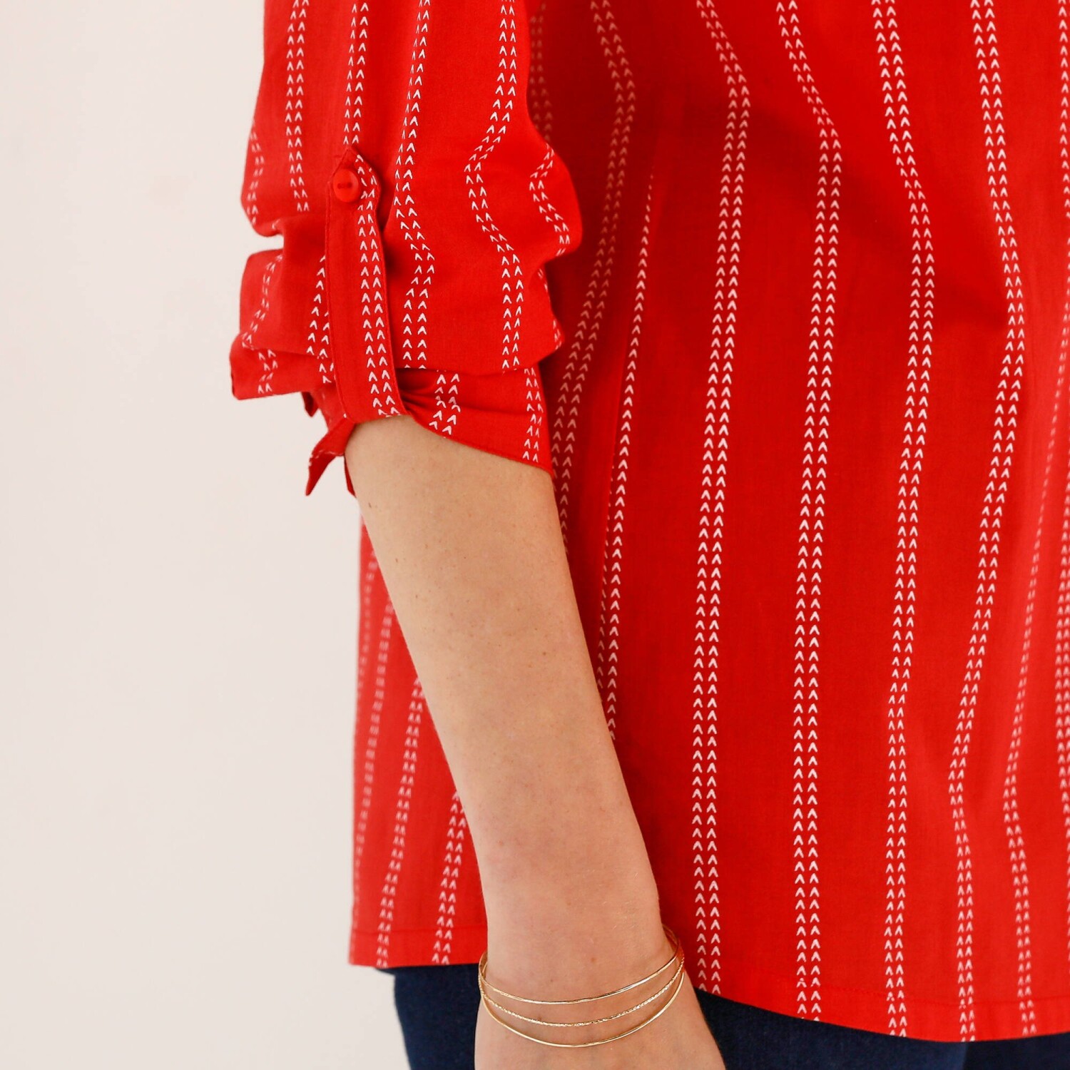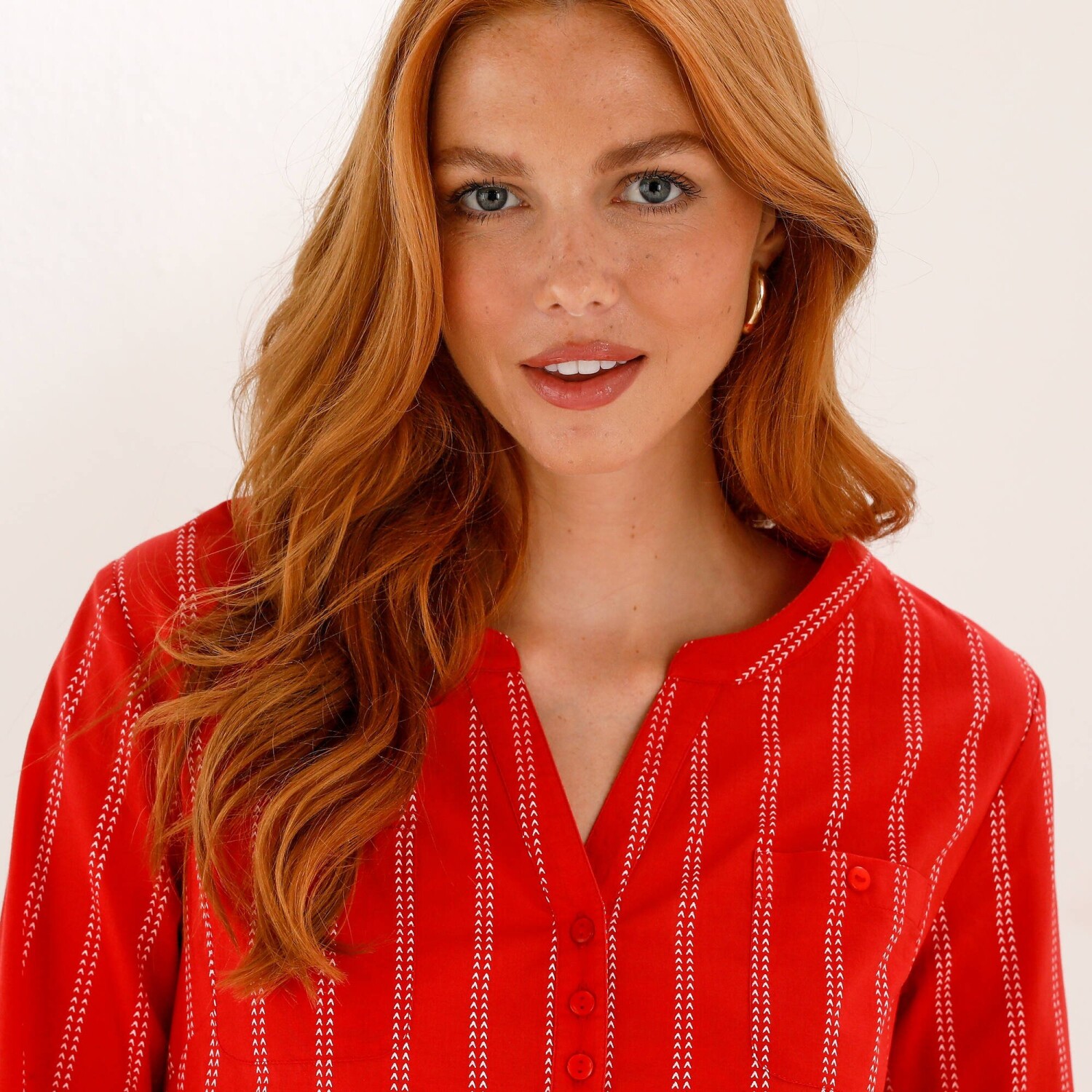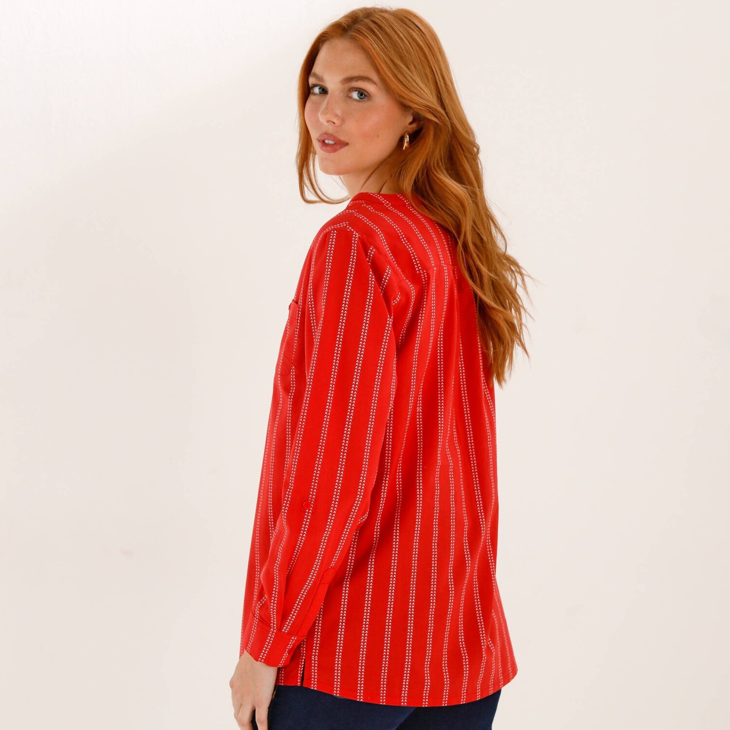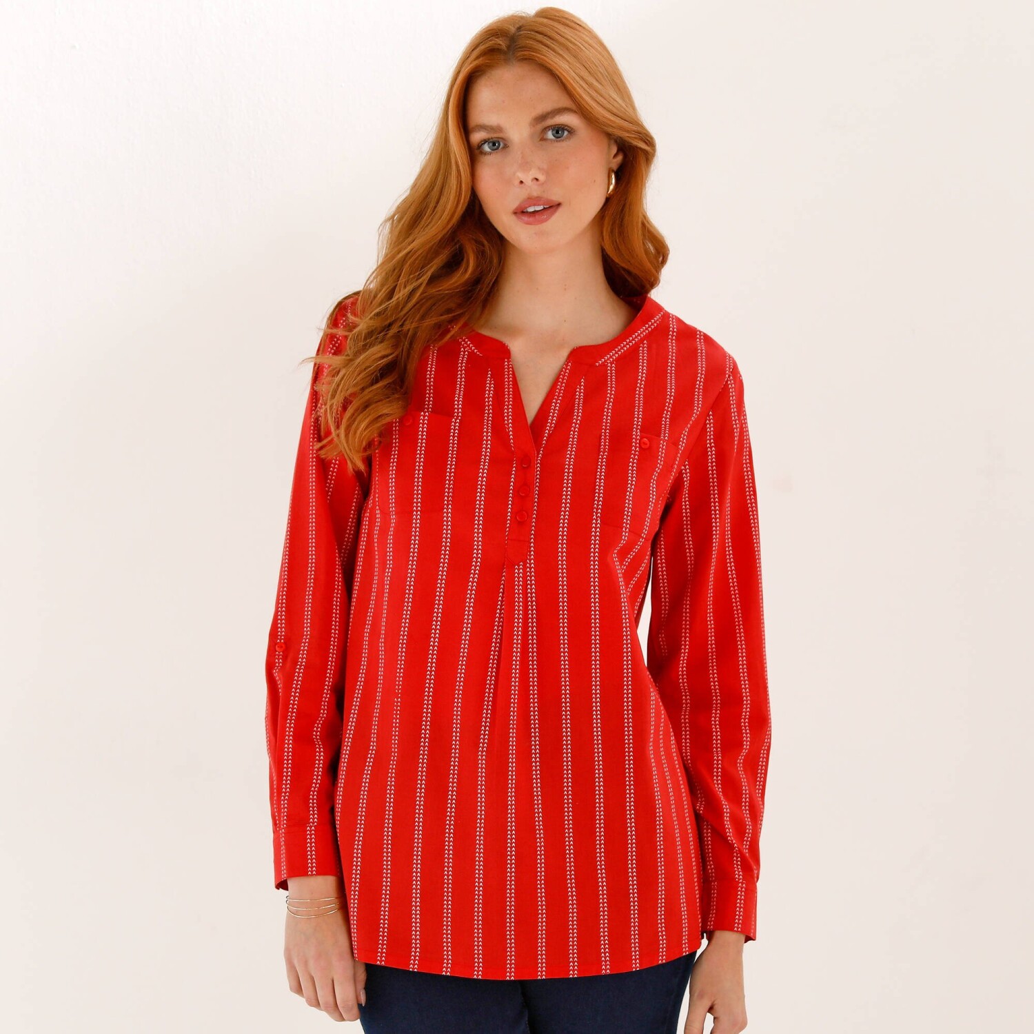Zeštíhlující, v trendy délce, tato tunika by Vám neměla uniknout! Pruhovaná tunika má výstřih djellaba s knoflíky a sklady. 2 náprsní kapsy na knoflík. Prsní záševky. Vzadu přestřižení a nařasení. Dlouhé rukávy s knoflíkovou patkou pro 3/4 ohrnutí. Knoflíčkové manžety. Zakulacený spodní lem. Postranní rozparky. Perte na 30 °C.