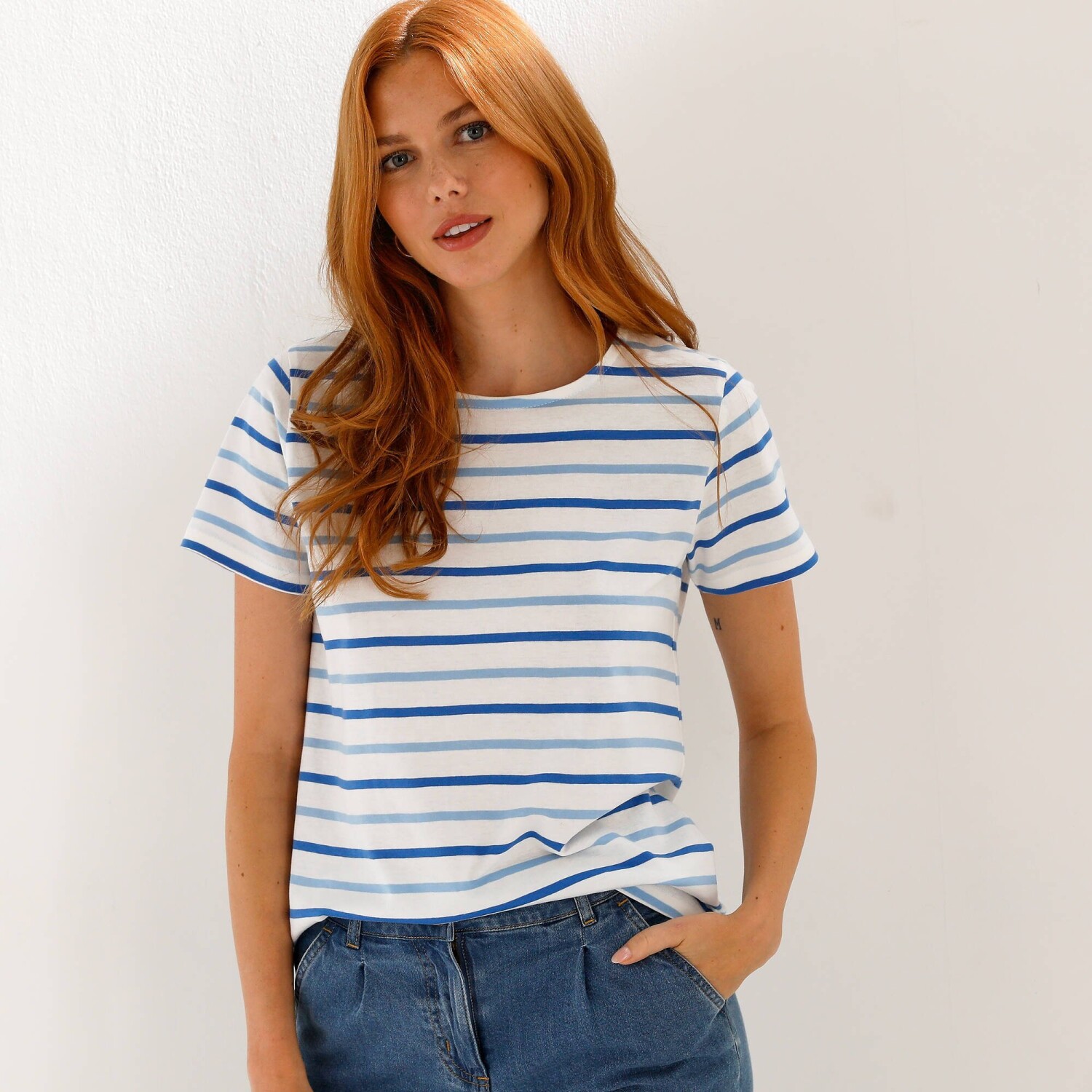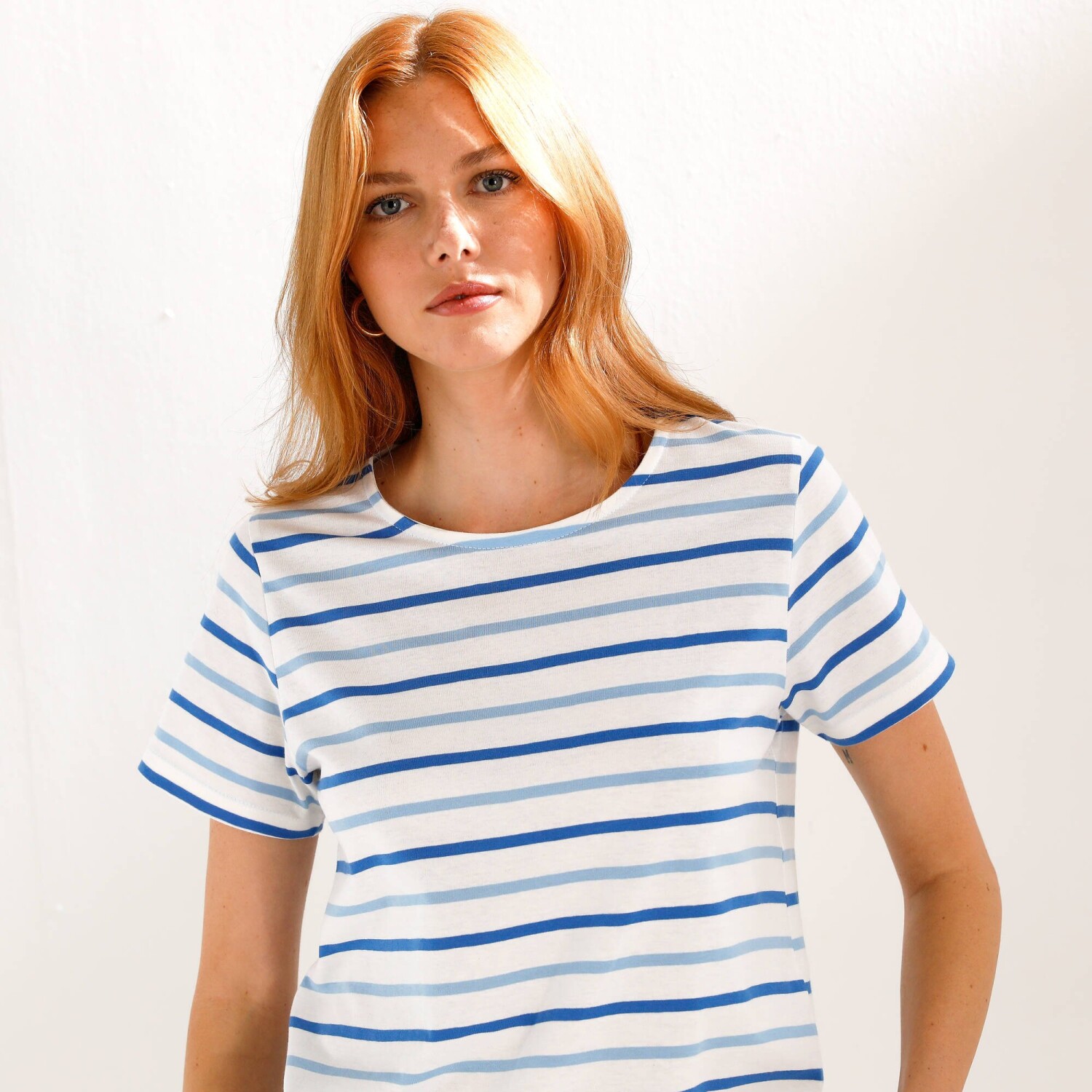 Proužkované tričko s krátkými rukávy sluší každé ženě. Z bavlněného žerzeje. Kulatý výstřih. Krátké rukávy. Barevné pruhy. Rovný spodní lem. Standard 100 podle Oeko-Tex (n° CQ 1216 / 3 IFTH). Tato známka označuje textilní výrobky, které byly podrobeny laboratorním testům na široké spektrum škodlivých látek a výrobek je bezpečný nad rámec platných norem. Lze prát v pračce.