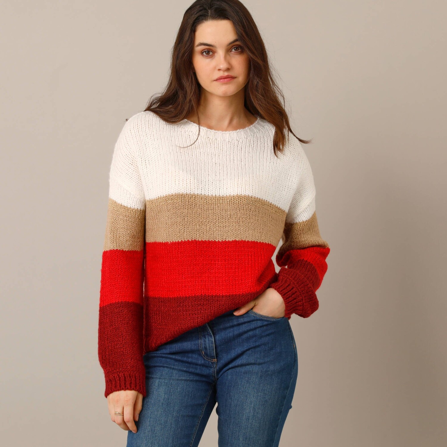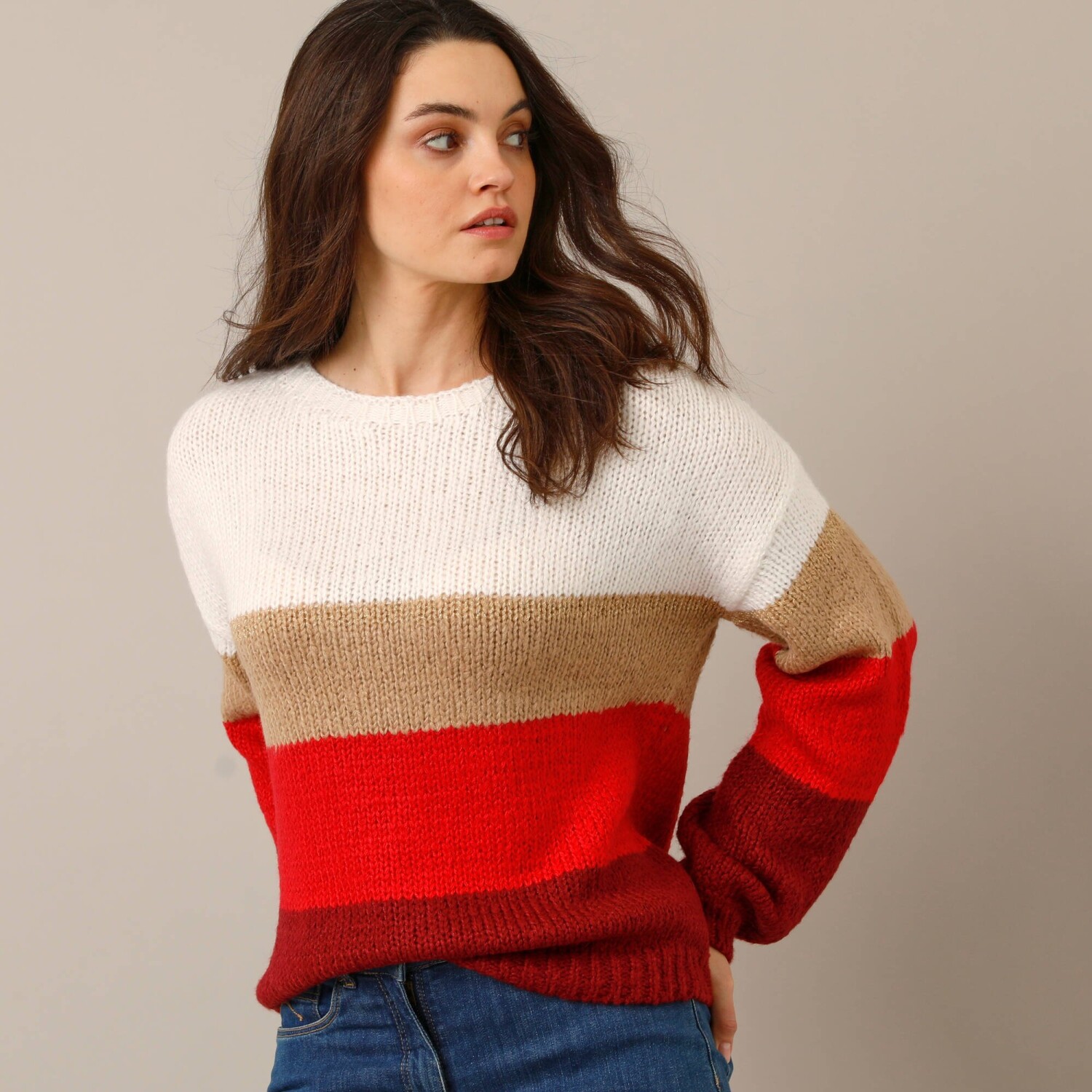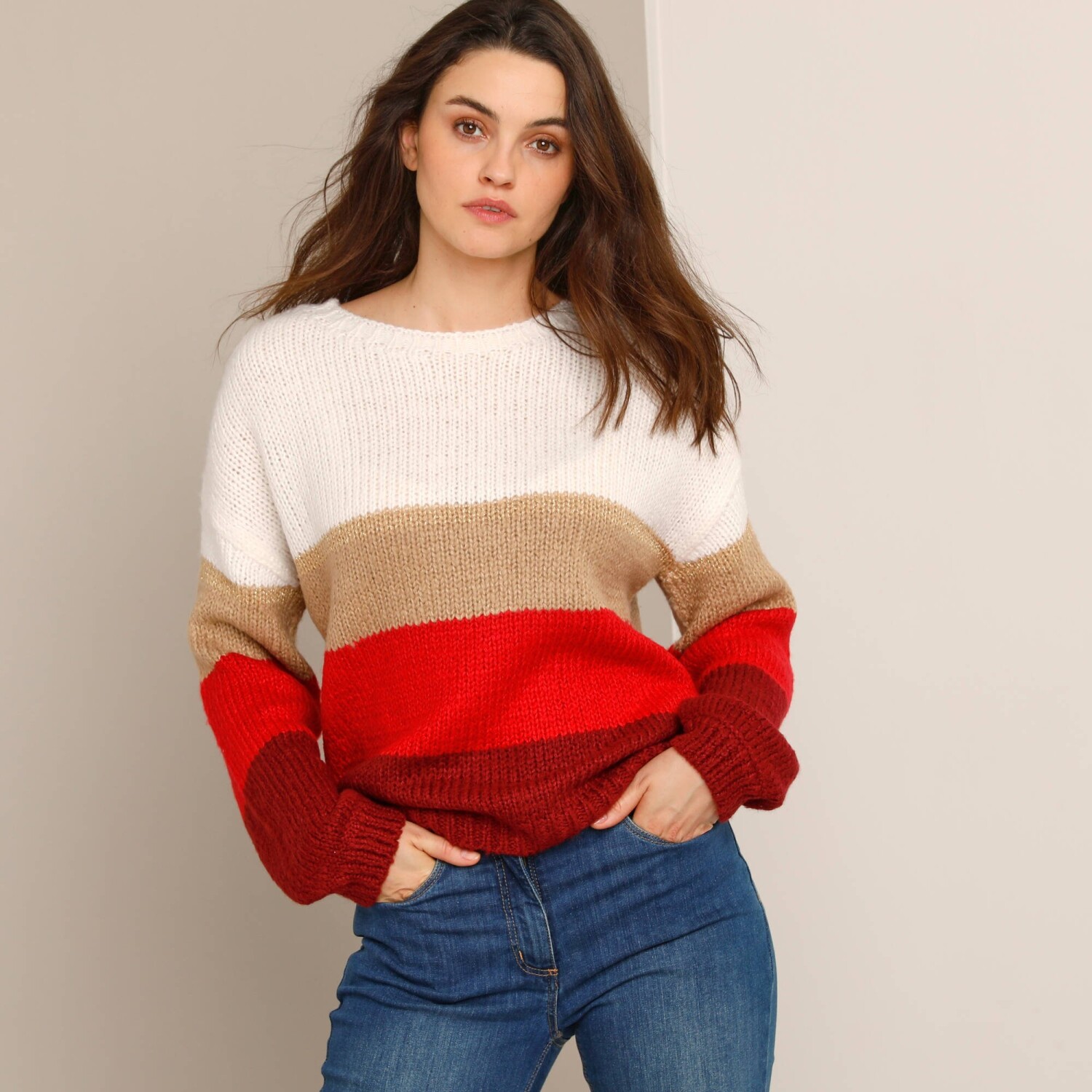 Co je lepší než hebký úplet, který zahřeje v chladných dnech? My Vám ho přinášíme na pruhovaném pulovru mohérovém na dotek. Měkký úplet. Volný střih. Zakulacený výstřih. Dlouhé halenkové rukávy. Spadlá ramena. Pruhy se třpytivým vláknem. Rovný dolní lem. Lze prát v pračce.