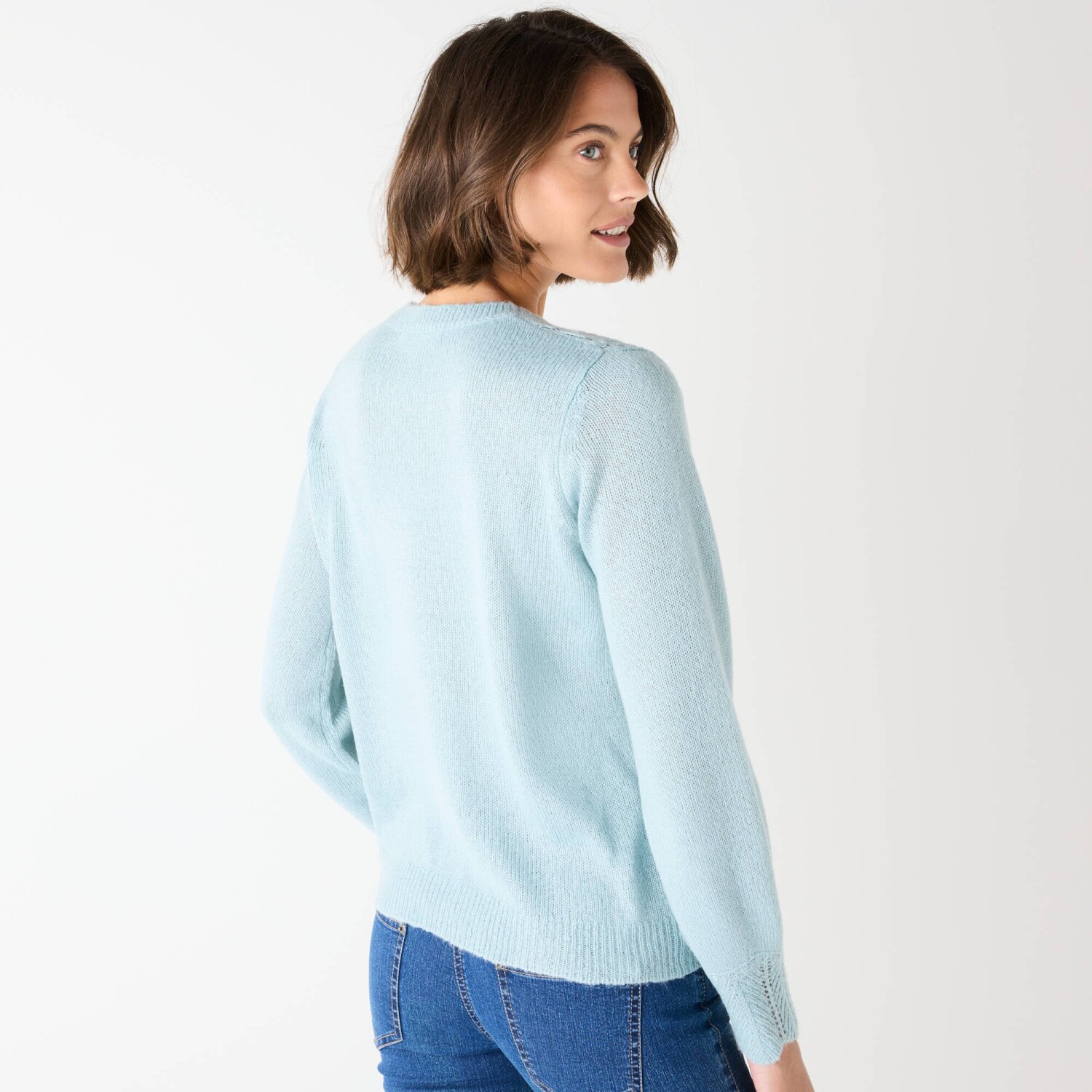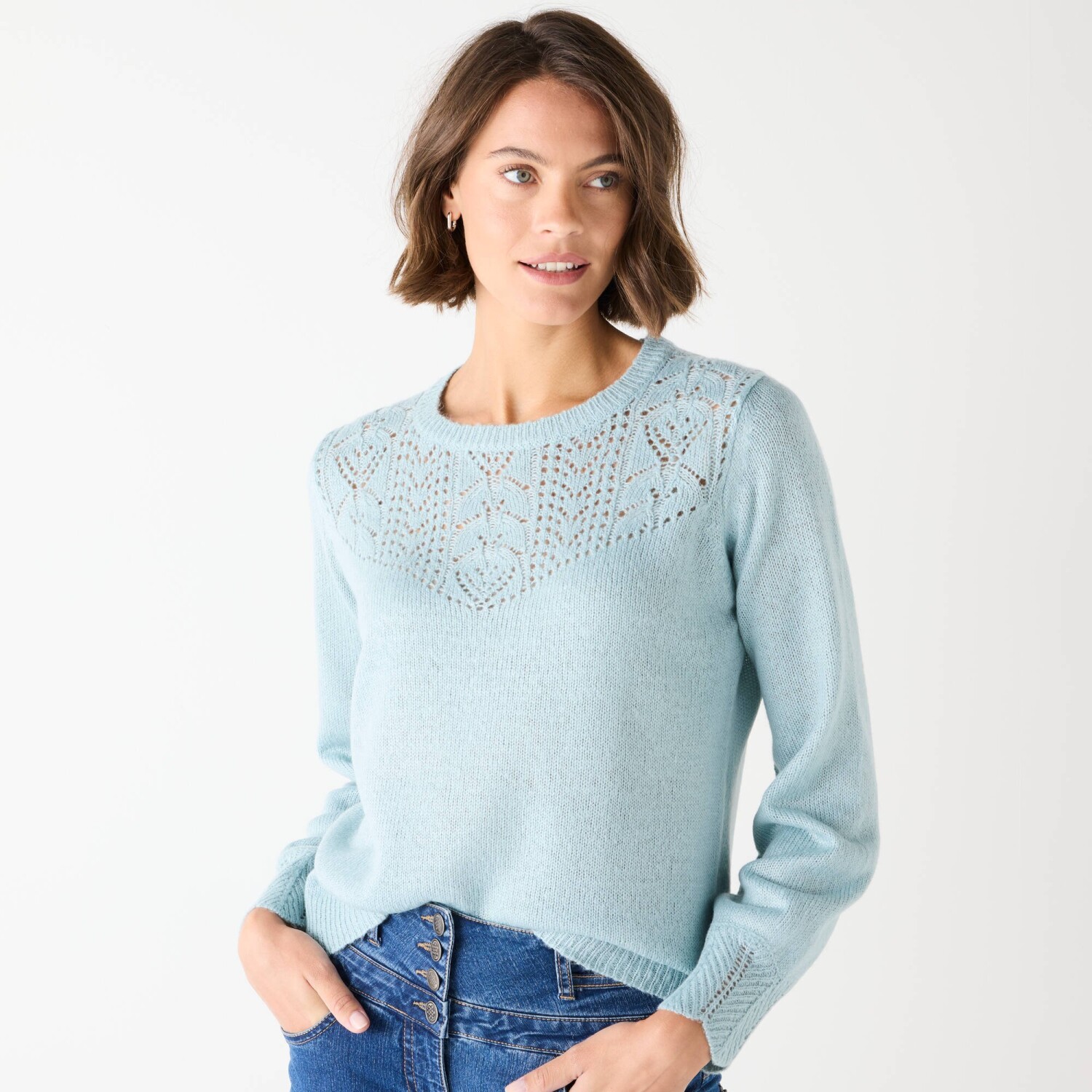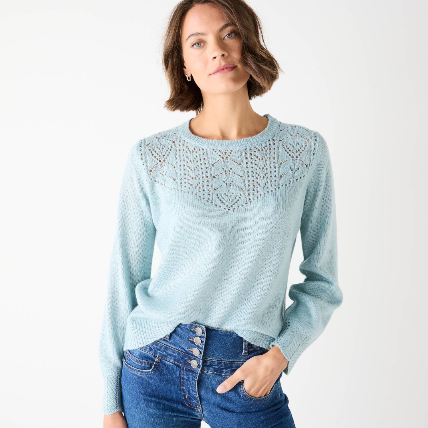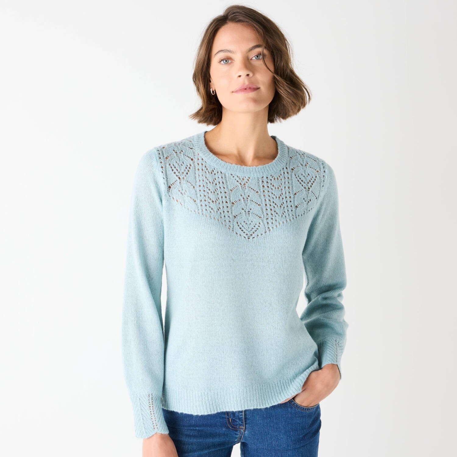 Ženský pulovr příjemně zahřeje Váš zimní look. Jemný na dotek. Rubový žerzej a ažurové detaily na předním dílu. Kulatý výstřih s ažurovým zdobením. Dlouhé halenkové rukávy. Manžety s vlnkovaným zakončením a ažurovým vzorem. Rovný dolní lem. Lze prát v pračce.