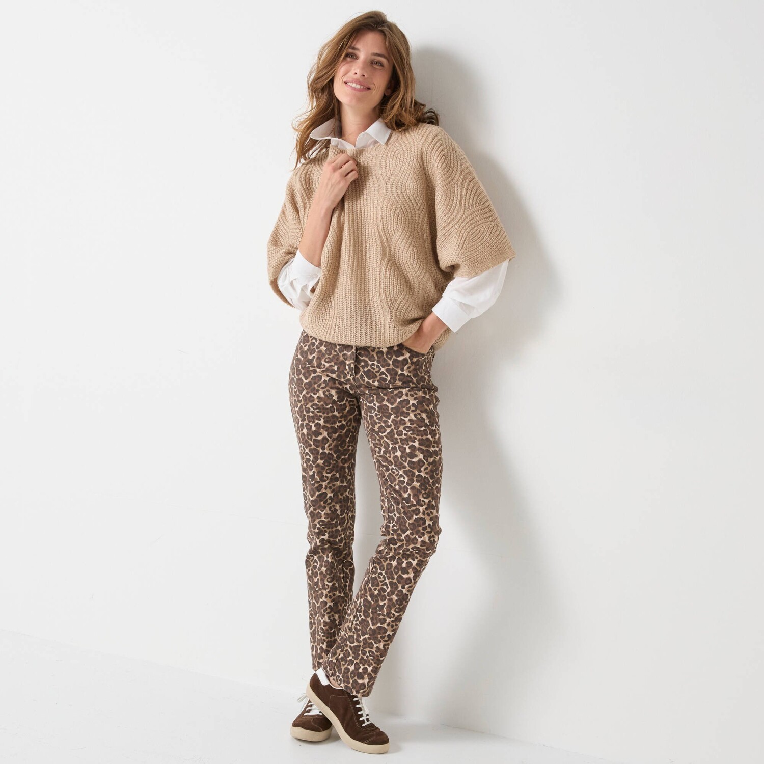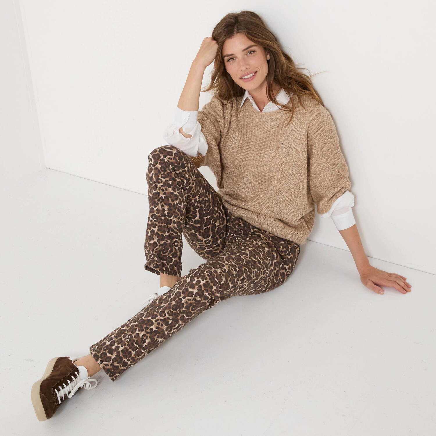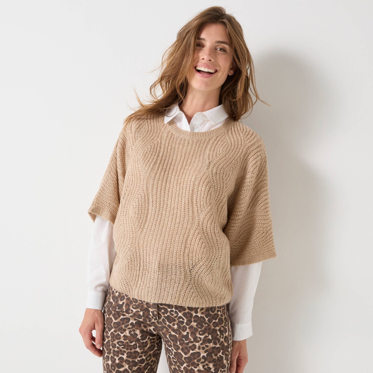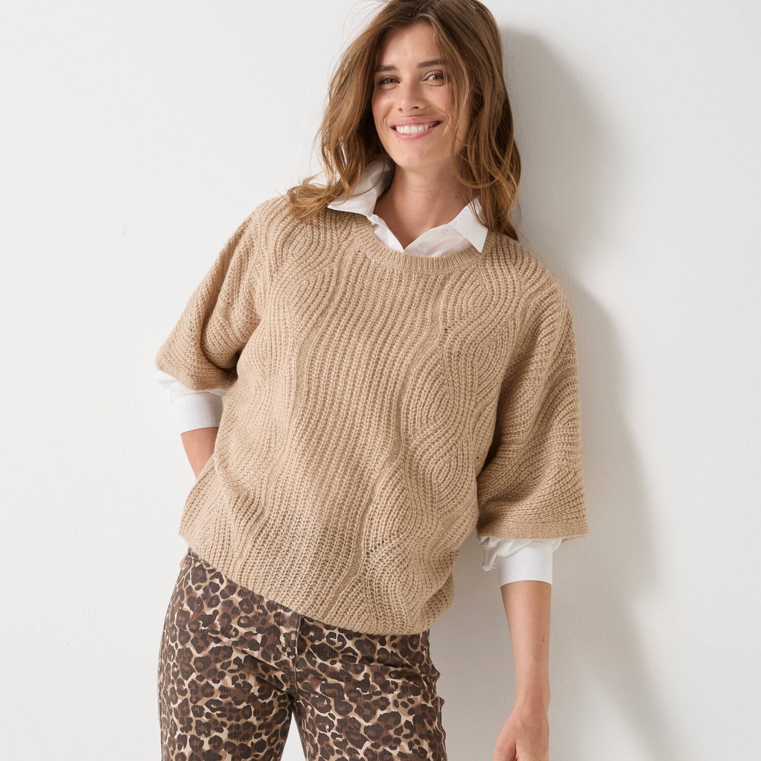 Ležérní a zároveň stylový pulovr je zpět na módní scéně! Z úpletu mohérového na dotek. Ideální pro vrstvení se spodním tričkem nebo kostkovanou flanelovou košilí. Střih s netopýřími rukávy. Kulatý uvolněný výstřih. Netopýří rukávy k loktům. Spadlá ramena. Copánkový a hladký pletený vzor. Rovný dolní lem. Lze prát v pračce.