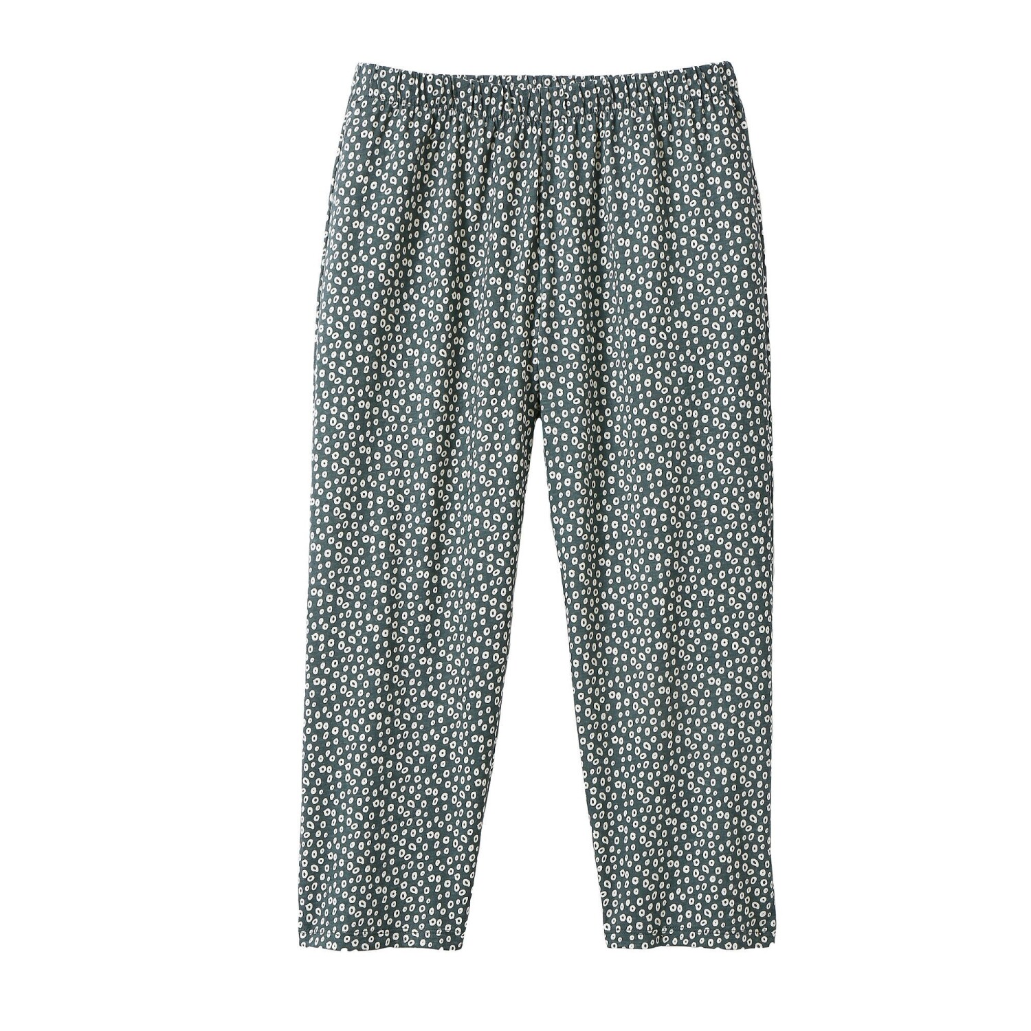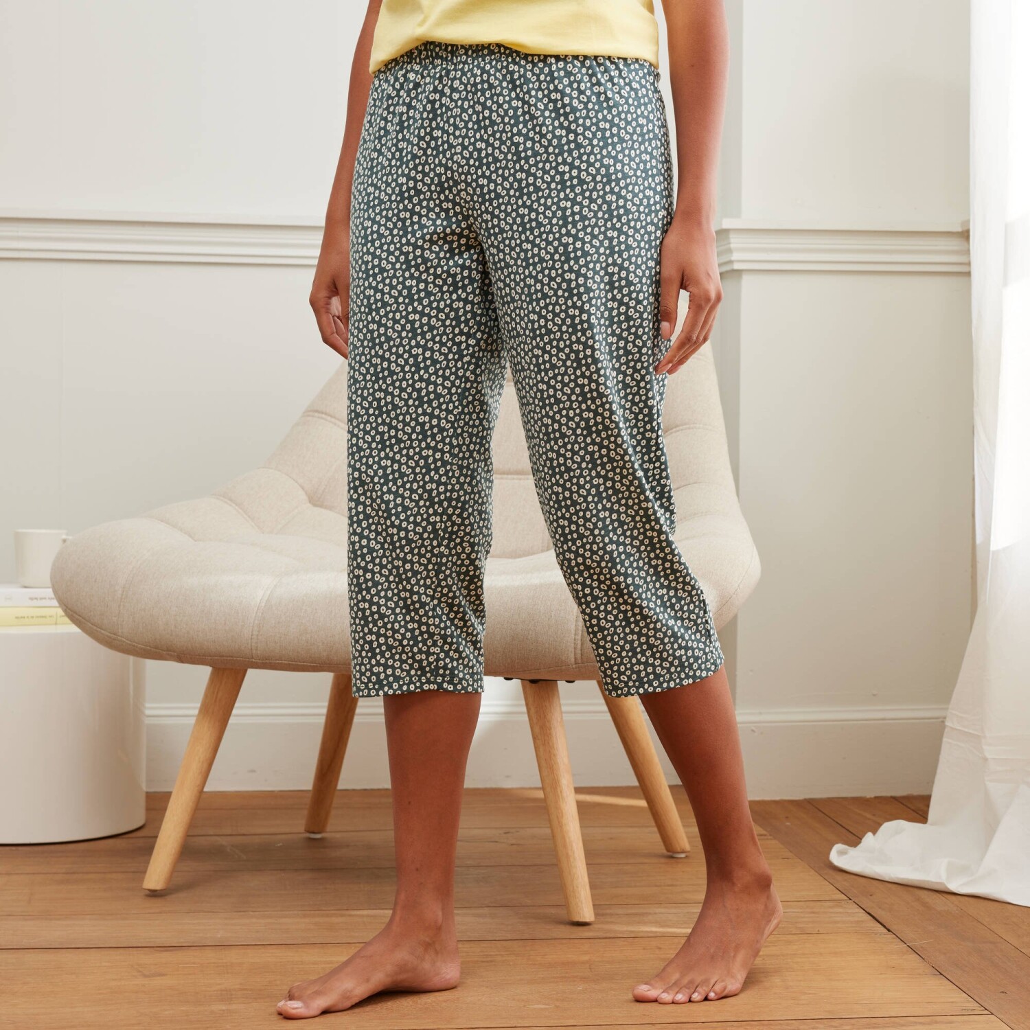 Vychutnejte si pohodlí 3/4 pyžamových kalhot s minimalistickým ženským potiskem. Pružný pas. Celopotisk minimalistického vzoru. Rovné nohavice. Bavlněný žerzej, snadná údržba. Standard 100 podle Oeko-Tex (n° CQ 1216 / 3 IFTH). Tato známka označuje textilní výrobky, které byly podrobeny laboratorním testům na široké spektrum škodlivých látek a výrobek je bezpečný nad rámec platných norem. Lze prát v pračce. Nature Sauvage = Divoká příroda.