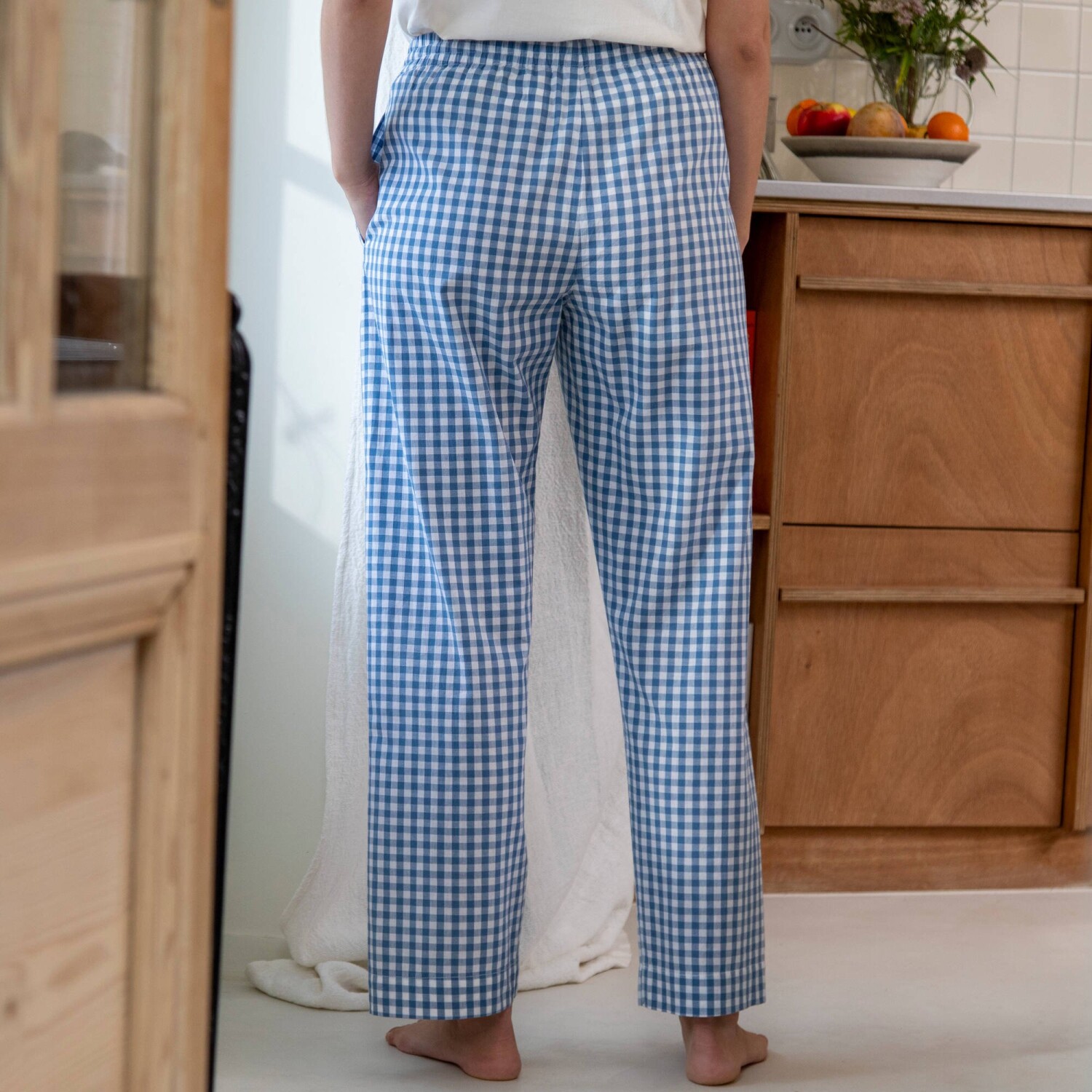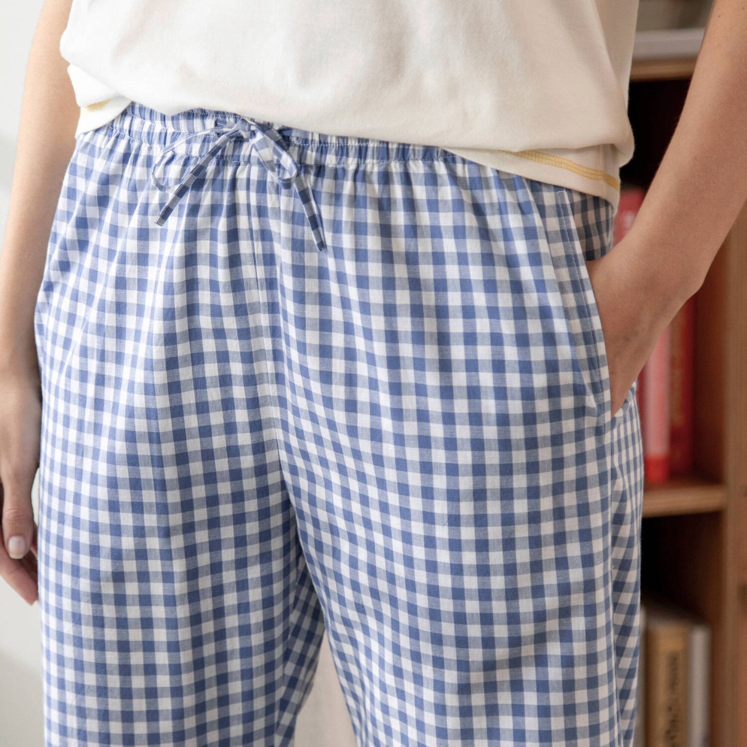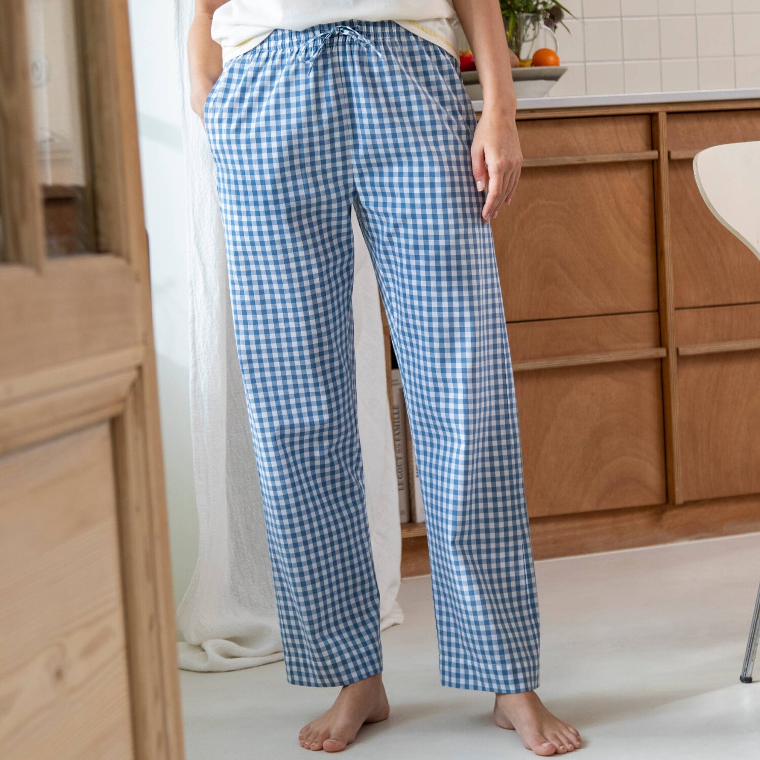 Vintage kostkovaný vzor pro pyžamové široké kalhoty. Elastický pas s protaženou šňůrkou. Postranní kapsy. Rovné široké nohavice. Lze prát v pračce.