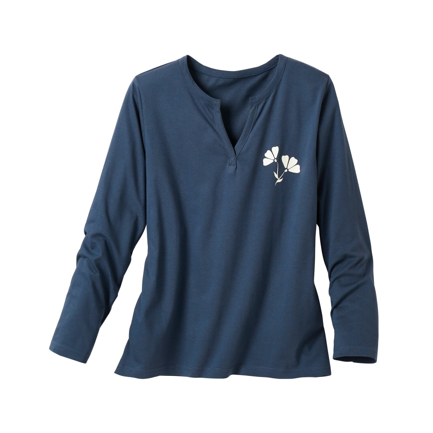 Pyžamové tričko s potiskem květin oplývá svěžestí a barvami. Materiál příjemný na nošení. Snadná údržba. Zakulacený výstřih s průstřihem. Na hrudníku středový potisk. Dlouhé rukávy. Zakončení prošitím. Standard 100 podle Oeko-Tex. Tato známka označuje textilní výrobky, které byly podrobeny laboratorním testům na široké spektrum škodlivých látek a výrobek je bezpečný nad rámec platných norem. Lze prát v pračce.