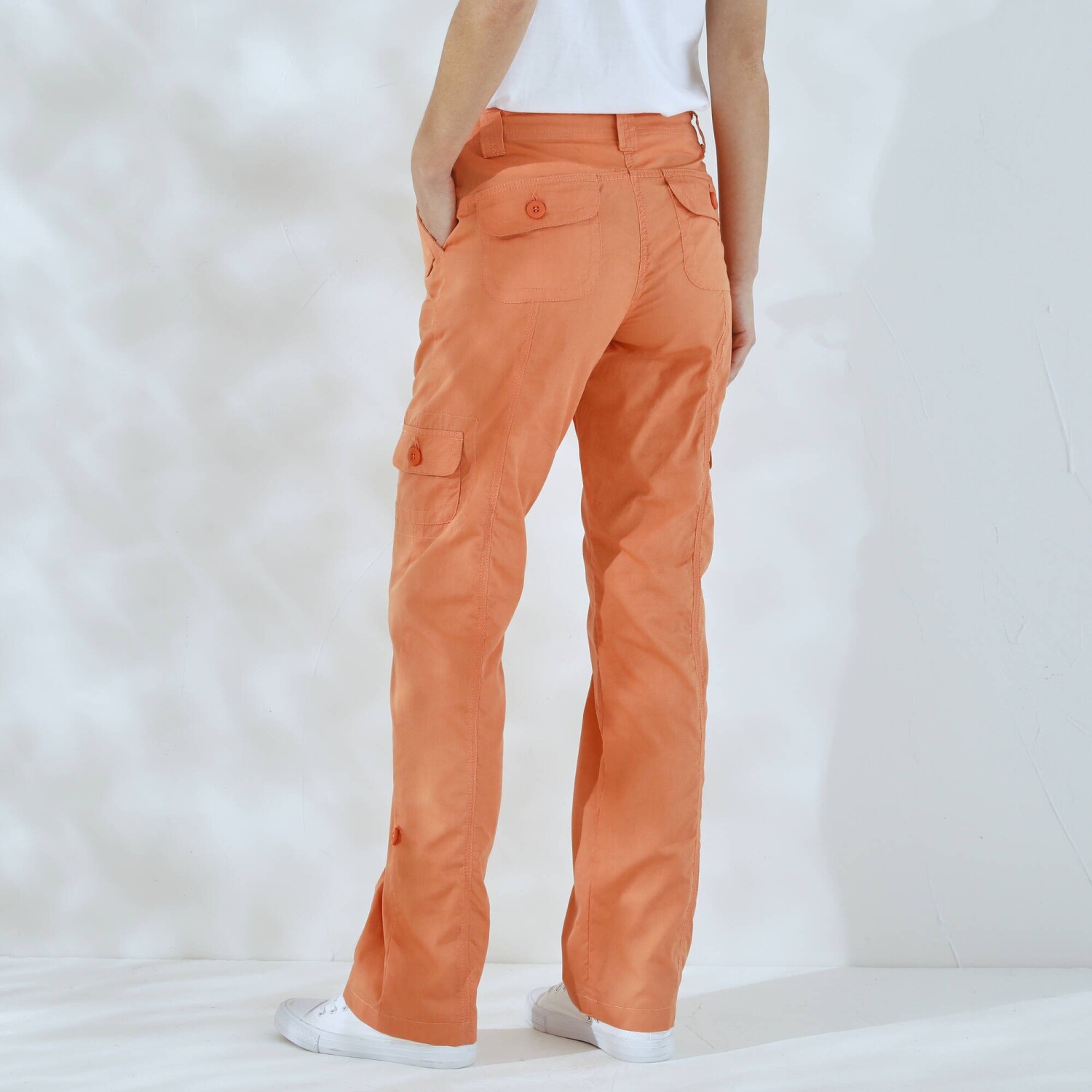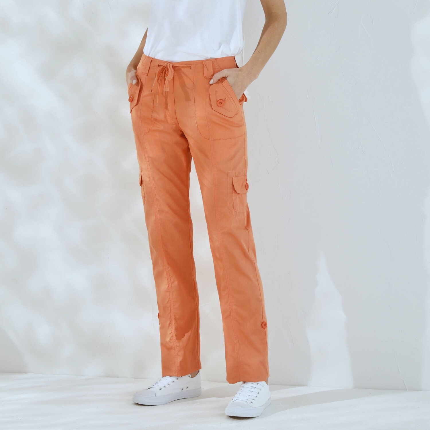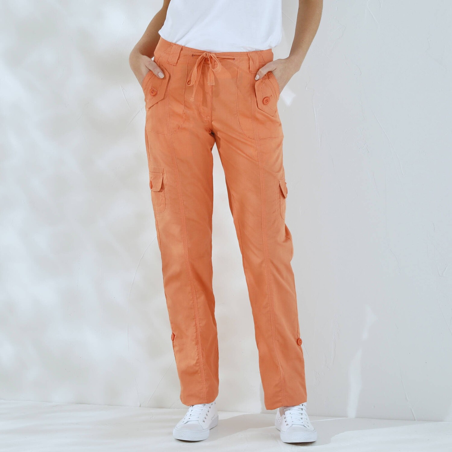 Módní kalhoty s kapsami perfektně doplní tričko i svetr. Běžná výška pasu. V pase poutka a šňůrka na zavázání. Zapínání na zip a knoflík. Vpředu 2 originální kapsy s knoflíkovou klopou. 2 postranní našité kapsy s knoflíkovou klopou. Vzadu 2 našité kapsy. Kontrastní prošití vpředu a vzadu. Vzadu zvýšený díl. Na ohrnutí pomocí knoflíkové patky. Standard 100 podle Oeko-Tex (n° CQ 1216 / 3 IFTH). Tato známka označuje textilní výrobky, které byly podrobeny laboratorním testům na široké spektrum škodlivých látek a výrobek je bezpečný nad rámec platných norem. Perte na 30 °C.