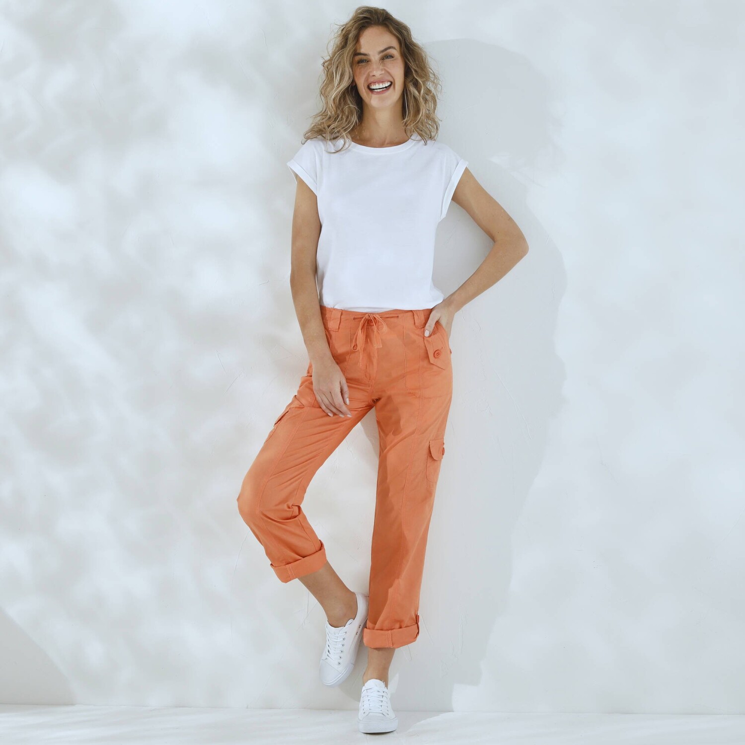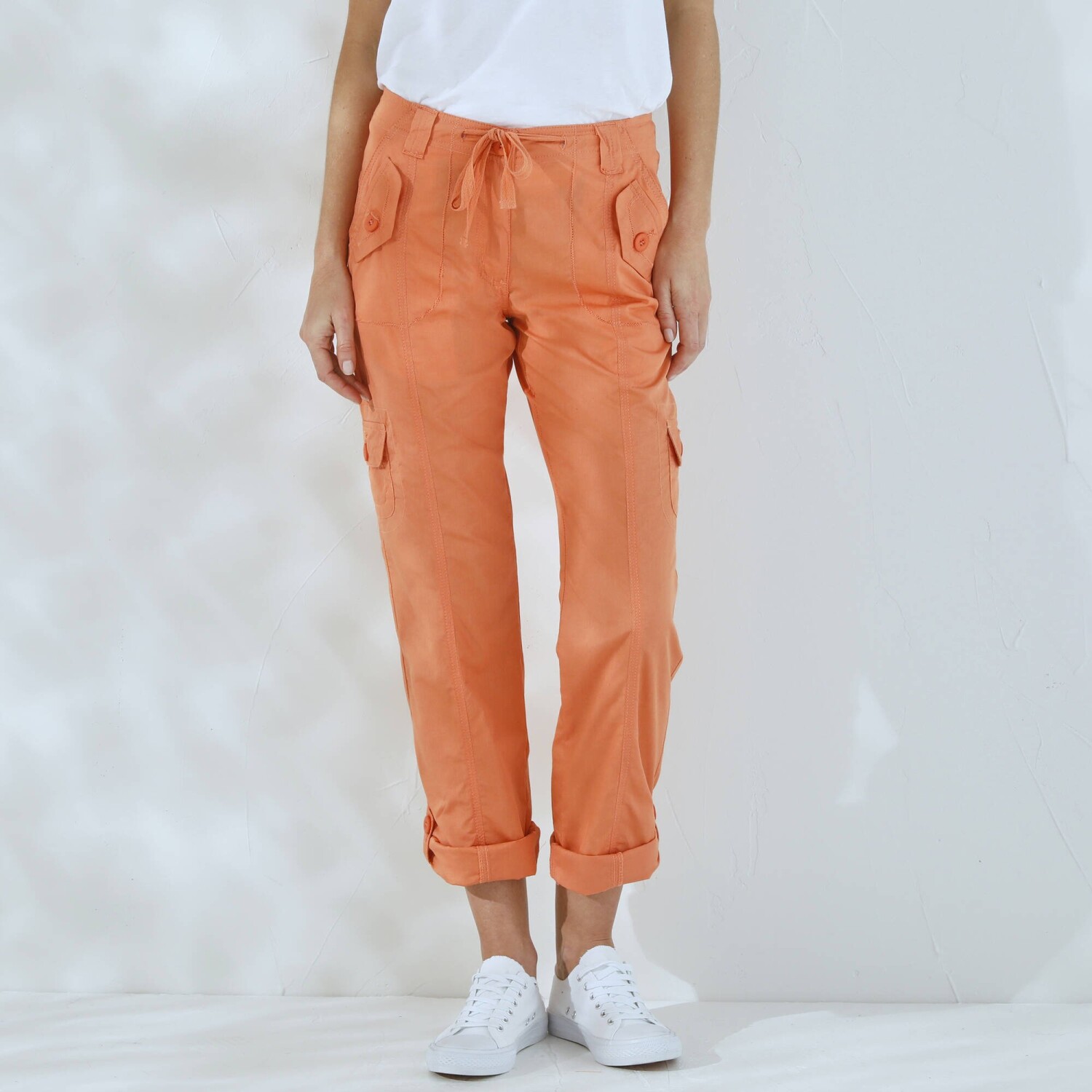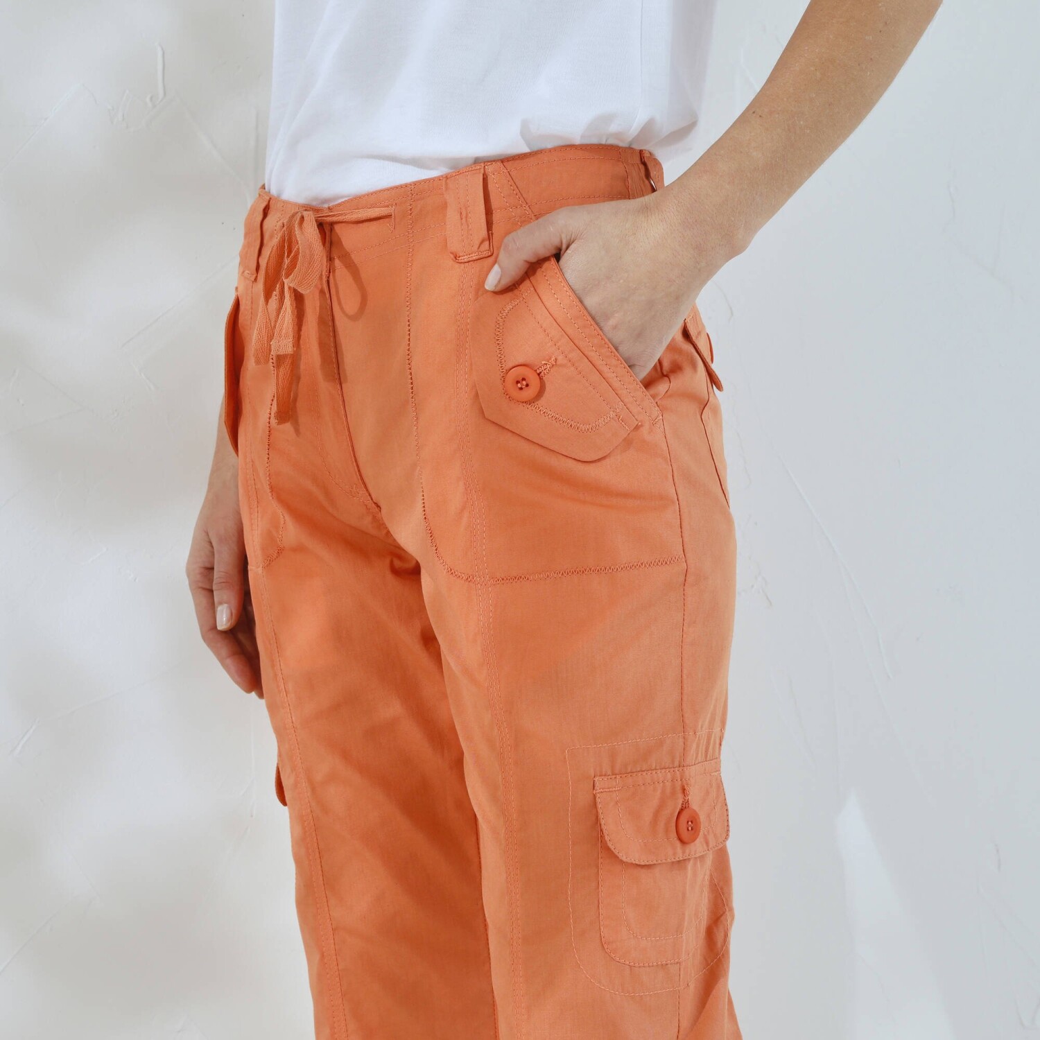 Módní kalhoty s kapsami perfektně doplní tričko i svetr. Běžná výška pasu. V pase poutka a šňůrka na zavázání. Zapínání na zip a knoflík. Vpředu 2 originální kapsy s knoflíkovou klopou. 2 postranní našité kapsy s knoflíkovou klopou. Vzadu 2 našité kapsy. Kontrastní prošití vpředu a vzadu. Vzadu zvýšený díl. Na ohrnutí pomocí knoflíkové patky. Standard 100 podle Oeko-Tex (n° CQ 1216 / 3 IFTH). Tato známka označuje textilní výrobky, které byly podrobeny laboratorním testům na široké spektrum škodlivých látek a výrobek je bezpečný nad rámec platných norem. Perte na 30 °C.