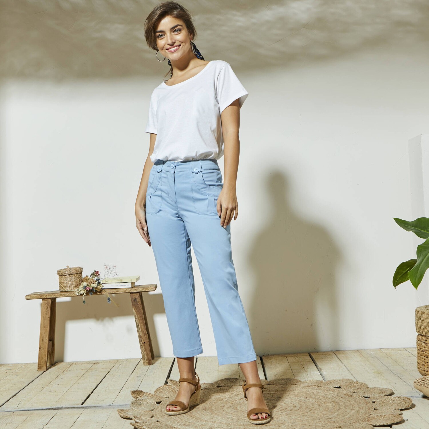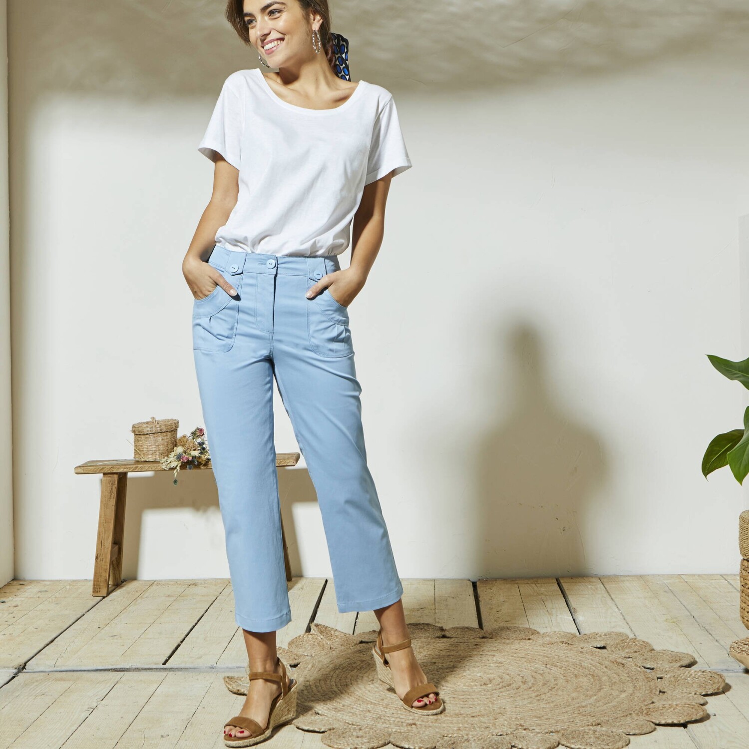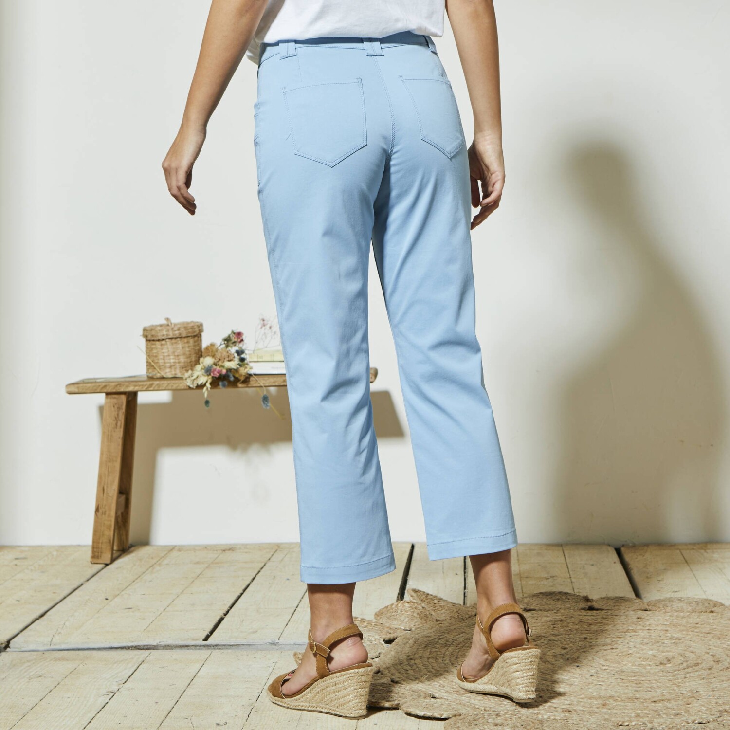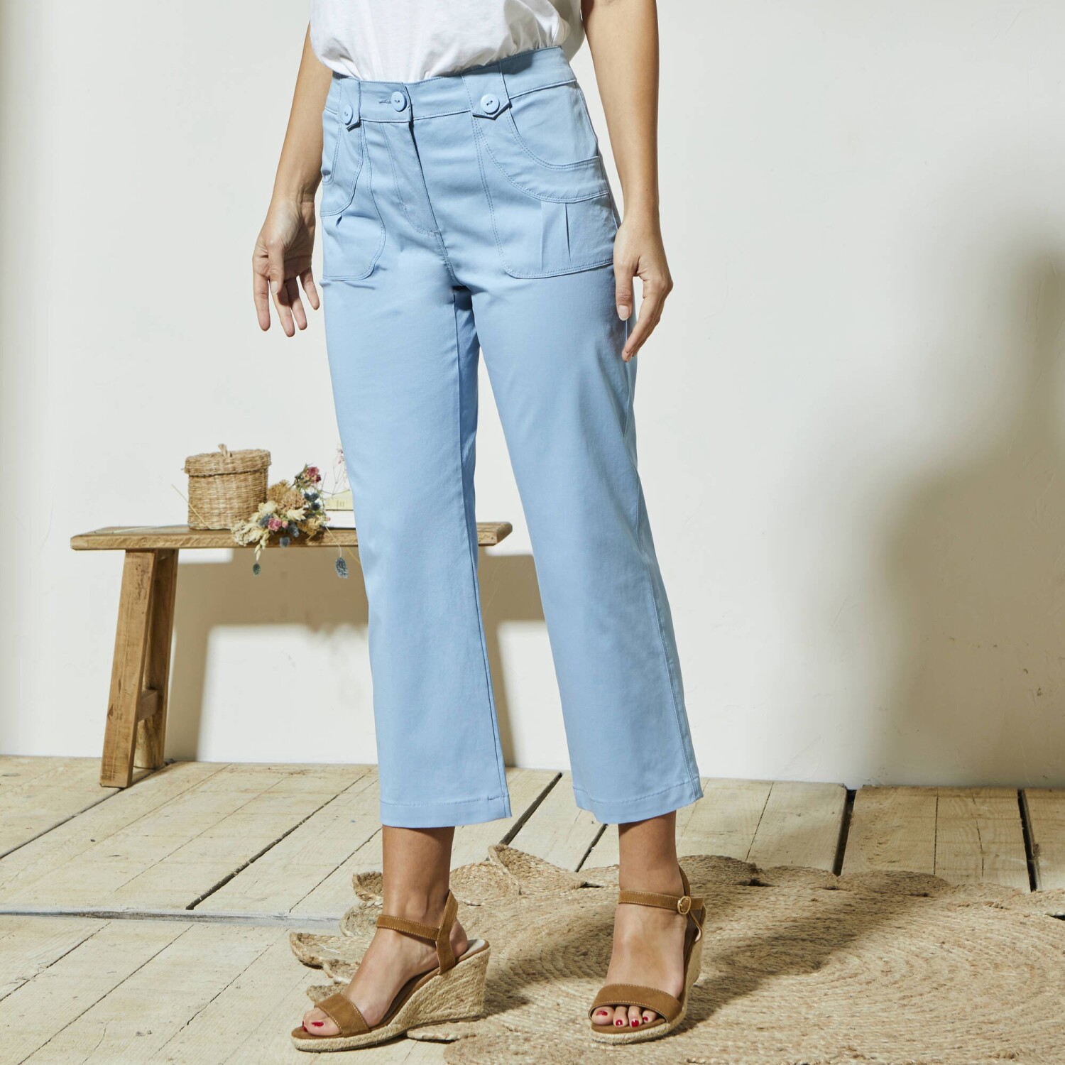 Módní 7/8 kalhoty se snadno kombinují a příjemně nosí. Rovný střih. Tvarovaný pas, od vel. 44 vzadu navolněn do gumy pro ještě lepší pohodlí. Zapínání na zip a knoflík. Poutka, z toho 2 vpředu na knoflík. Vzadu 2 záševky. Strečová komfortní tkanina. Standard 100 podle Oeko-Tex (n° CQ 1216 / 3 IFTH). Tato známka označuje textilní výrobky, které byly podrobeny laboratorním testům na široké spektrum škodlivých látek a výrobek je bezpečný nad rámec platných norem. Lze prát v pračce.