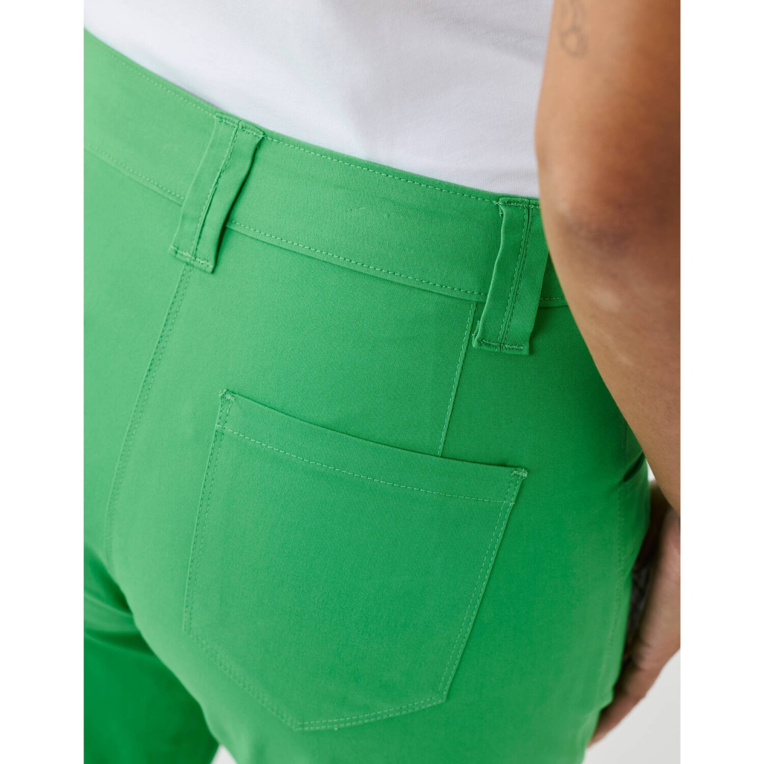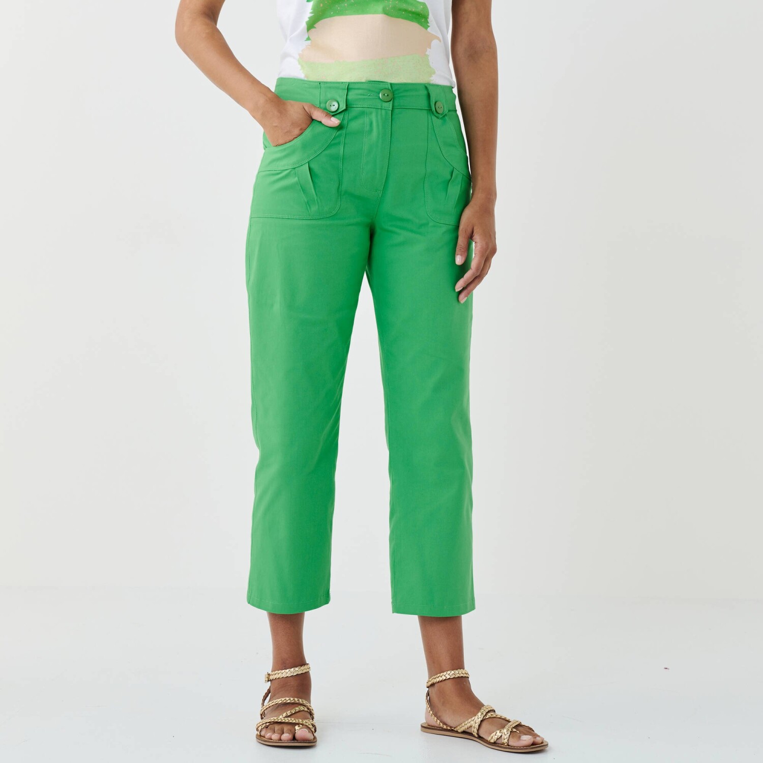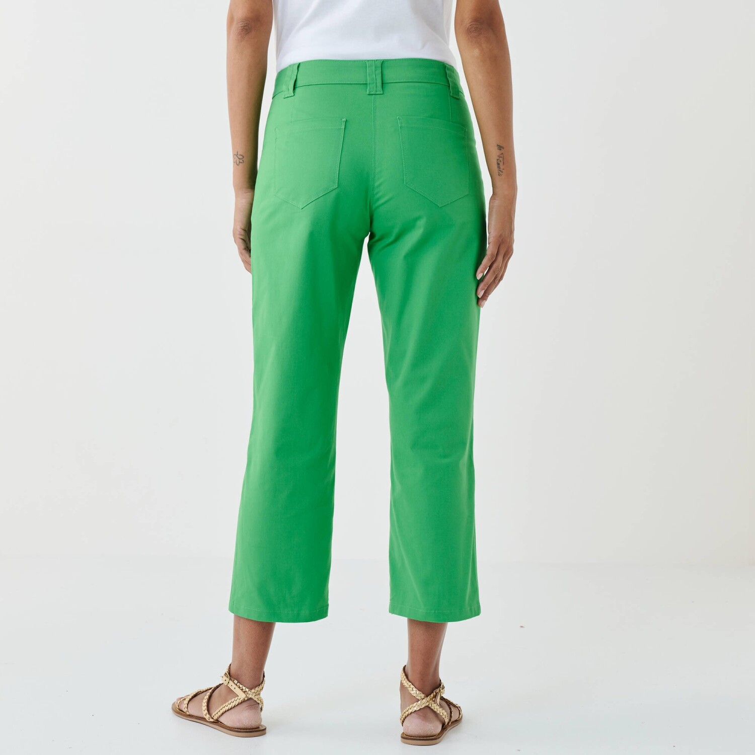 Módní 7/8 kalhoty se snadno kombinují a příjemně nosí. Rovný střih. Tvarovaný pas, od vel. 44 vzadu navolněn do gumy pro ještě lepší pohodlí. Zapínání na zip a knoflík. Poutka, z toho 2 vpředu na knoflík. Vzadu 2 záševky. Strečová komfortní tkanina. Standard 100 podle Oeko-Tex (n° CQ 1216 / 3 IFTH). Tato známka označuje textilní výrobky, které byly podrobeny laboratorním testům na široké spektrum škodlivých látek a výrobek je bezpečný nad rámec platných norem. Lze prát v pračce.
