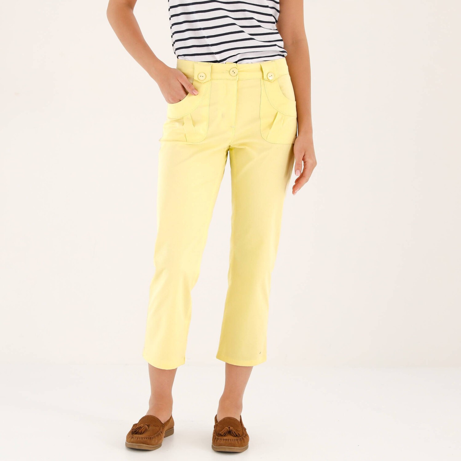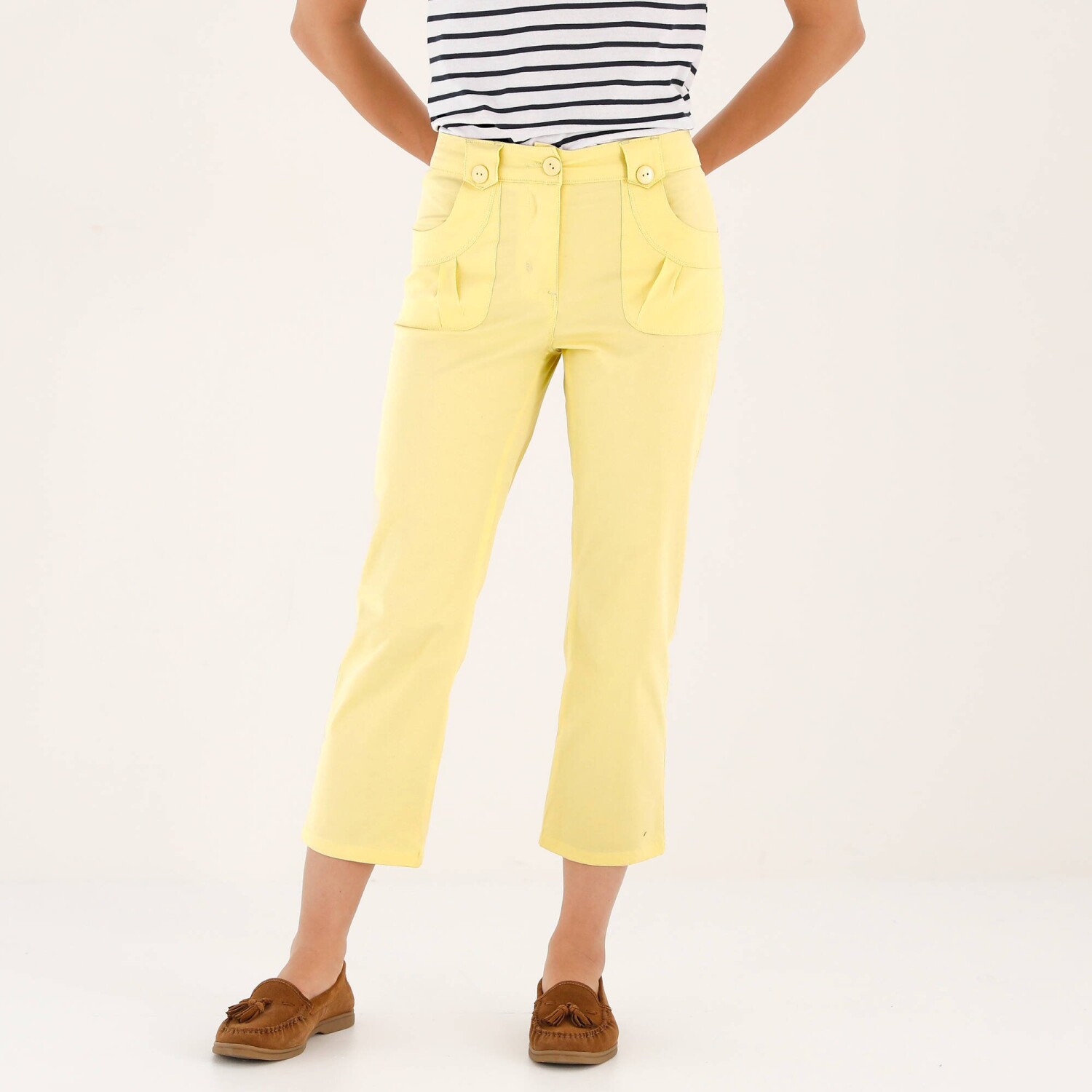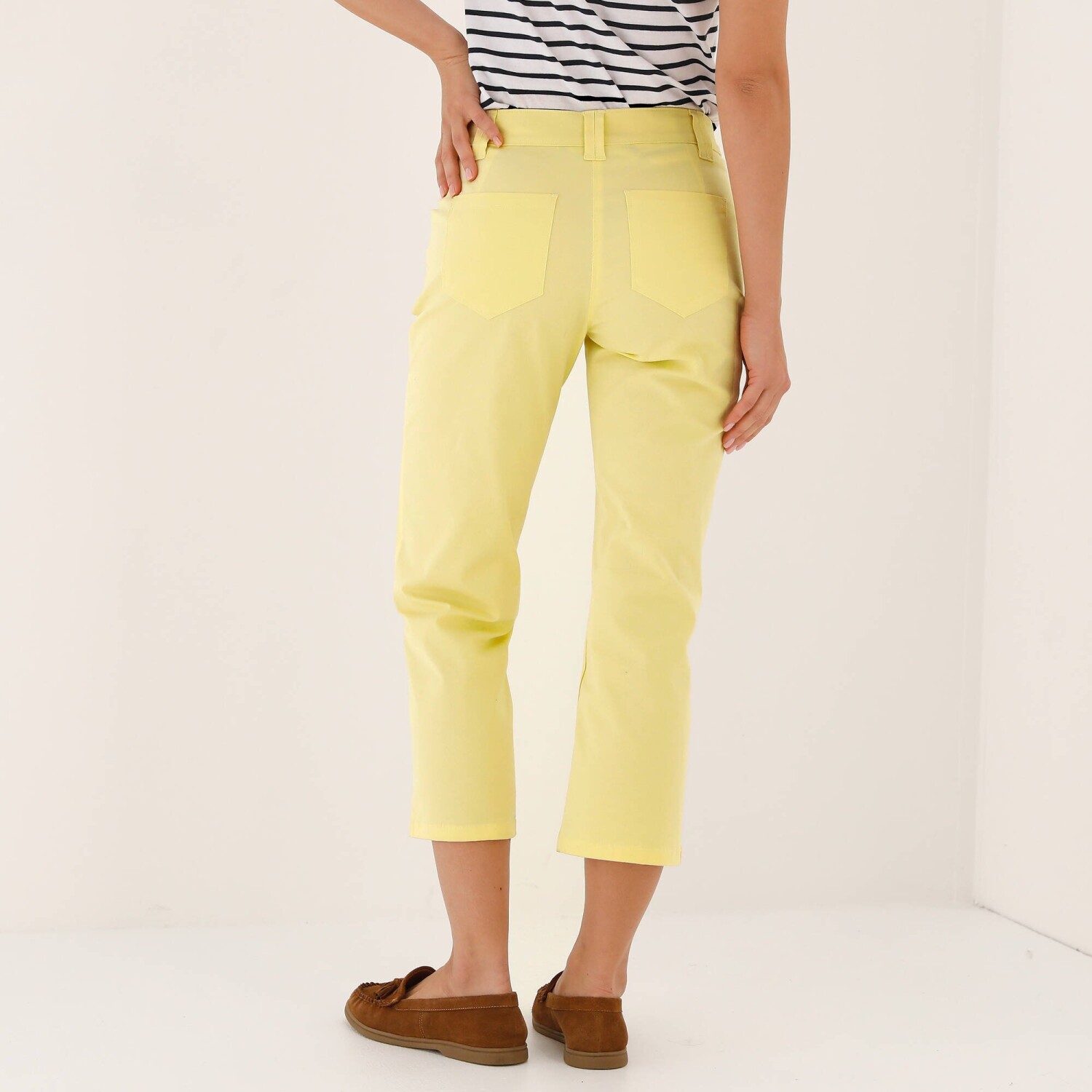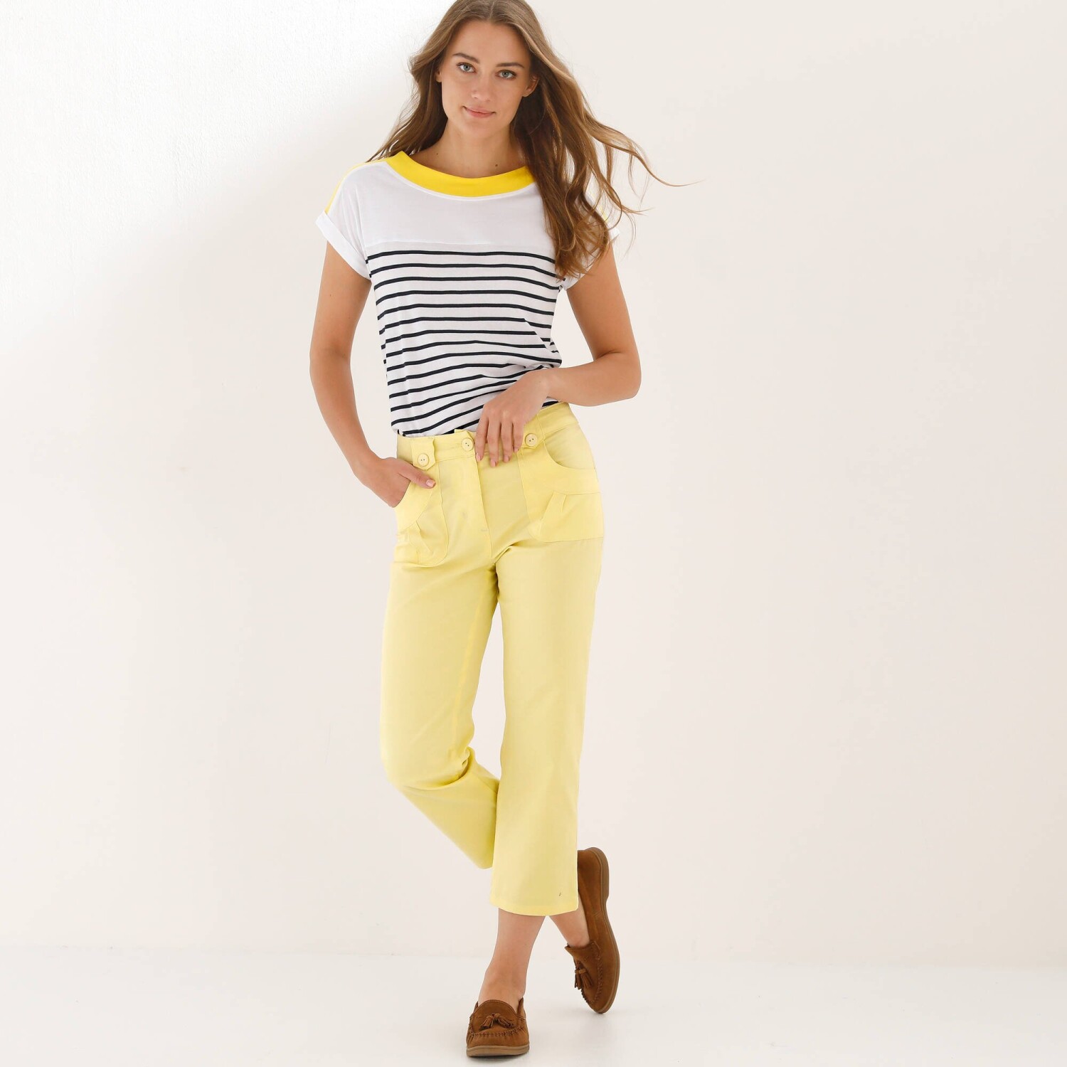 Módní 7/8 kalhoty se snadno kombinují a příjemně nosí. Rovný střih. Tvarovaný pas, od vel. 44 vzadu navolněn do gumy pro ještě lepší pohodlí. Zapínání na zip a knoflík. Poutka, z toho 2 vpředu na knoflík. Vzadu 2 záševky. Strečová komfortní tkanina. Standard 100 podle Oeko-Tex (n° CQ 1216 / 3 IFTH). Tato známka označuje textilní výrobky, které byly podrobeny laboratorním testům na široké spektrum škodlivých látek a výrobek je bezpečný nad rámec platných norem. Lze prát v pračce.