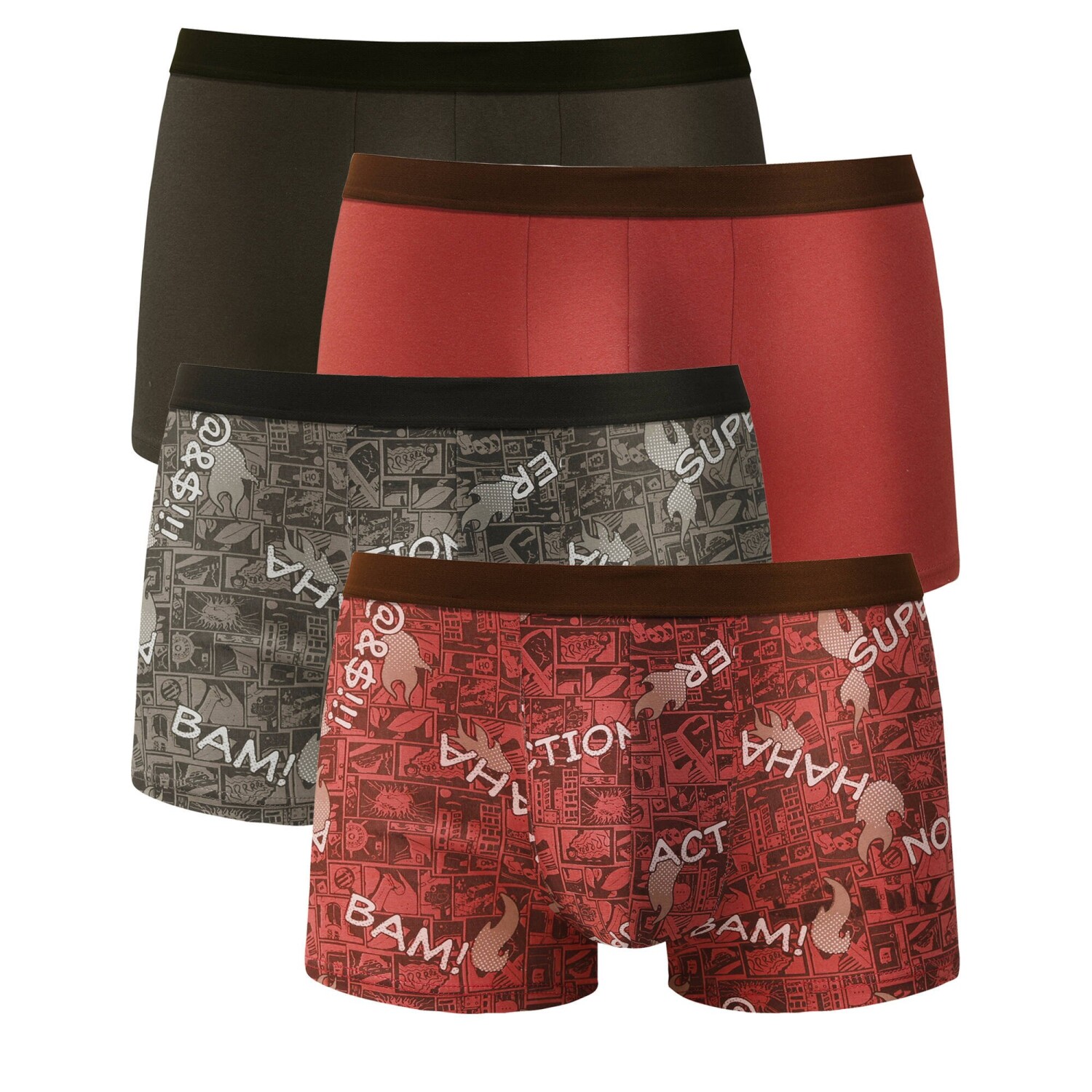 2 modely s potiskem + 2 jednobarevné! Stylové boxerky se pohodlně nosí. Ze strečového úpletu. Široký, pružný, výrazný pas. Středový šev, členitý střih předního dílu. Podšívka předního dílu. Sada 4 sladěných kusů: 2 jednobarevné + 2 s potiskem. Standard 100 podle Oeko-Tex (n° CQ 1216 / 3 IFTH). Tato známka označuje textilní výrobky, které byly podrobeny laboratorním testům na široké spektrum škodlivých látek a výrobek je bezpečný nad rámec platných norem. Lze prát v pračce.