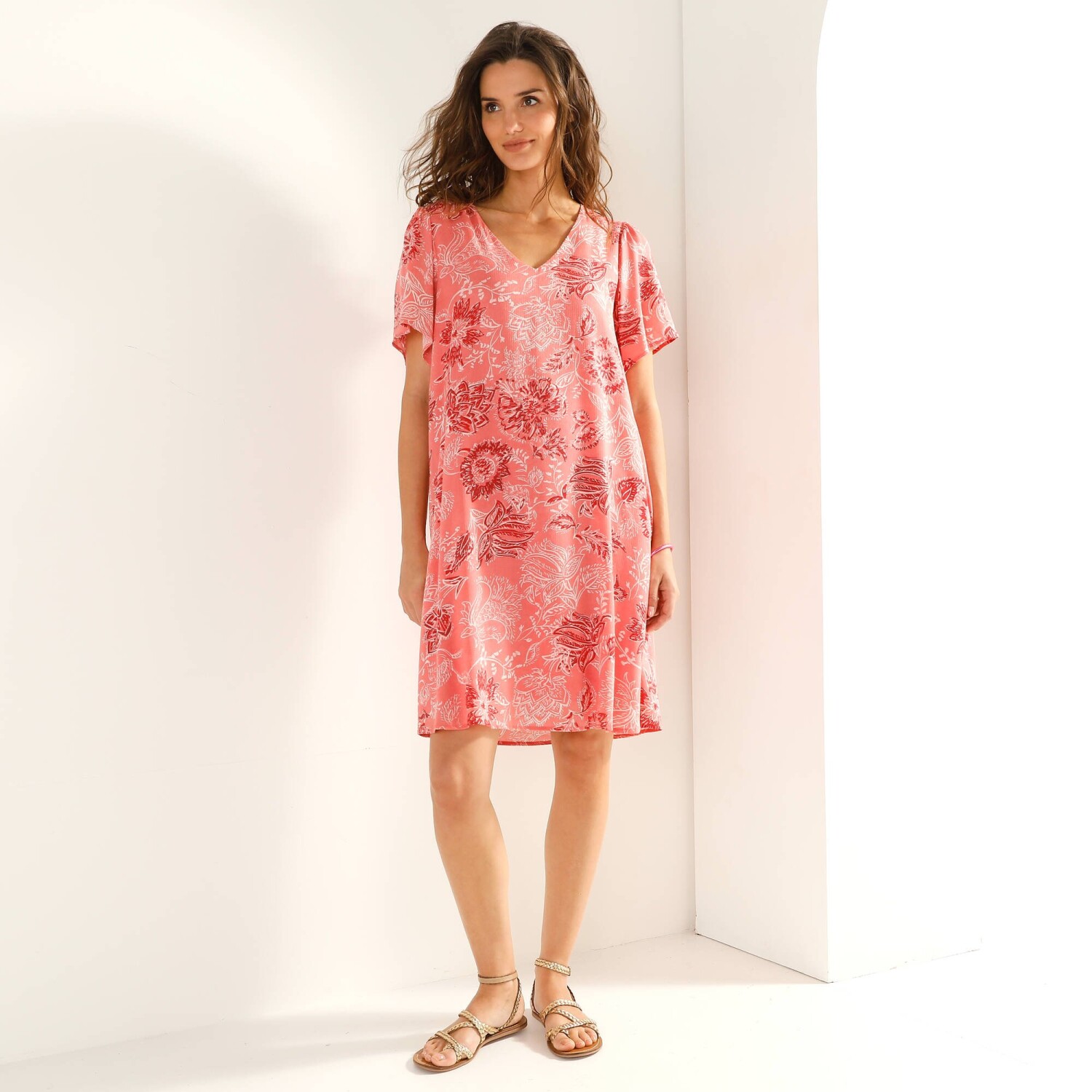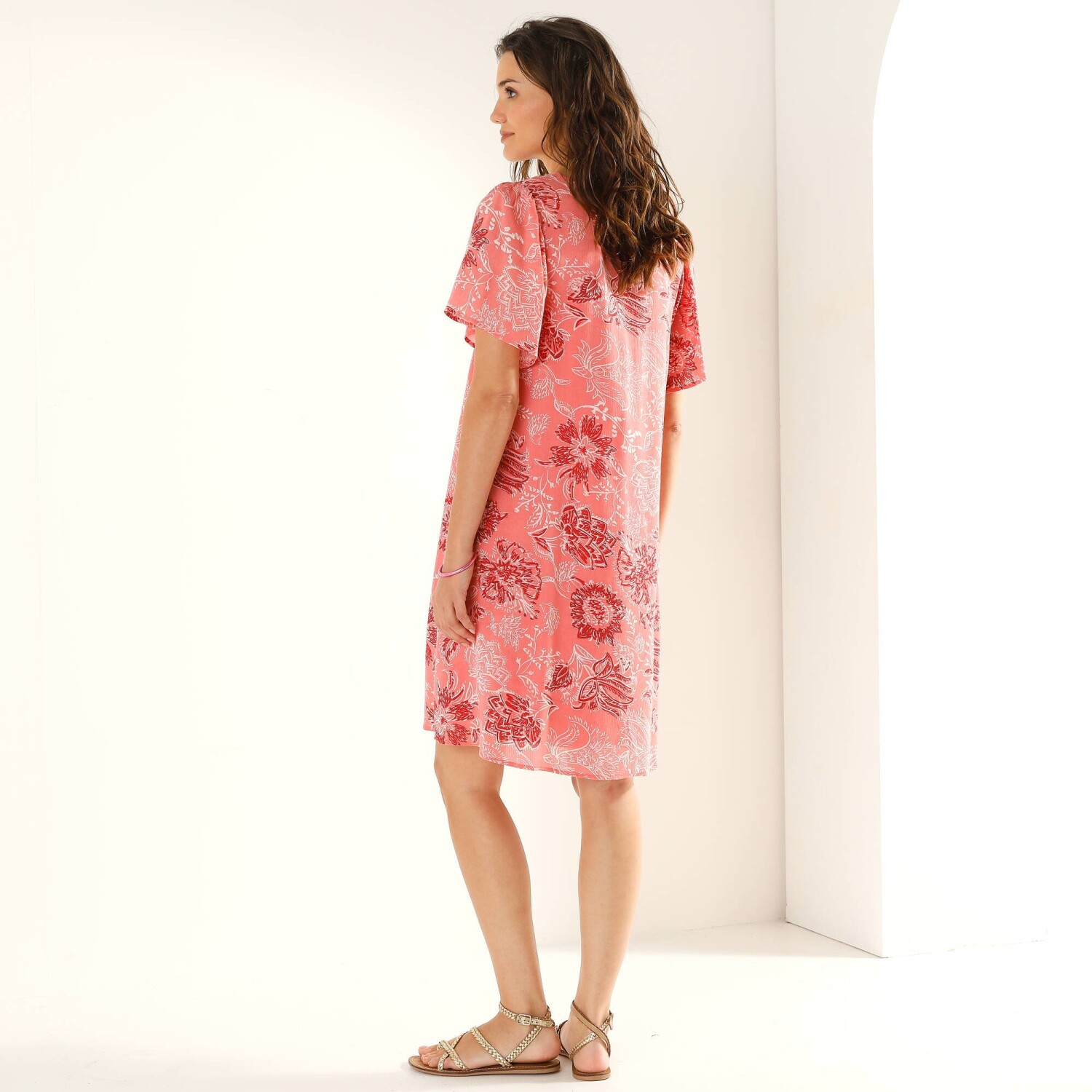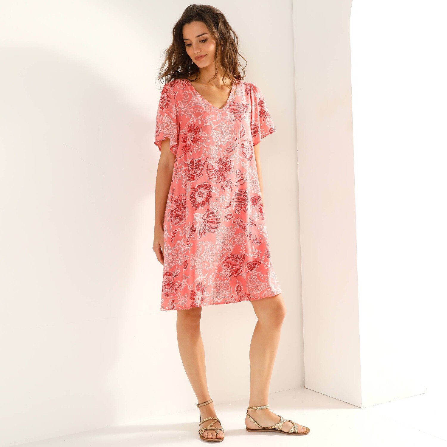 Šaty s potiskem a výstřihem do V přilákají pohledy Vašeho okolí. Volný střih lichotí postavě. Hluboký ženský výstřih. Krátké volánové rukávy. V ramenou nařasení. Lze prát v pračce.