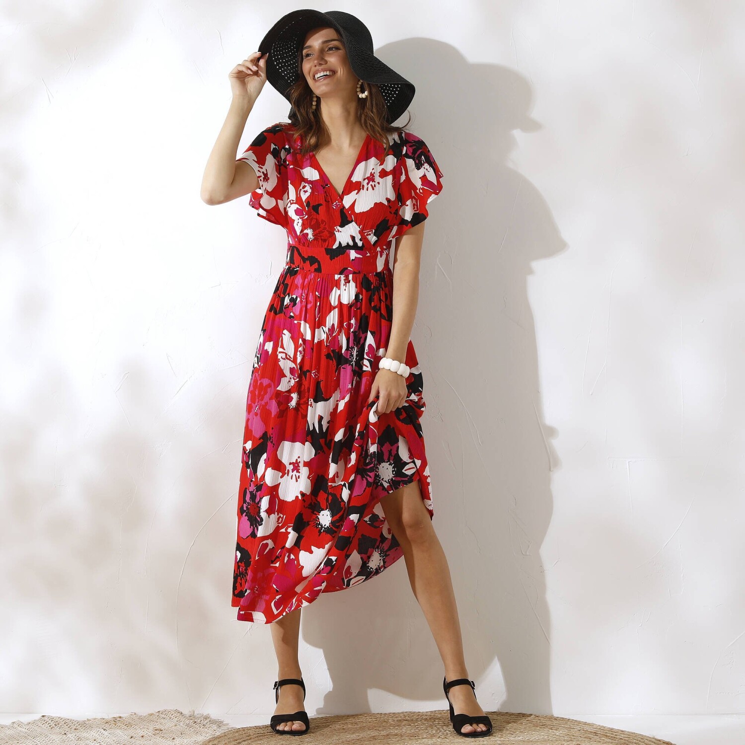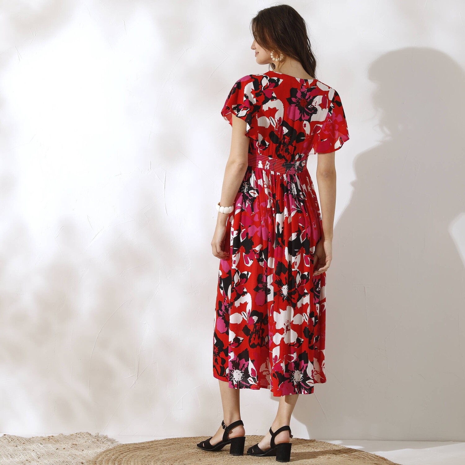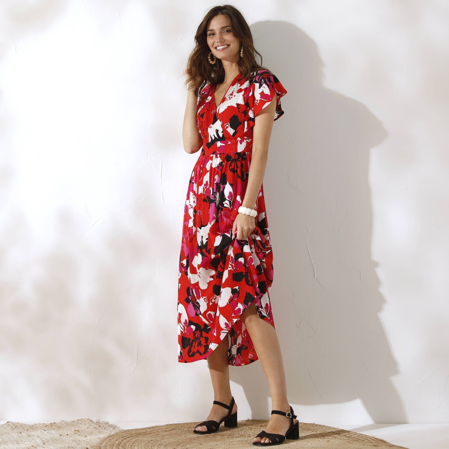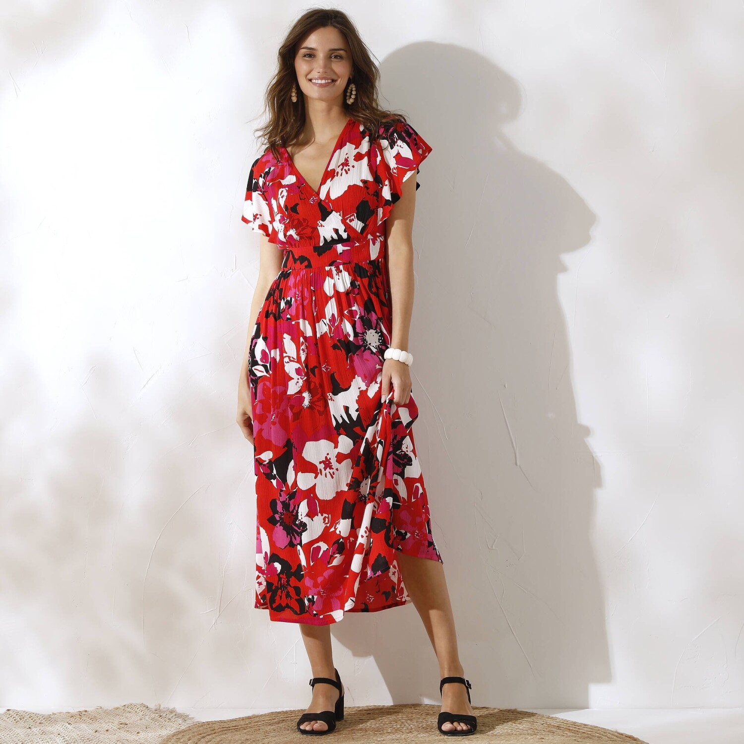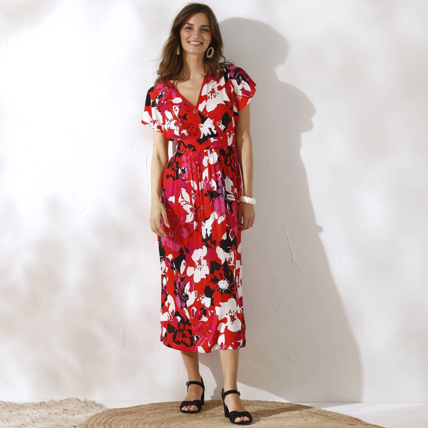 Dlouhé šaty s barevným potiskem, překříženým výstřihem a ženskými detaily nemají konkurenci. Výstřih do "V" s efektem překřížení. Široké průramky. Volánové rukávy s rozparky. Nařasení pod vsadkou v pase vpředu. Vzadu žabičkovaný pas. Rozšířený spodní lem. Lze prát v pračce.
