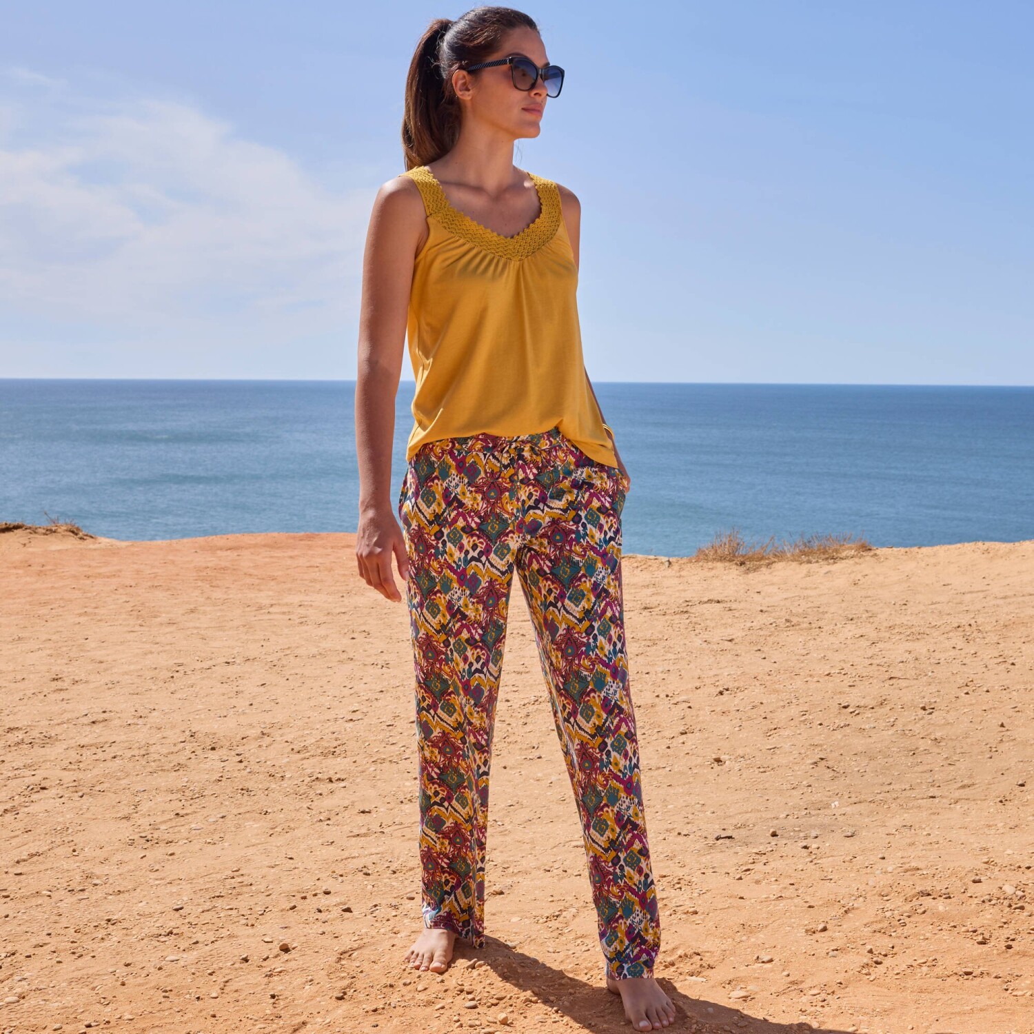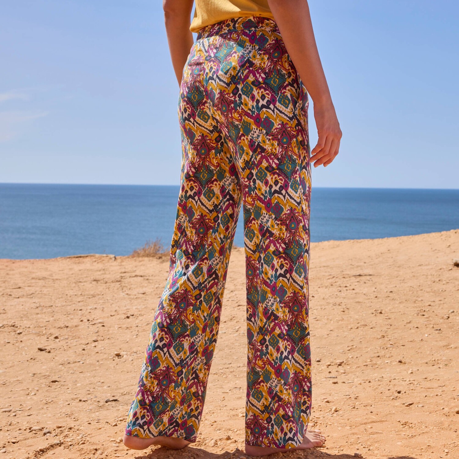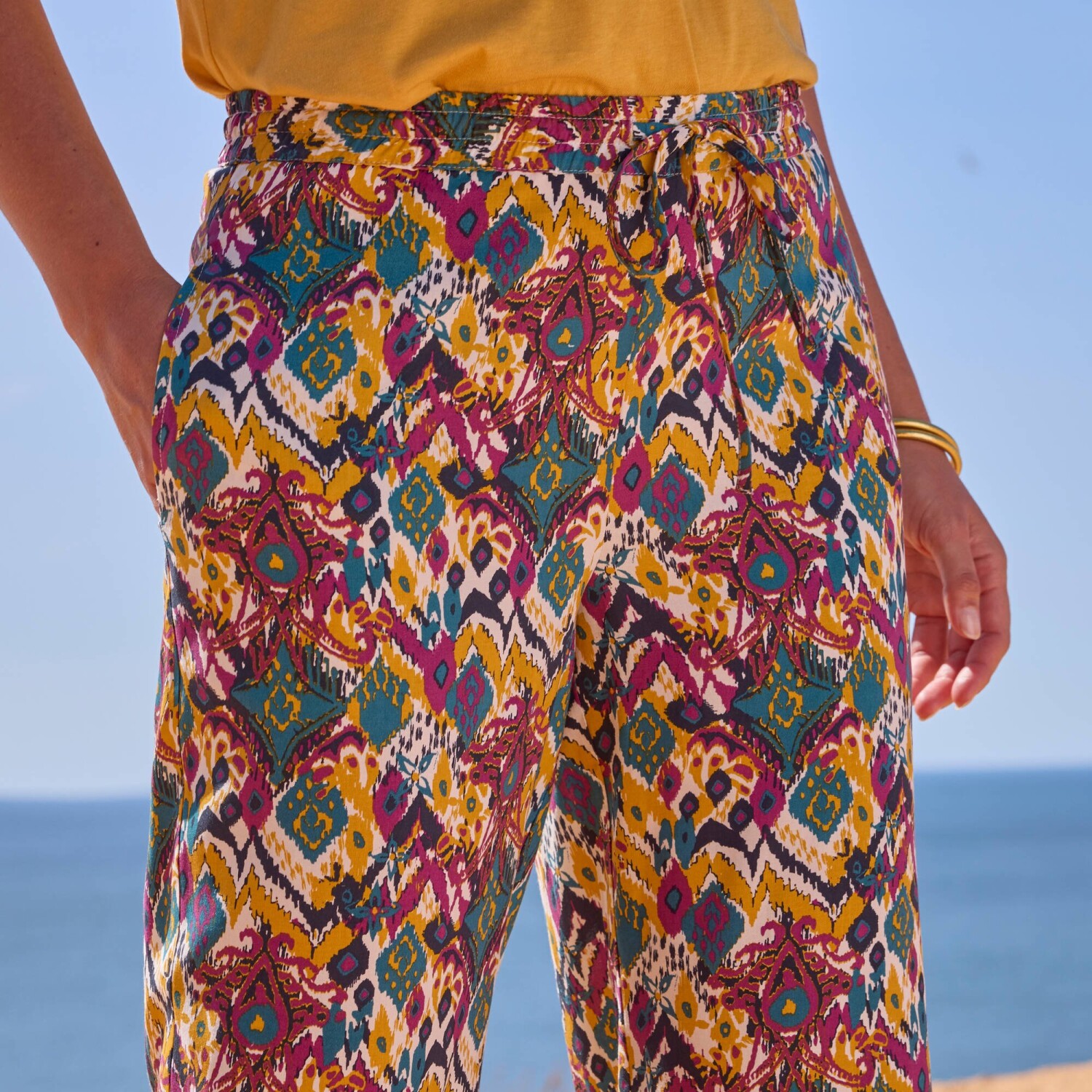 Vzdušné barevné kalhoty oceníte na pláž i do města, vždy budou skvělé. Běžná výška pasu. Široký střih. Pružný pas. V pase šňůrka na zavázání. 2 kapsy v bočních švech. Tento produkt byl vyroben z viskózy Lenzing EcoVero. Ekologická viskóza je materiál vyrobený z buničiny z udržitelně obhospodařovaných lesů. Výrobní proces vyžaduje méně vody a energie. Lze prát v pračce.