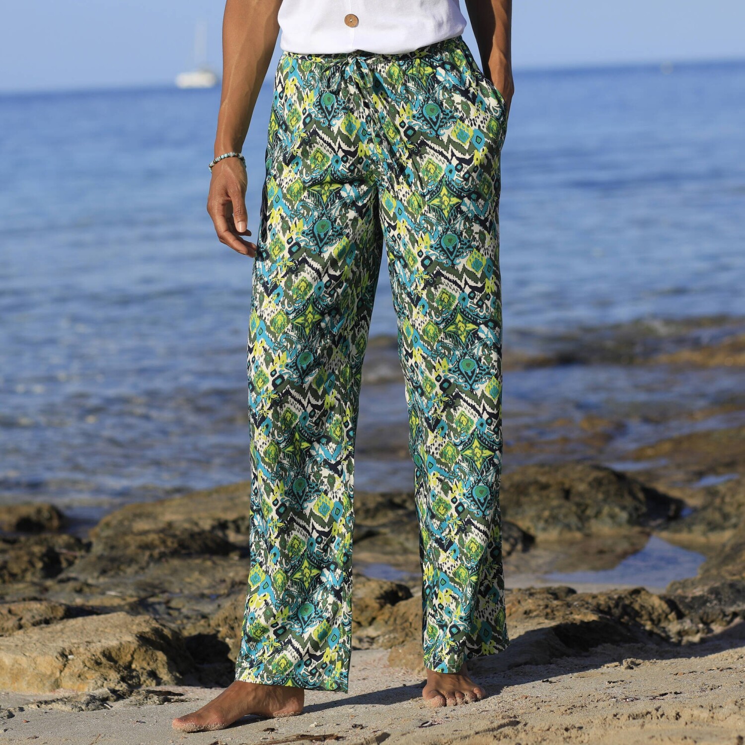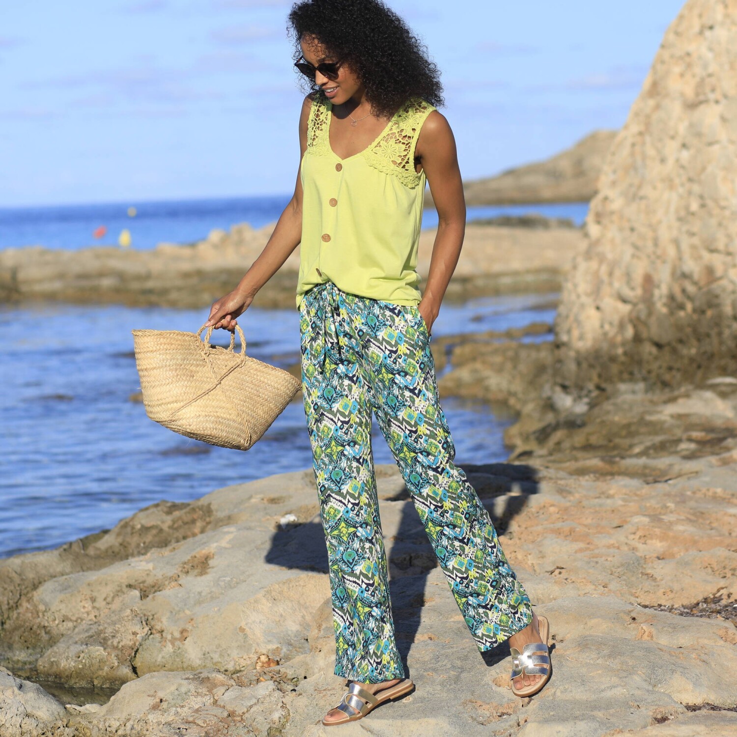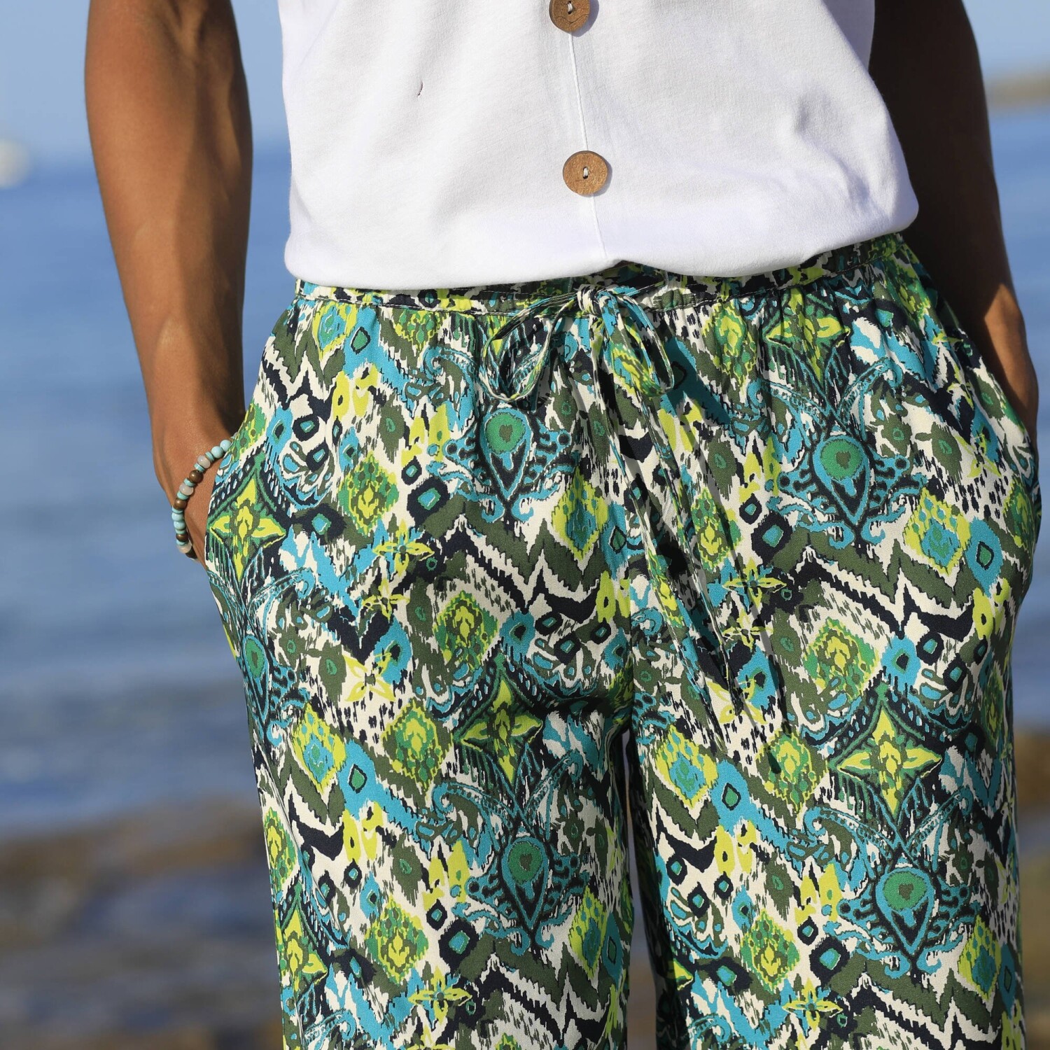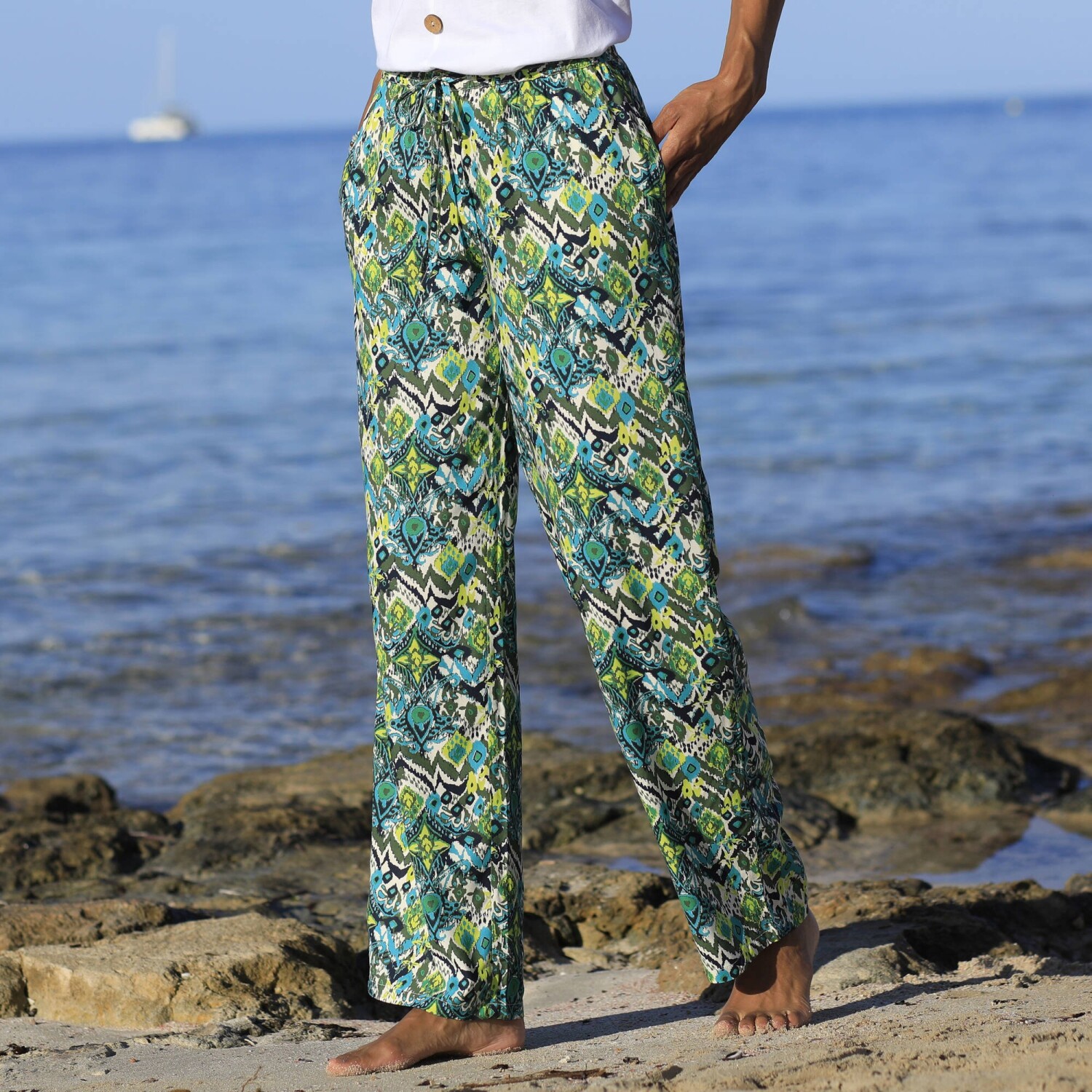 Vzdušné barevné kalhoty oceníte na pláž i do města, vždy budou skvělé. Běžná výška pasu. Široký střih. Pružný pas. V pase šňůrka na zavázání. 2 kapsy v bočních švech. Tento produkt byl vyroben z viskózy Lenzing EcoVero. Ekologická viskóza je materiál vyrobený z buničiny z udržitelně obhospodařovaných lesů. Výrobní proces vyžaduje méně vody a energie. Lze prát v pračce.